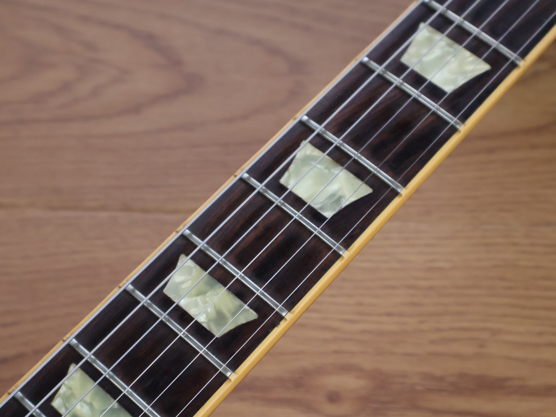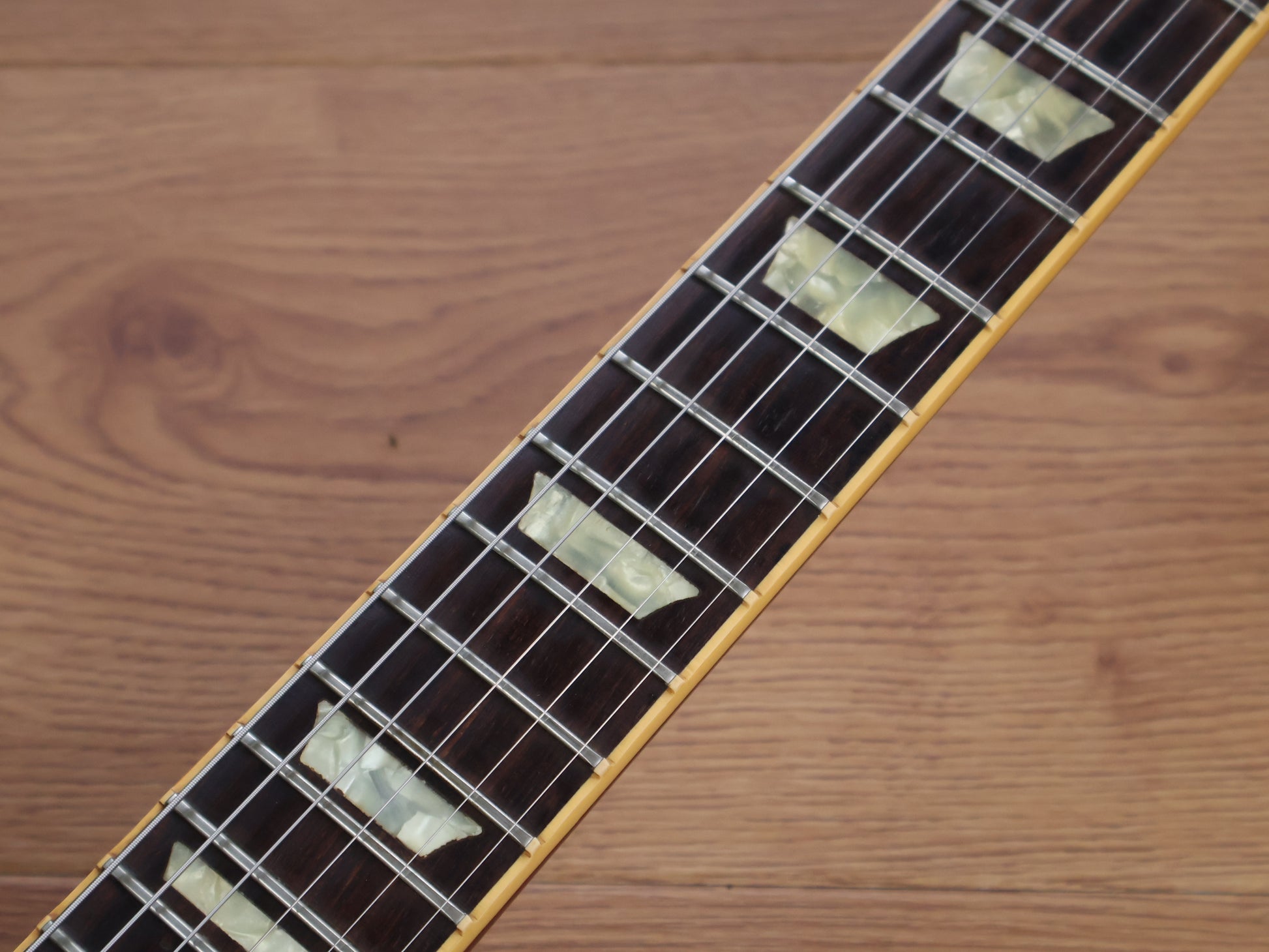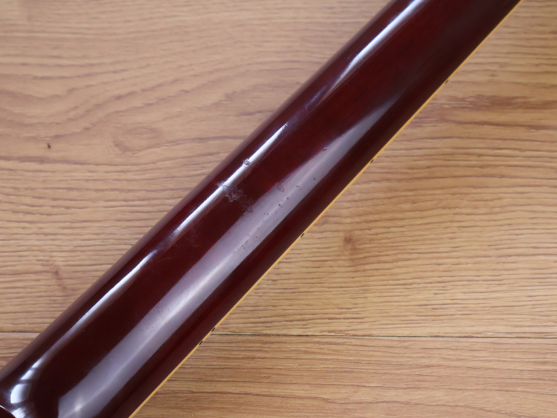 One authentic replacement tuner and seemingly an aftermarket bridge as pictured, this one's in good used condition for it's age with some signs of wear but no breaks or repairs. The frets are shiny and smooth and the neck is straight with a fully functional truss rod. Missing the truss rod cover.