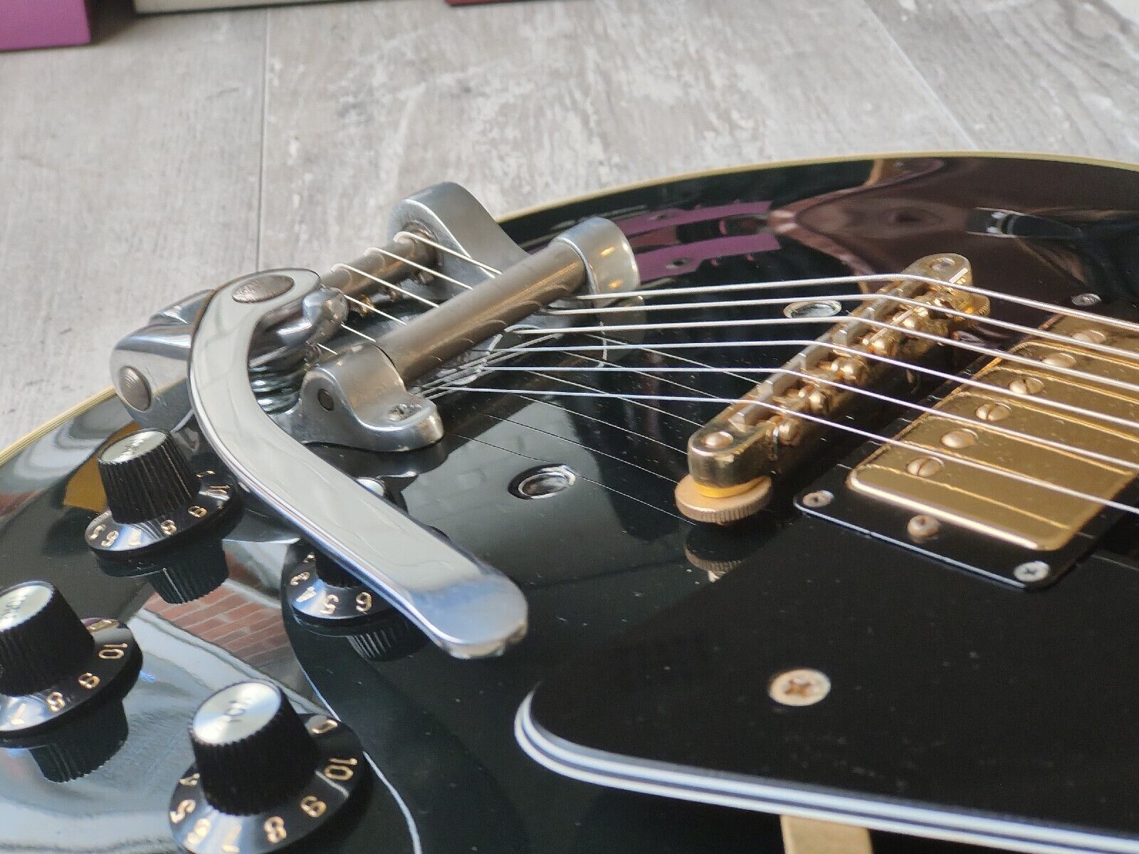 Made in Japan by the Fujigen factory in 1990, this is the only Greco Les Paul Custom model we've ever had come through the store that features a slim soft V neck profile! Solid mahogany body with a maple cap, mahogany neck and a rosewood fingerboard, weighs 4.5kg's. Modified by the previous owner to incorporate a Bigsby vibrato system, it appears otherwise all original except for a new output jack.