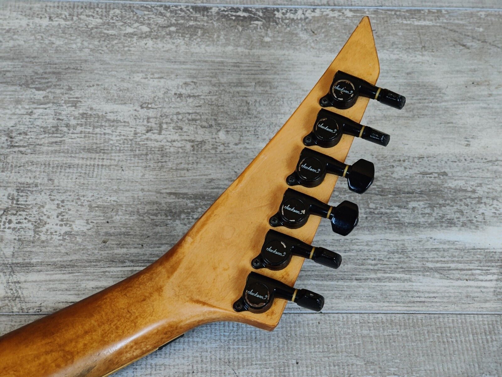 A simple Japanese made shredder from 1990, this Grover Jackson branded Dinky was built with a mahogany body, slim maple neck (that's been played to a satin smooth feel) and a bound 24 fret rosewood fingerboard, it weighs 3.3kg's. Loaded with three aftermarket pickups (seemingly a Carvin rail humbucker in the bridge and unknown pickups in the bridge and middle position) along with the original Jackson branded tuners and locking tremolo system.