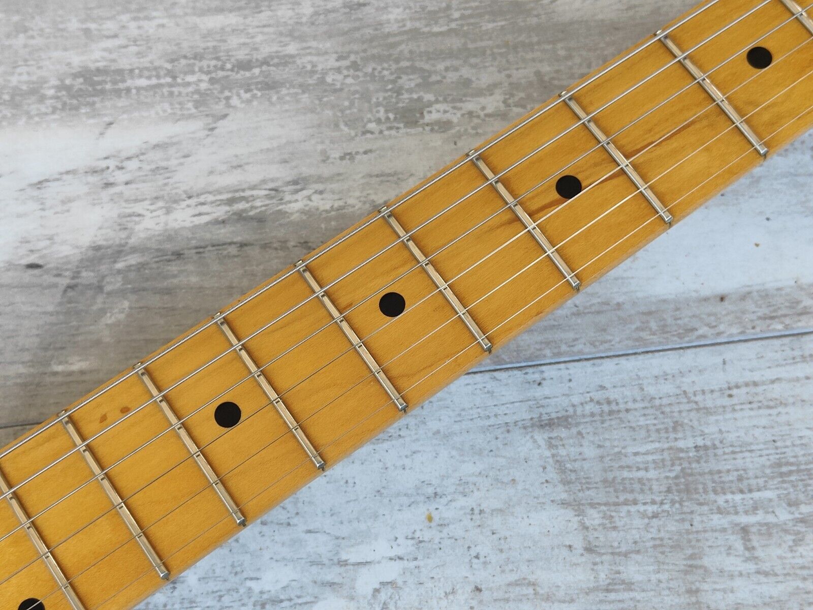 Released in the 1990's, the BR2M-70 features a gloss black finish full of what look to be pearloid silver sparkle flakes that let the guitar pop and shine if any light hits it. Basswood body with a maple neck and 22 fret fingerboard (648mm scale length), it weighs 3.3kg's. Loaded with VC-1/2/3 single coils controlled by a master volume/tone and an active mid-boost knob (9v battery compartment in the rear).