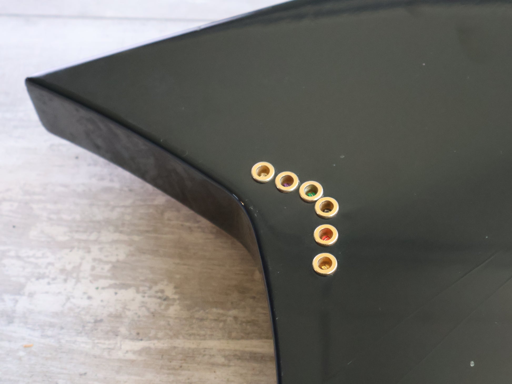 Reasonably clean condition for it's age (especially for a pointy guitar), with a few dings to the body and horns as pictured. It's got plenty of life in the shiny frets and a straight neck with a fully adjustable truss. A previous owner removed the original Charvel logo and installed a Jackson waterslide decal.