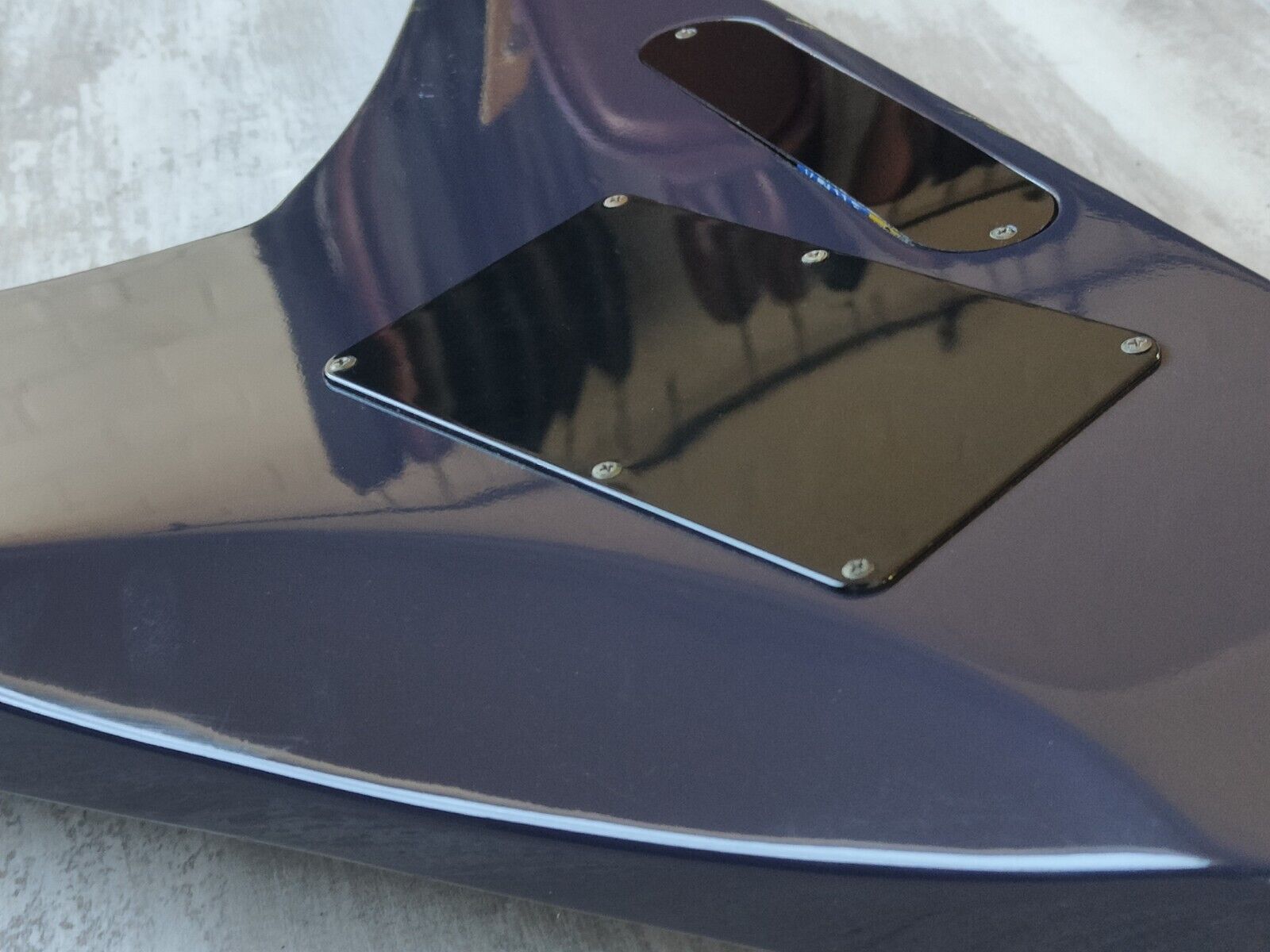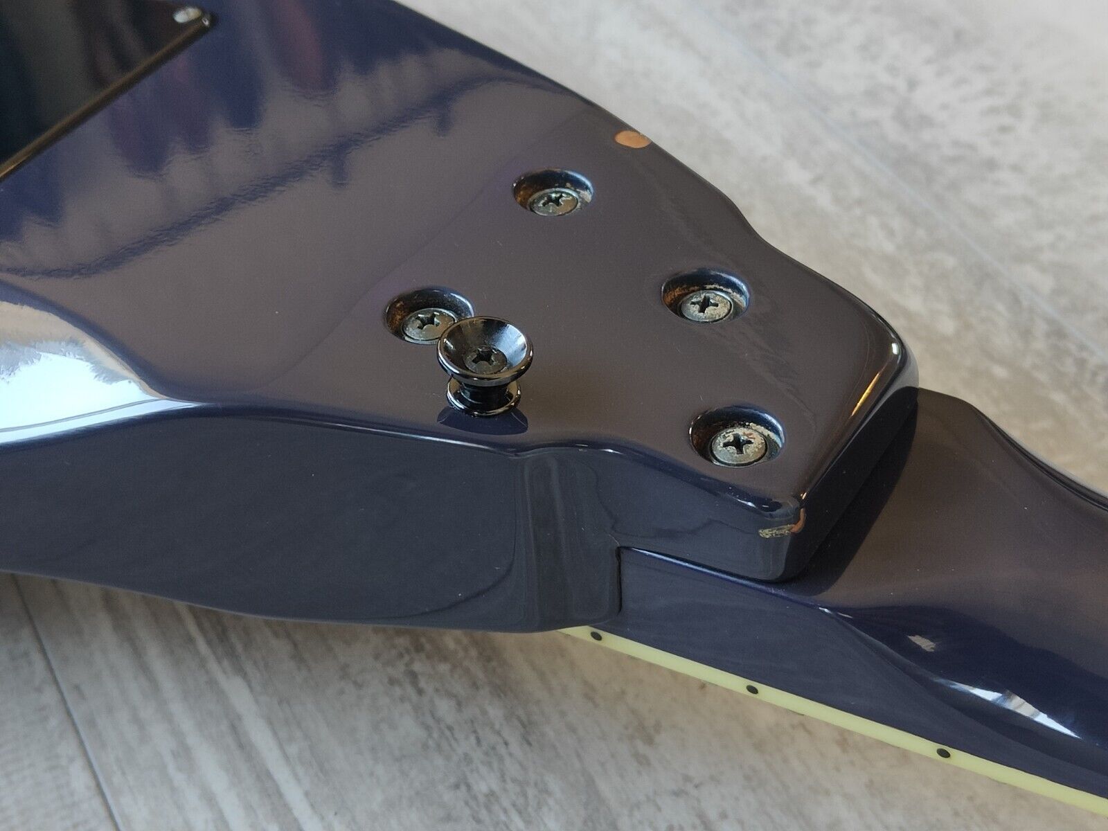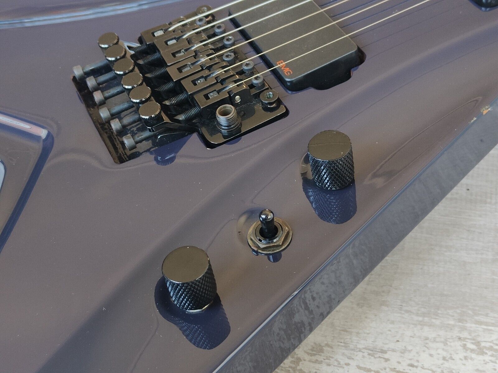Finished in a deep glossy purple finish, it's built with a carved "Flying V" body (alder) with a bolt-on maple neck/rosewood fingerboard. 648mm scale length with 22 frets, it features with a genuine Floyd Rose and Gotoh tuners. Loaded with a pair of EMG 89/81 humbuckers (three-way switch with two volume knobs), it's a fantastic sounding guitar for heavier genres. Weighs just under 3.5kg's.