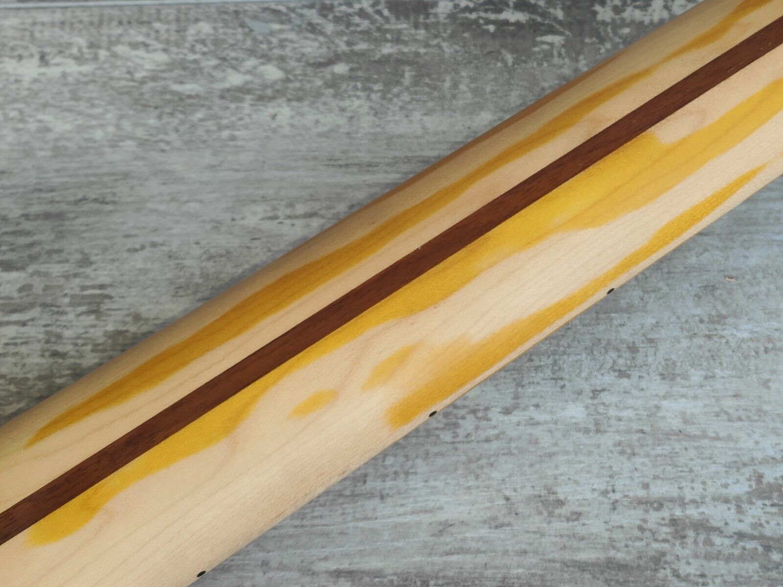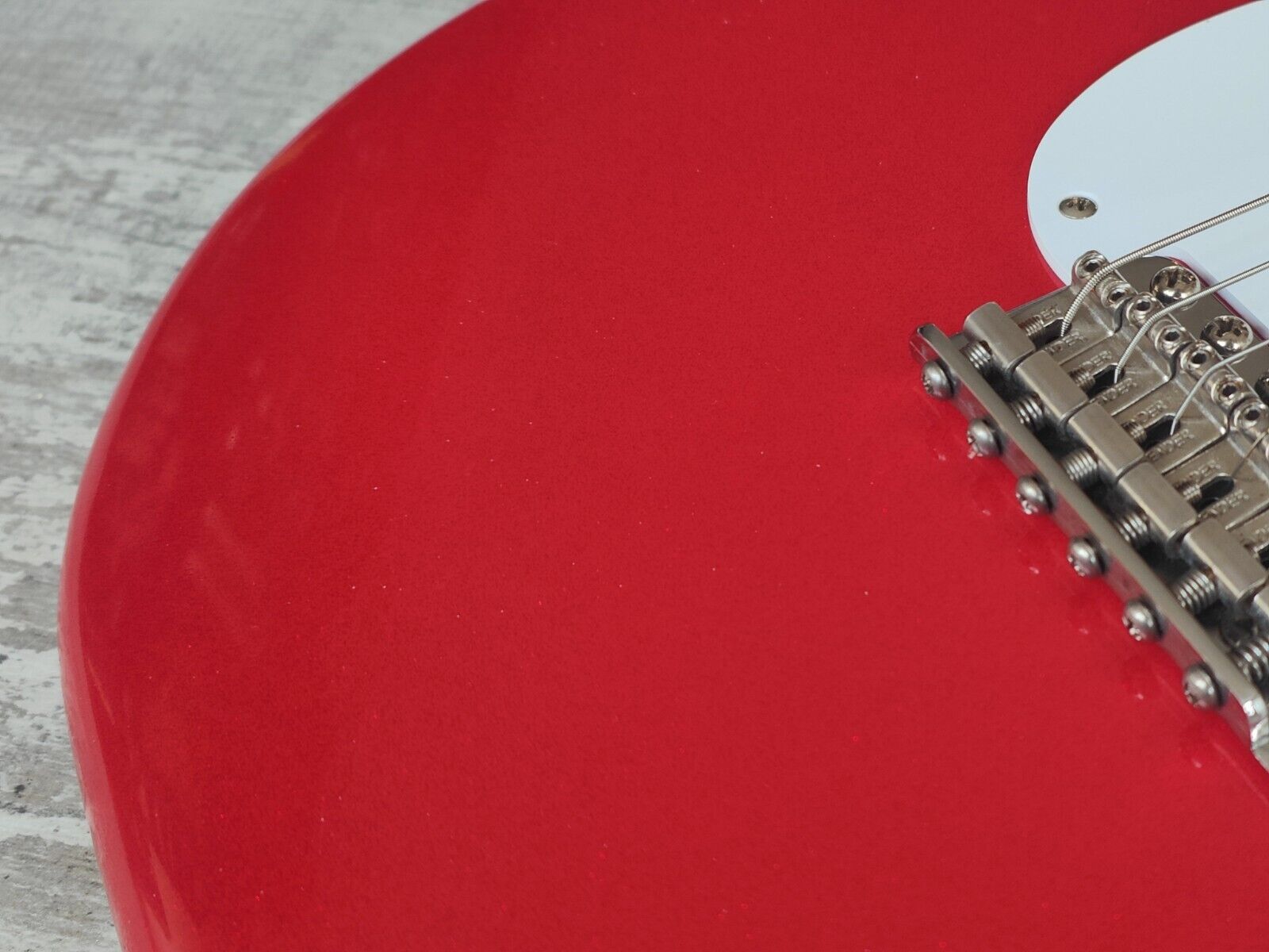 Sourced by us in very gross condition with a poor refinish attempt on the body and some sanding to the neck, had it fully disassembled and rebuilt from the ground up. We had it refinished in a sparkle "Fiesta Red" with a metallic flake that pops in the sunlight and had the neck sanded back to a satin smooth finish that feels uniform in the hand.