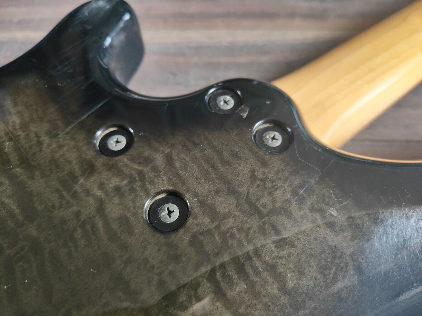 A compact and sleek Revolver series bass from Fernandes. Maple neck with a rosewood fingerboard (24 frets, 860mm scale length), it weighs 3.2kg's. Has a nice pair of passive PJ pickups, plays smooth with a straight neck and plenty of life in the frets, restrung and serviced prior to listing.