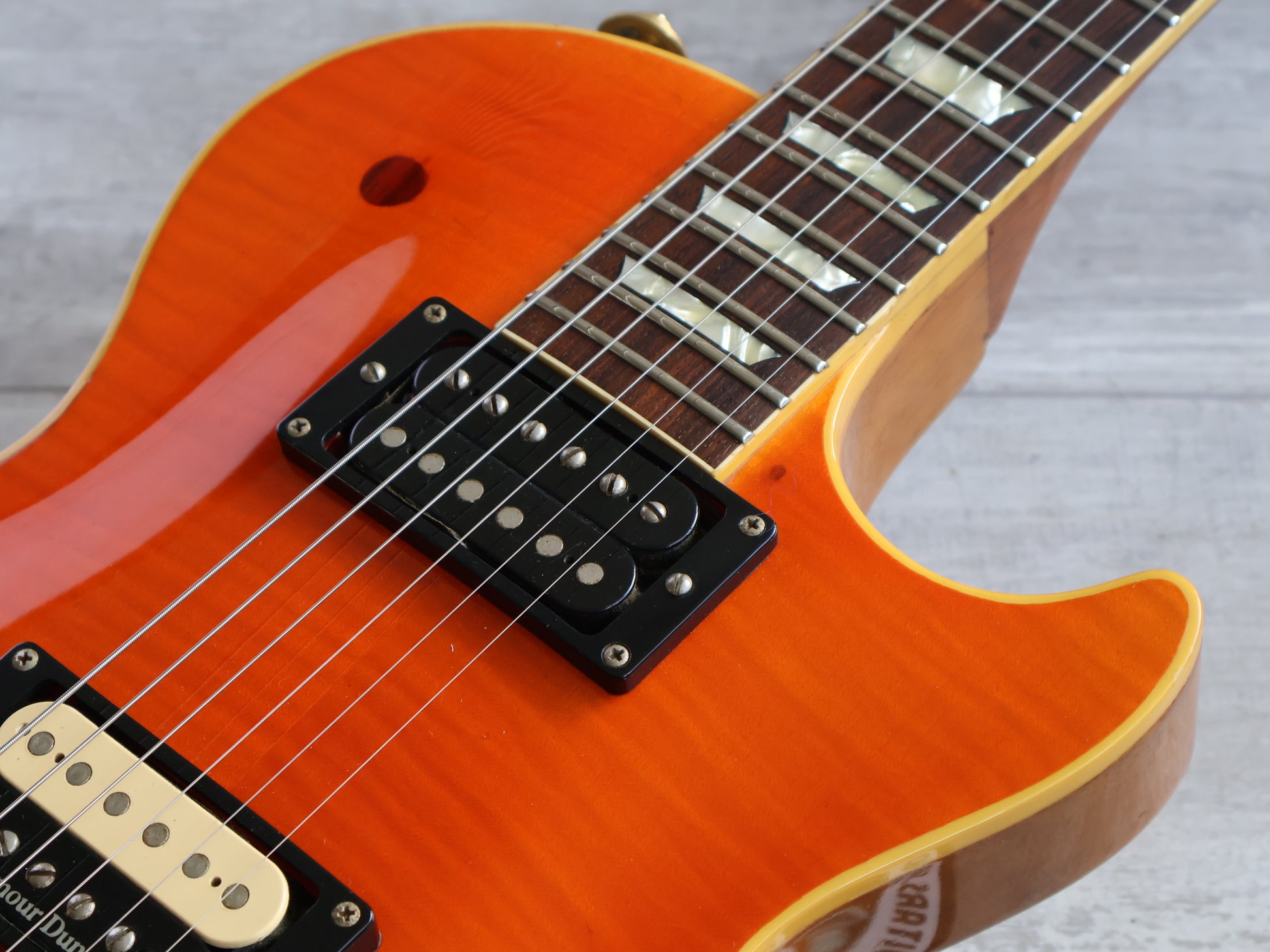 Made by the Fujigen factory in the late 80's or early 90's, this is a professionally modified Greco EG series Les Paul that someone made their own. Professionally refinished with a natural body with a transparent orange flamed maple top, mahogany neck with a 22 fret rosewood fingerboard, weighs 4.1kg's. This one has a generic humbucker in the neck position and a Seymour Duncan SH-5 in the bridge along with a professionally installed Bigsby tremolo system.