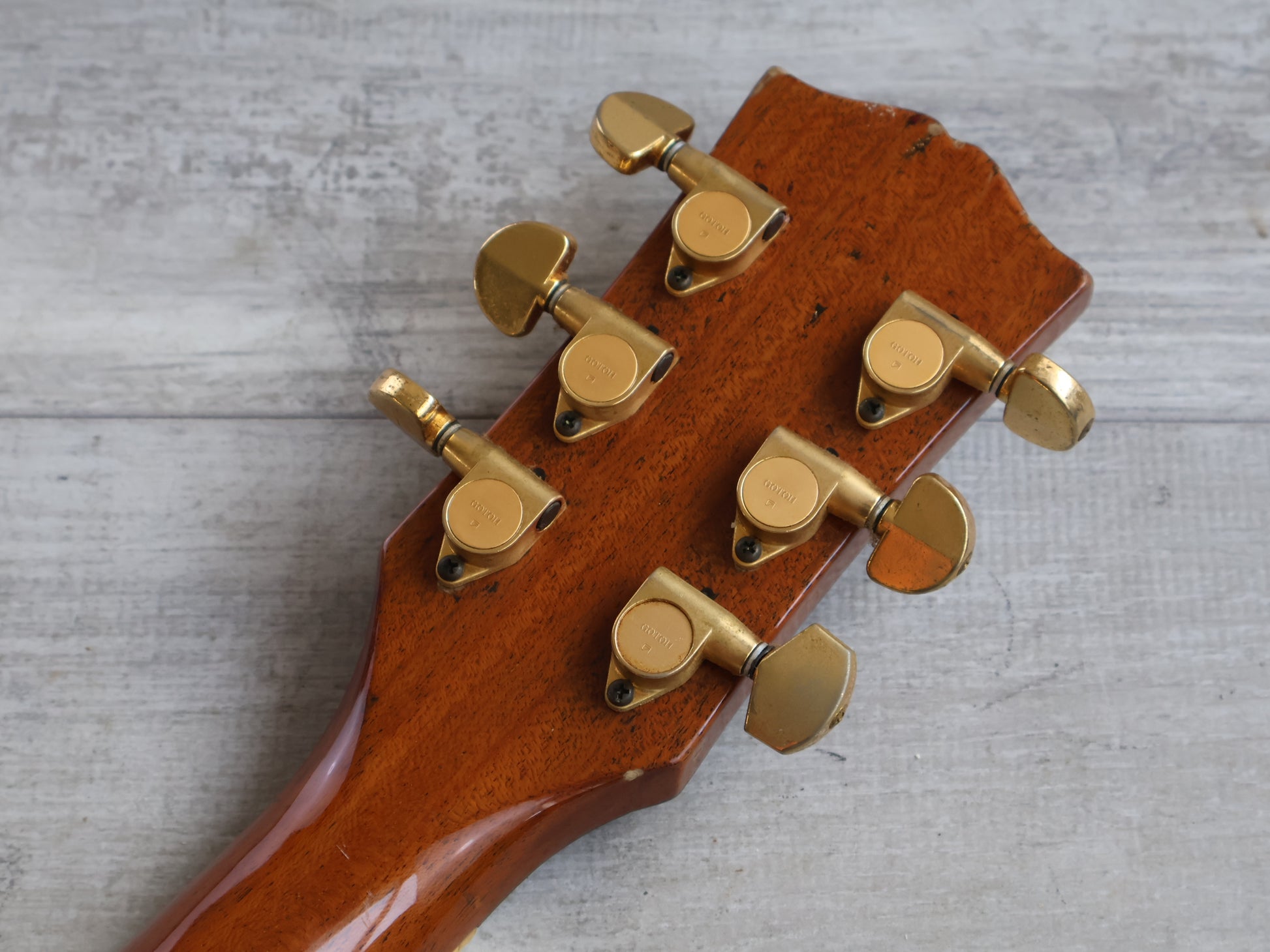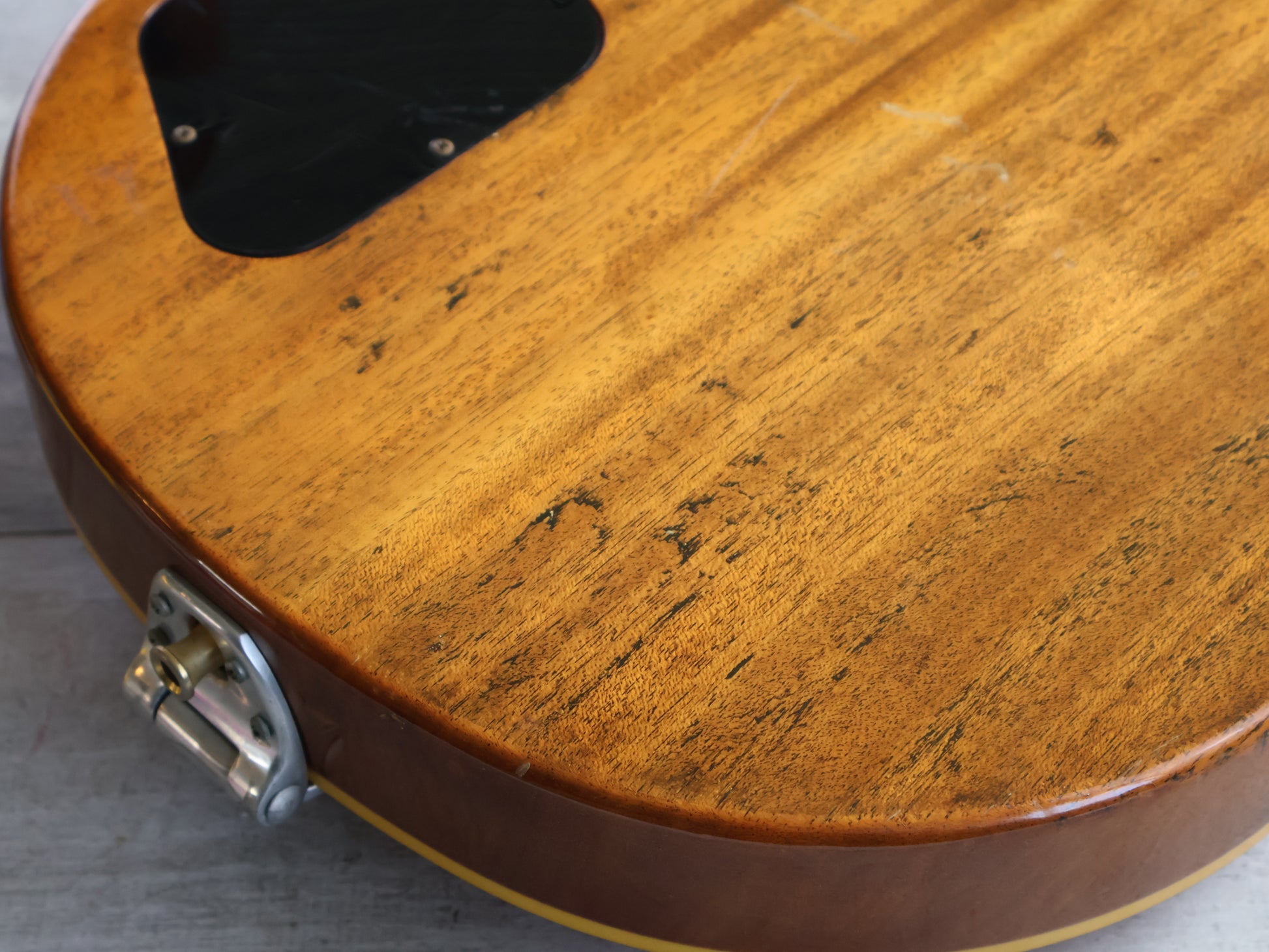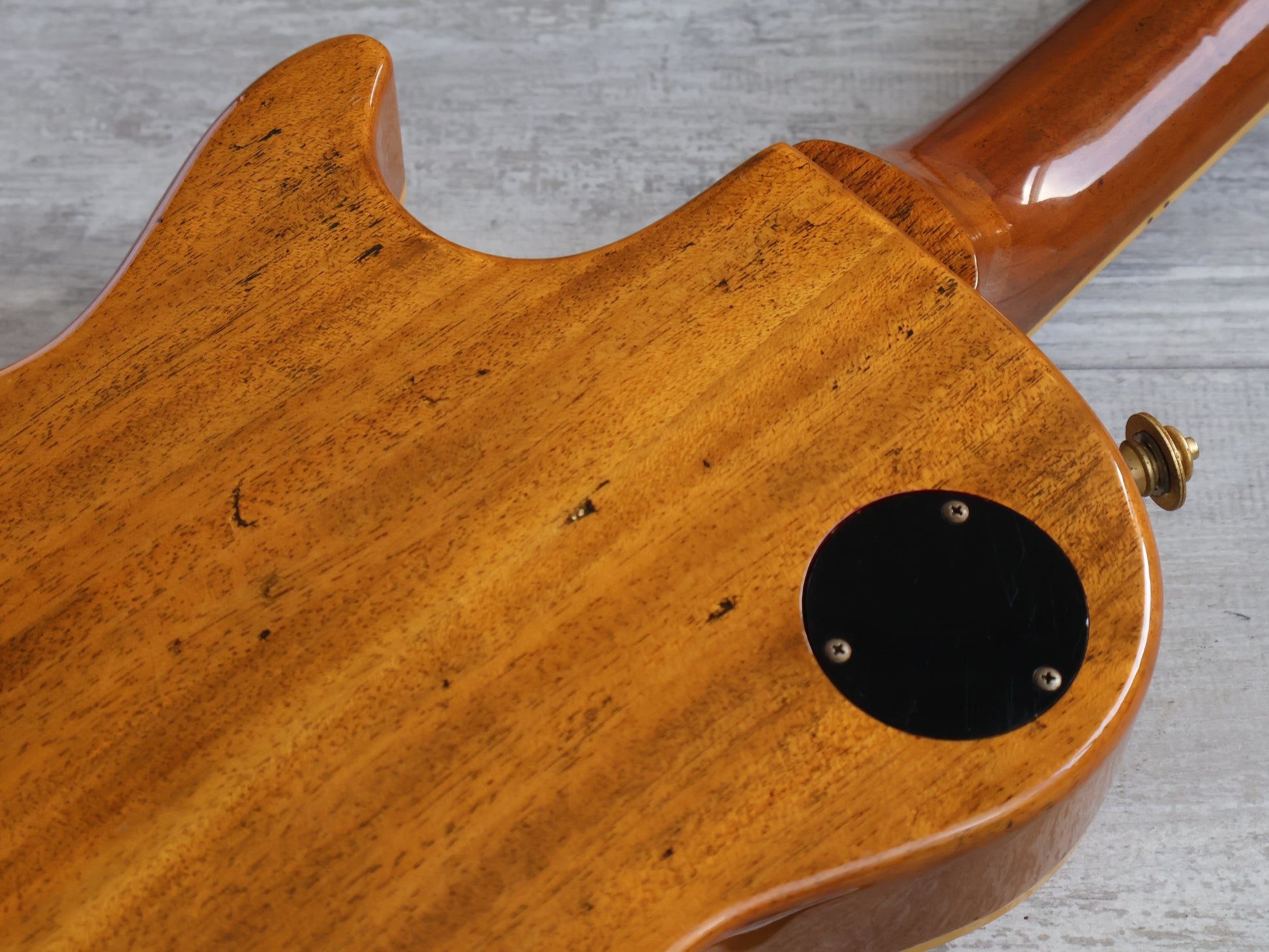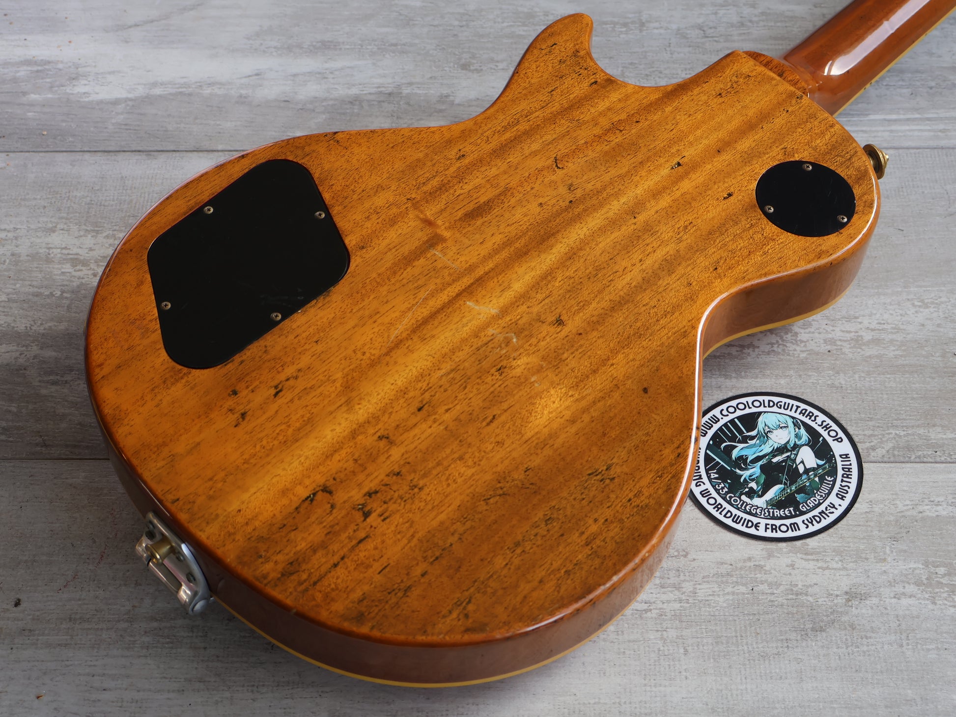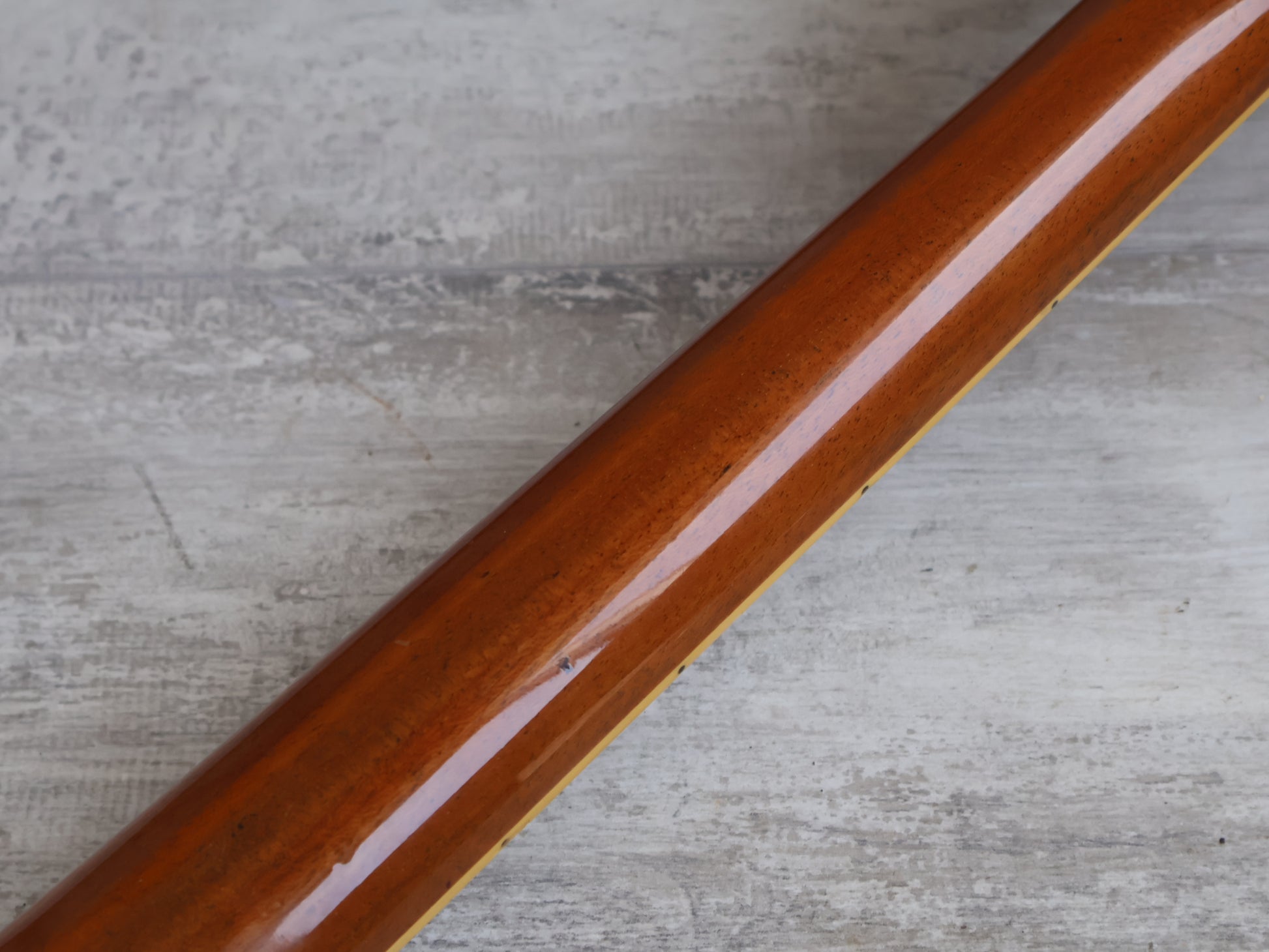 Good overall condition with only basic wear and tear since the refurbishment, the finish is clean with only minor blemishes and there's no breaks or repairs. The neck is straight and the truss adjusts freely, the frets are shiny and smooth with some light pitting but plenty of life.