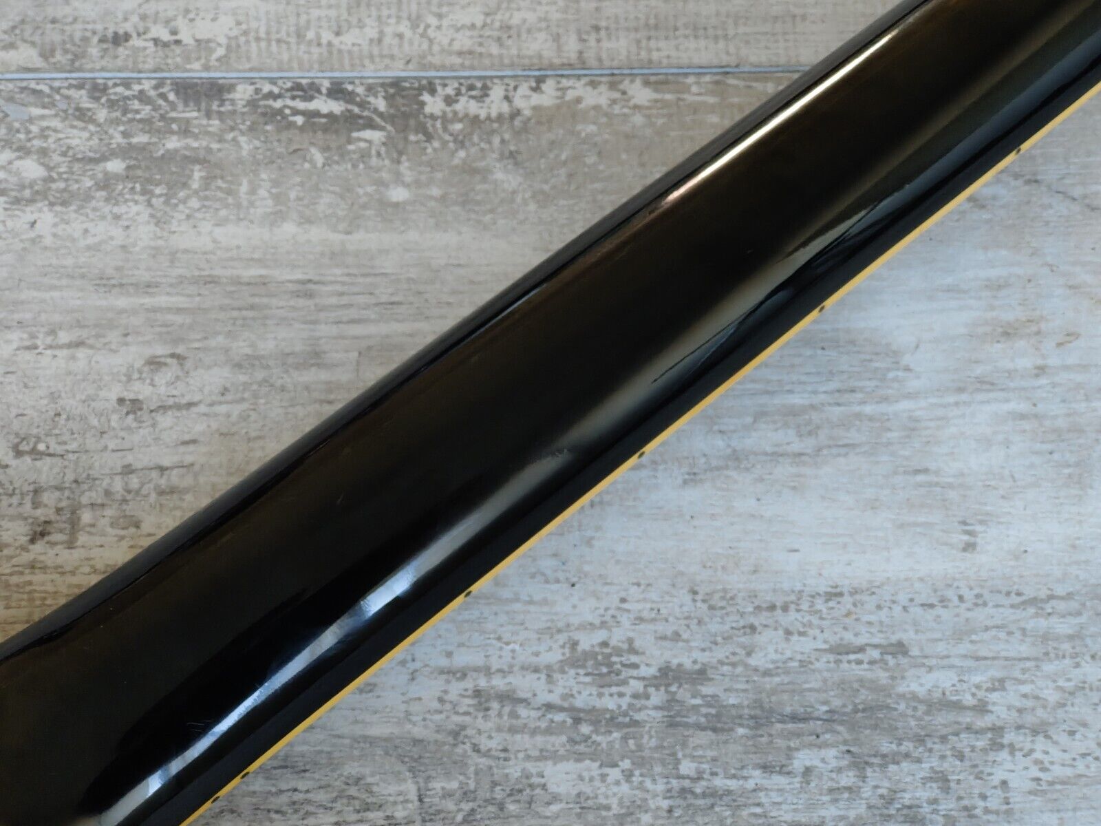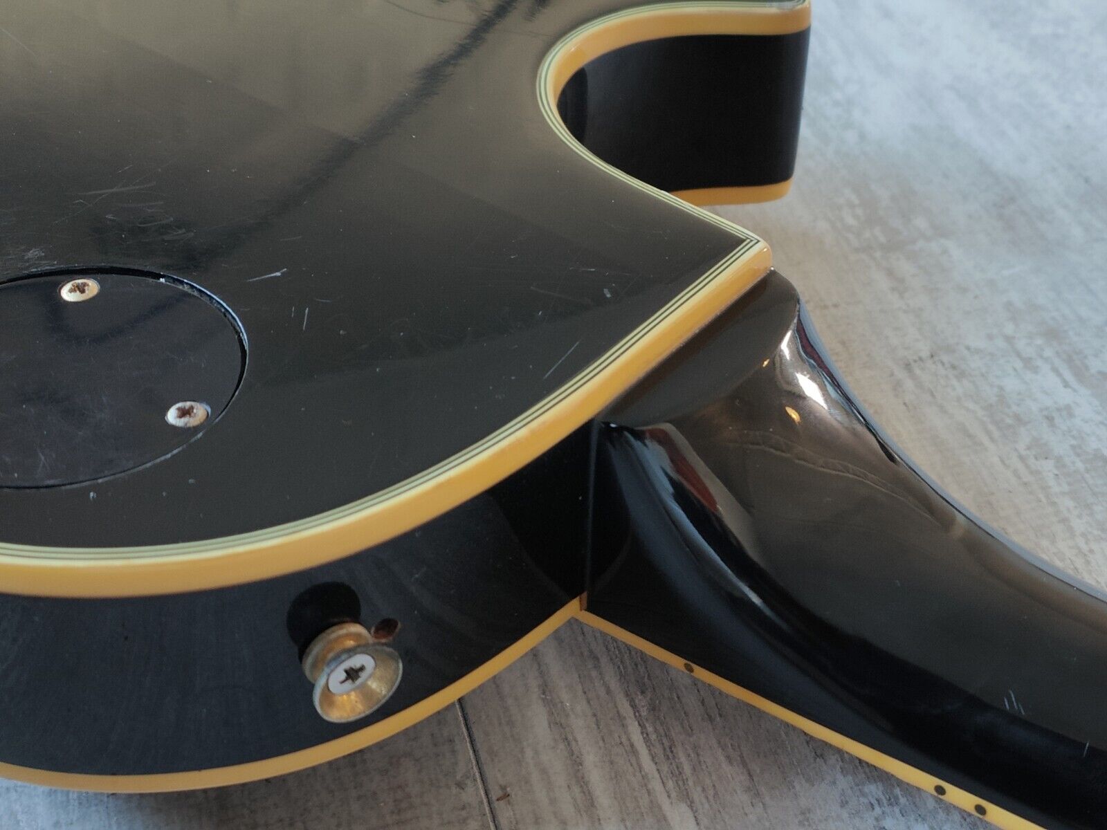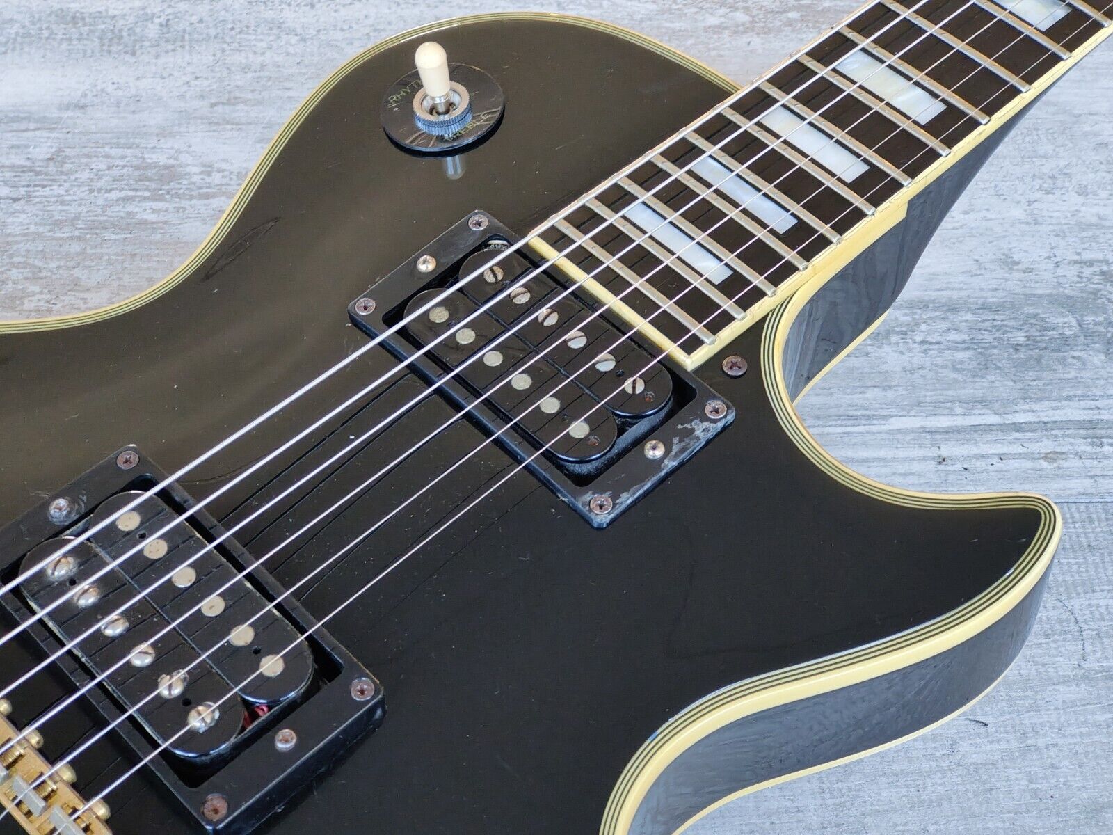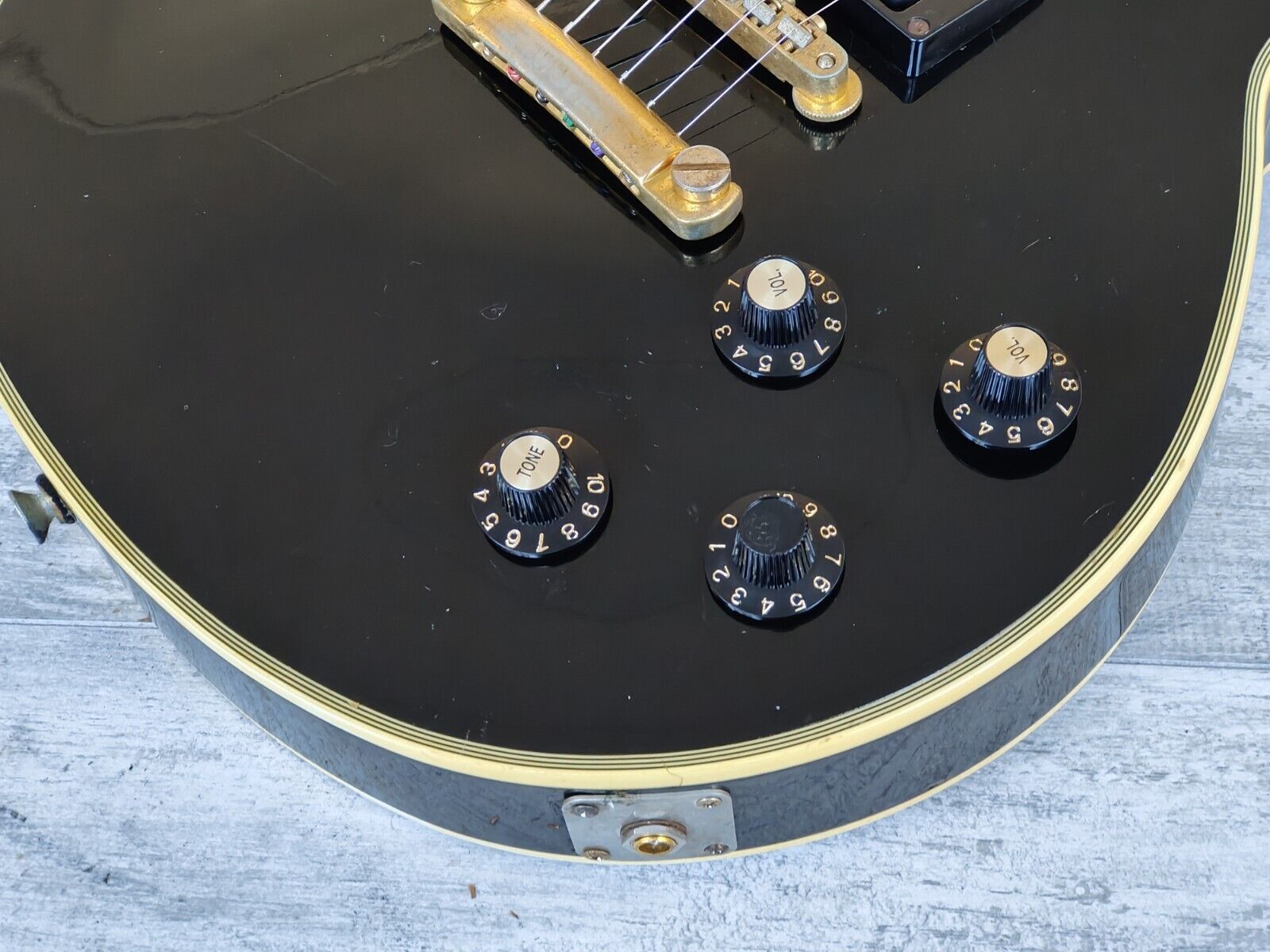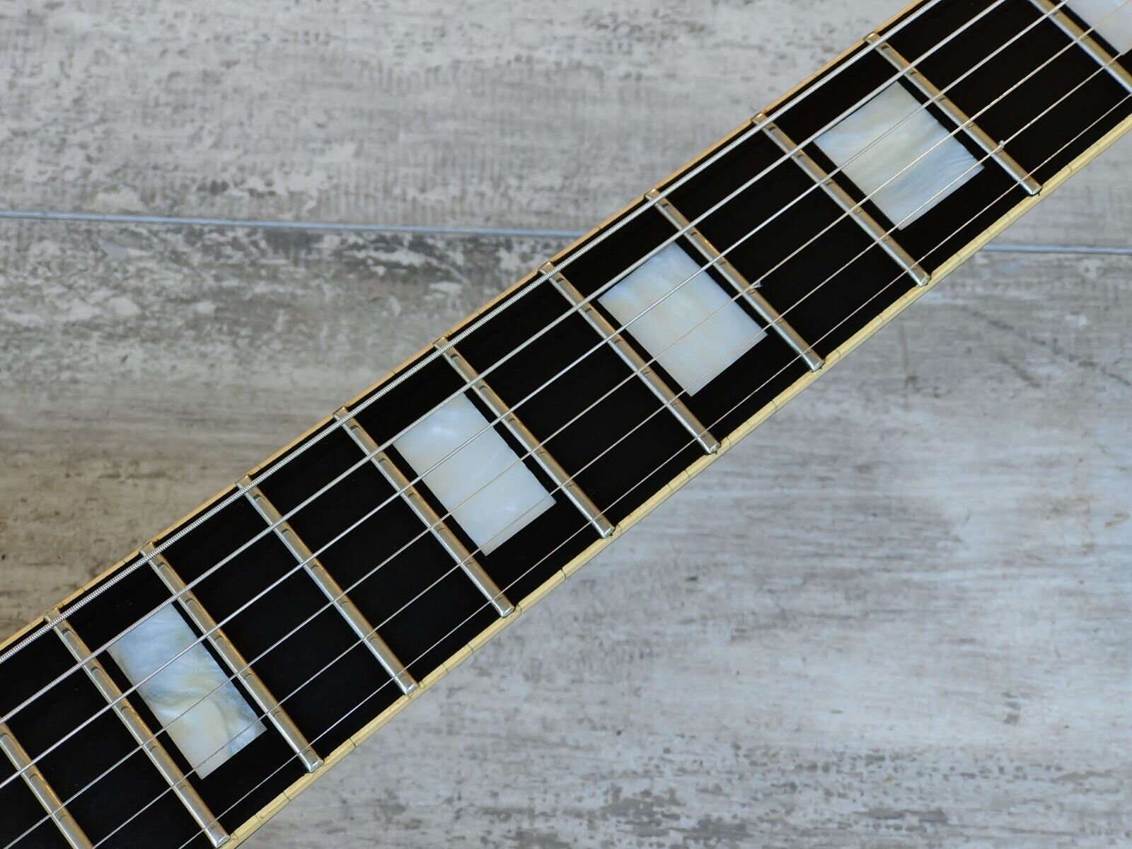 Made by the Cort factory in Korea in the early 1990's, this is the Greco EGC '68 reissue Les Paul Custom in Ebony. Mahogany back with a lightly carved maple top, slim 60's profile mahogany neck and a 22 fret rosewood fingerboard, it weighs a surprisingly hefty 4.6kg's. Original bridge humbucker paired with a Seymour Duncan Alnico II Pro in the neck with the original switch and wiring along with the original Greco branded tuners.