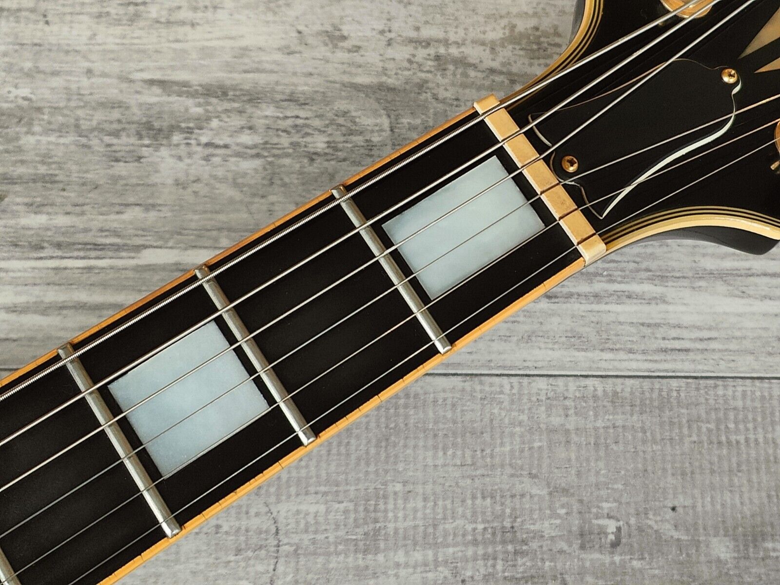 Made by the Cort factory in Korea in the early 1990's, this is the Greco EGC '68 reissue Les Paul Custom in Ebony. Mahogany back with a lightly carved maple top, slim 60's profile mahogany neck and a 22 fret rosewood fingerboard, it weighs a surprisingly hefty 4.6kg's. Looks to have some generic chrome humbuckers installed (unbranded) otherwise it seems all original with a gold bridge/tailpiece along with the original Greco branded tuners.