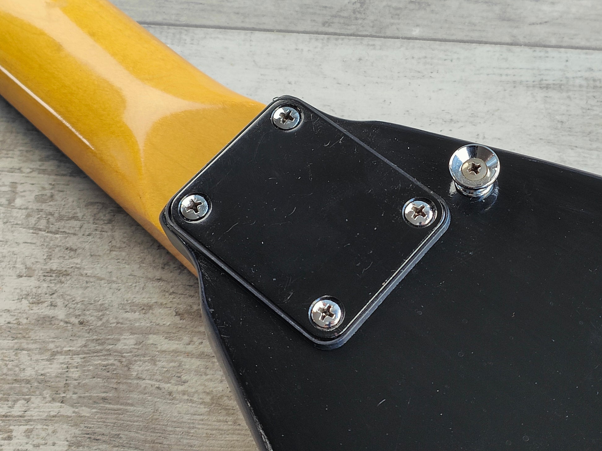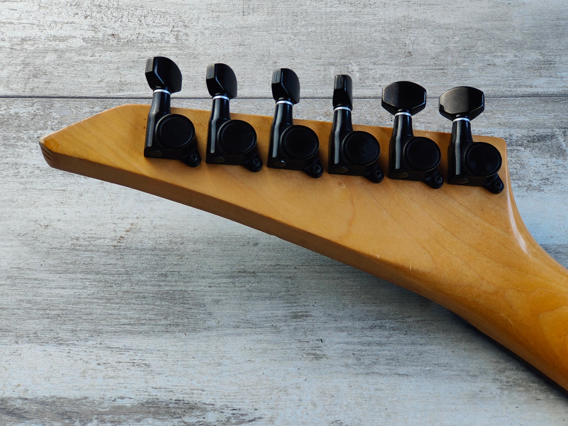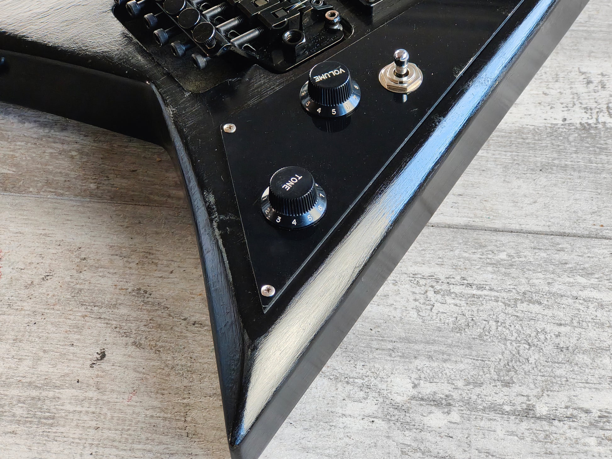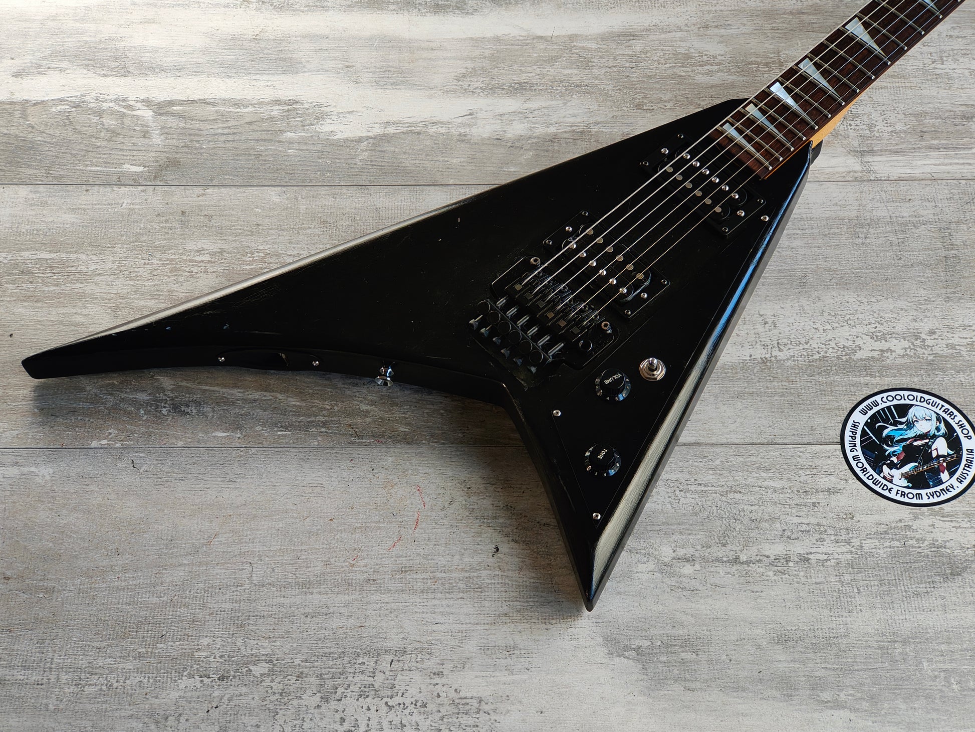 Made from a 1990's Charvel neck bolted to a Grover Jackson Rhoads body (both made in Japan and from the same factory), it's been loaded with a pair of generic vintage Japanese humbuckers, a TRS-202 licensed Floyd Rose tremolo, Gotoh tuners and a custom fabricated pickguard. The body was previously given a very amateur black paint job that could be a perfect refinish candidate or just enjoy it as it is.