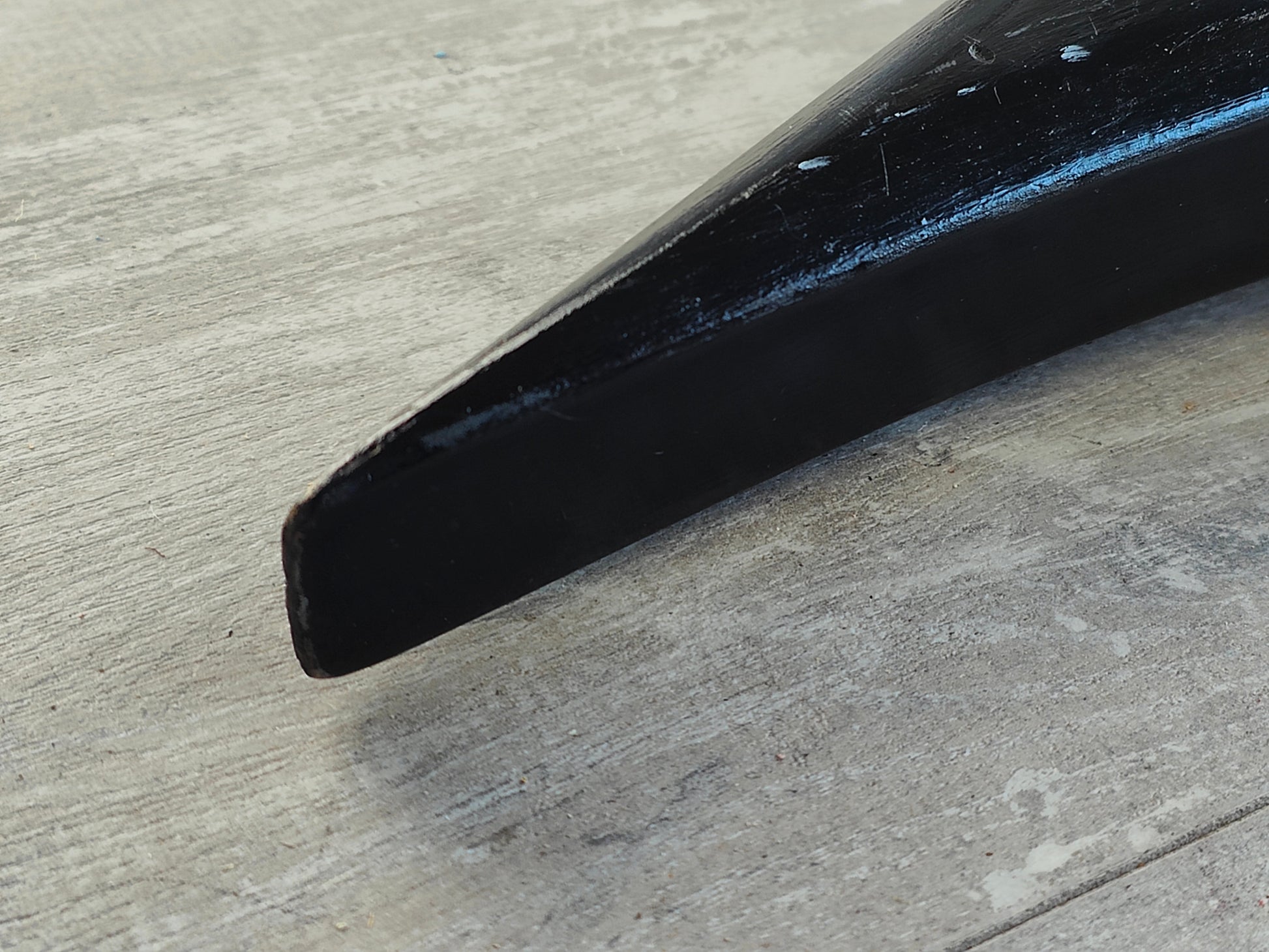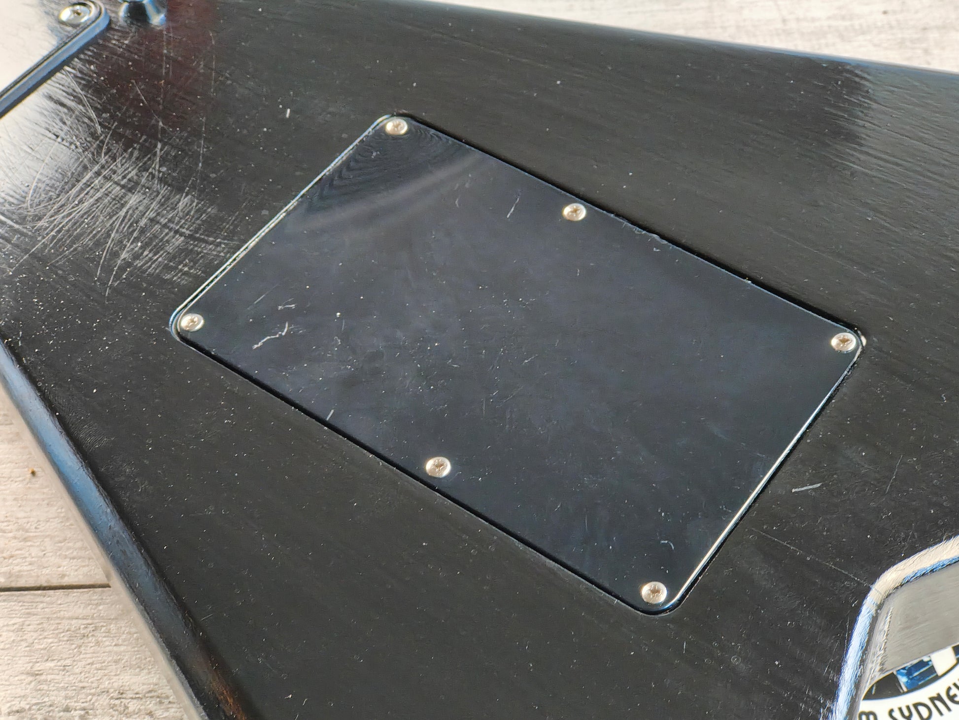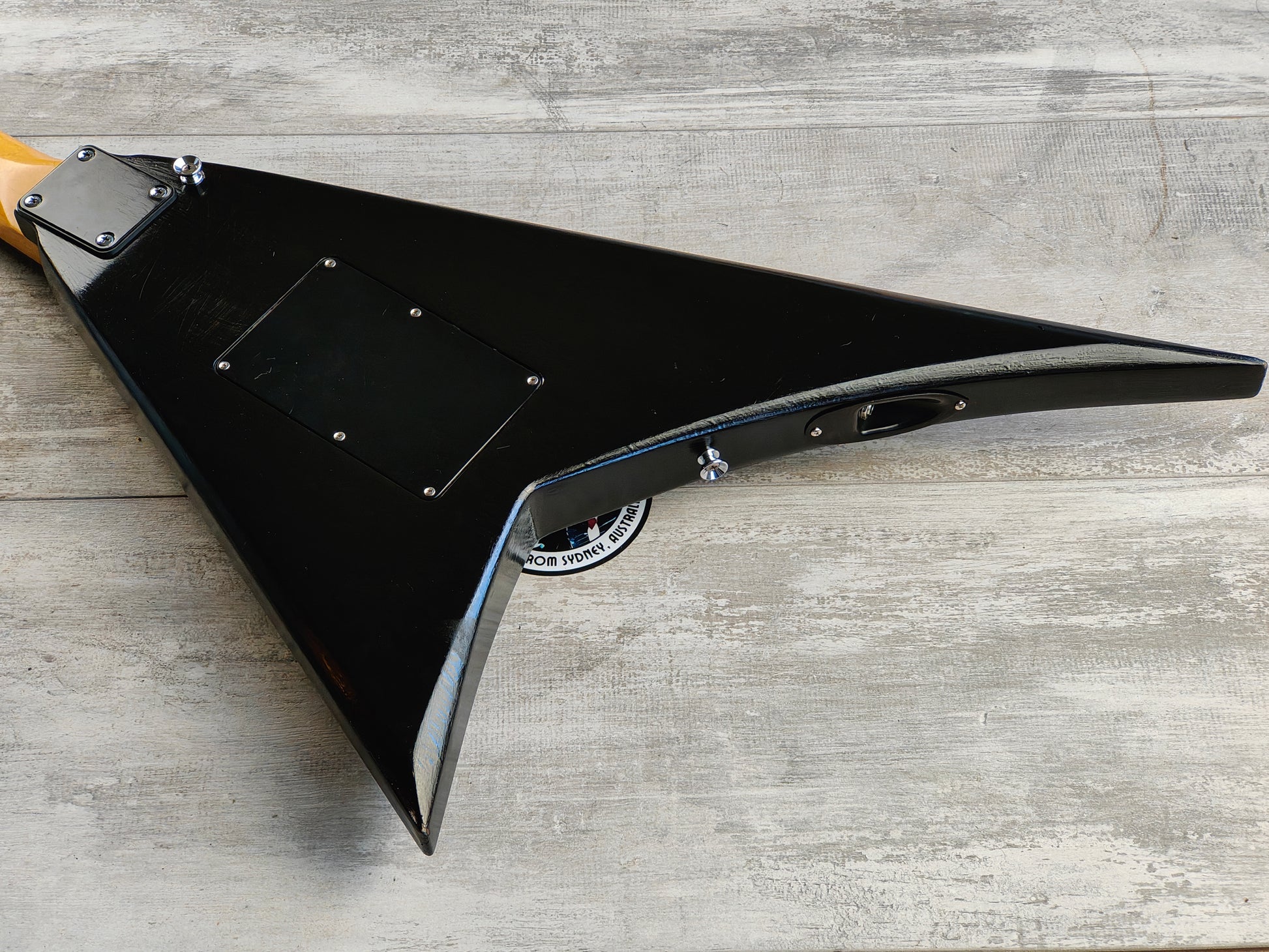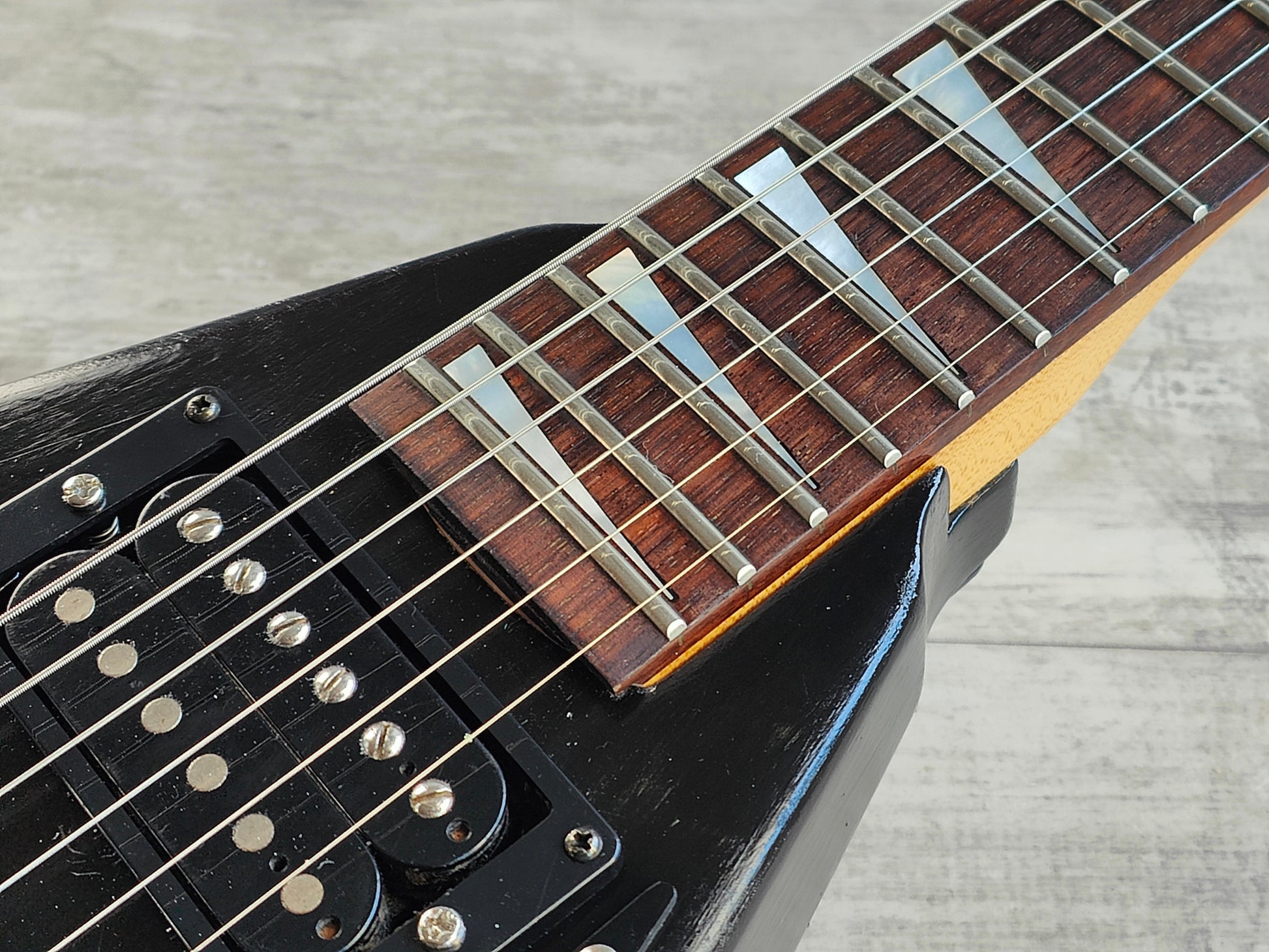Made from a 1990's Charvel neck bolted to a Grover Jackson Rhoads body (both made in Japan and from the same factory), it's been loaded with a pair of generic vintage Japanese humbuckers, a TRS-202 licensed Floyd Rose tremolo, Gotoh tuners and a custom fabricated pickguard. The body was previously given a very amateur black paint job that could be a perfect refinish candidate or just enjoy it as it is.