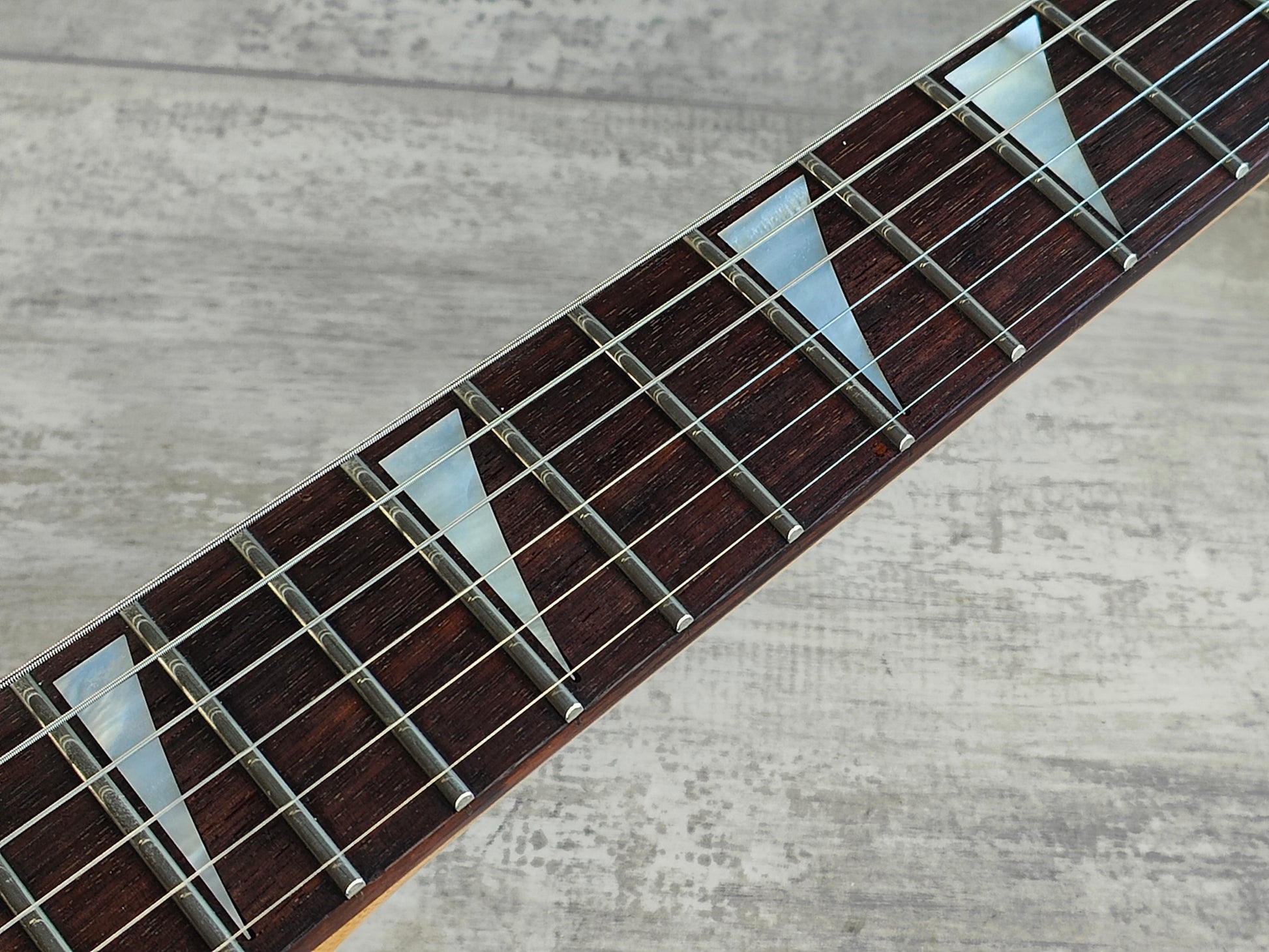 Our tech gave it a full professional setup after he rebuilt it so it plays and sounds really nice with plenty of life in the shiny frets and a straight neck with a fully adjustable truss.