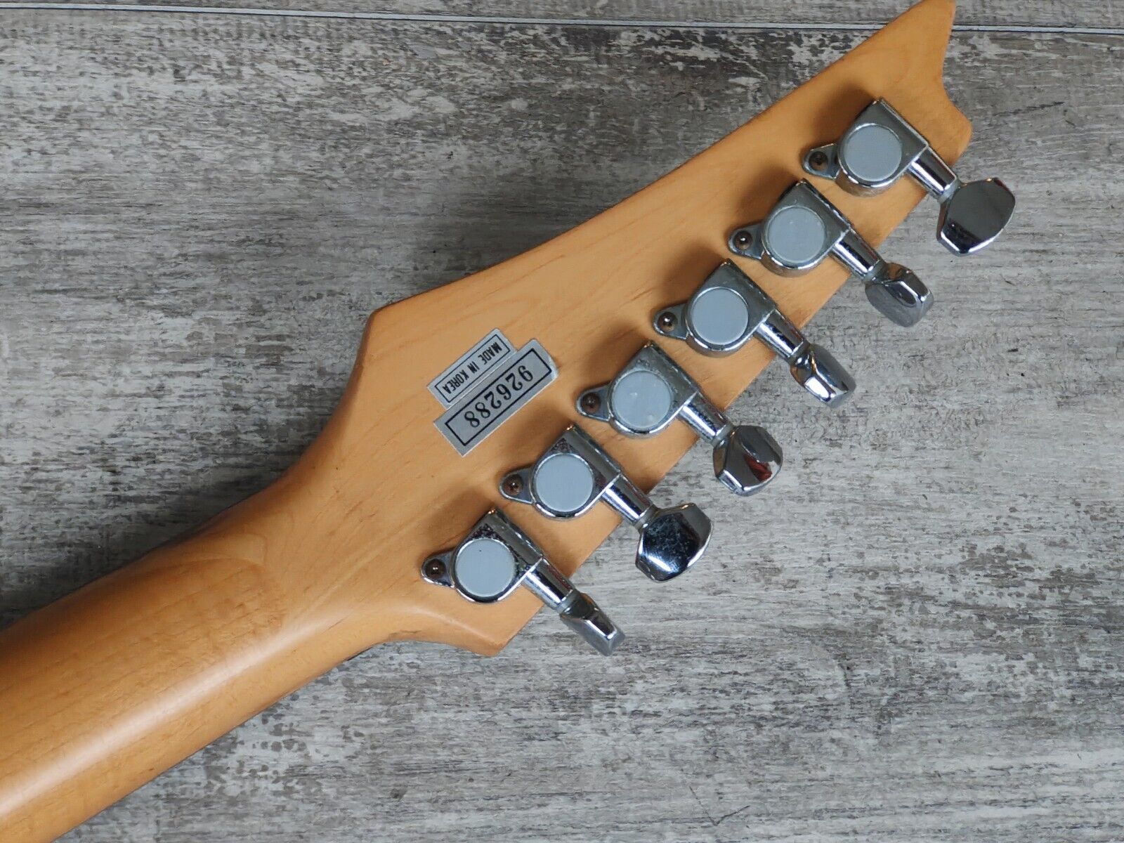 Korean made in what appears to be the mid 1990's (likely by Cort), this is a seemingly non-catalog model RG from Ibanez. Solid body with a maple neck and a 24 fret maple fingerboard (648mm scale length, 43mm nut width), it weighs 3.5kg's. Loaded with what appear to be the original HSH pickups (unmarked) controlled by a 5-way selector and master volume/tone knobs, generic tuners and a Stratocaster style tremolo system, it looks to be all original.
