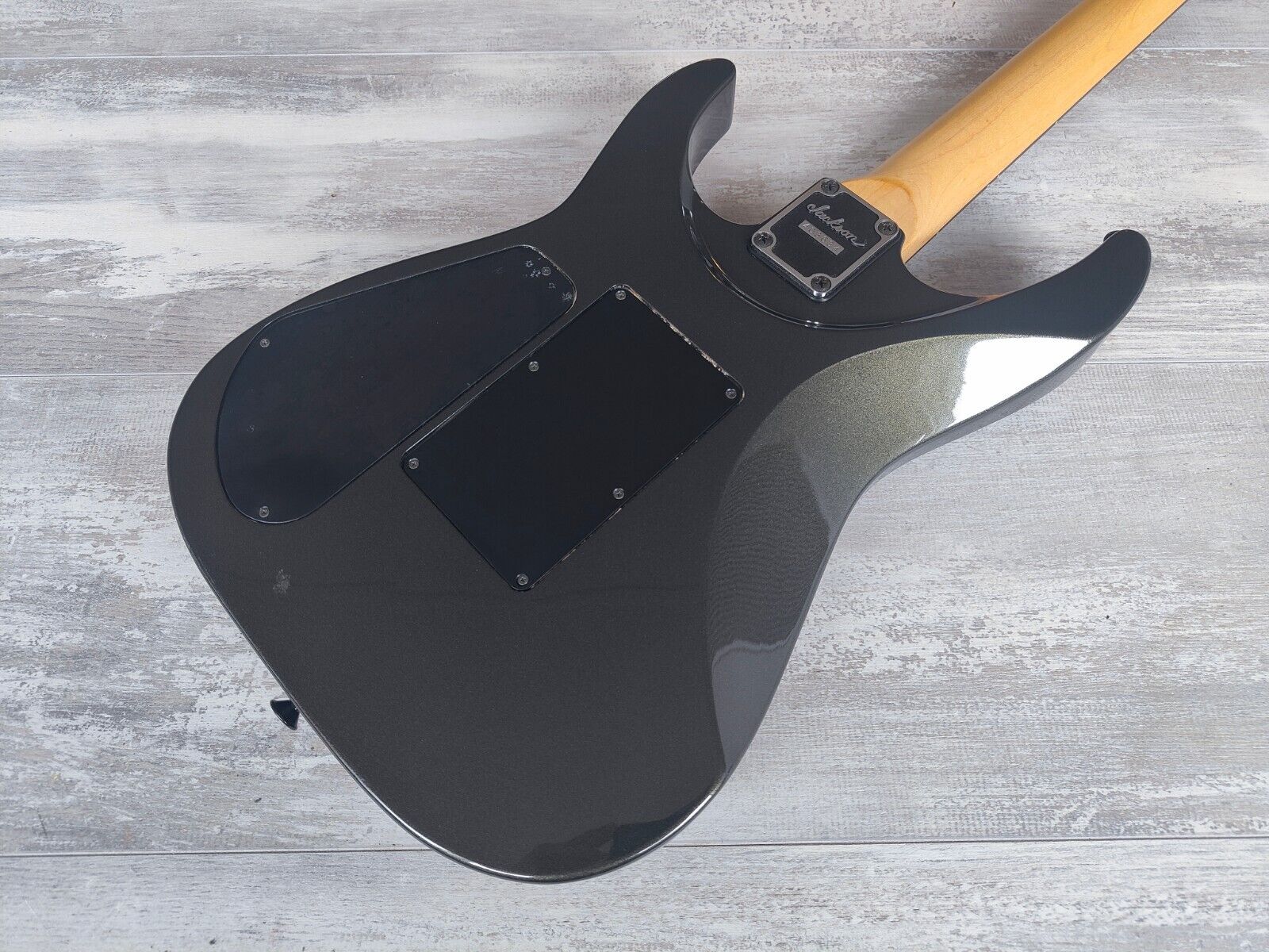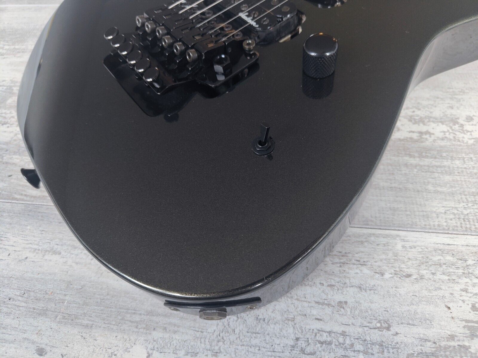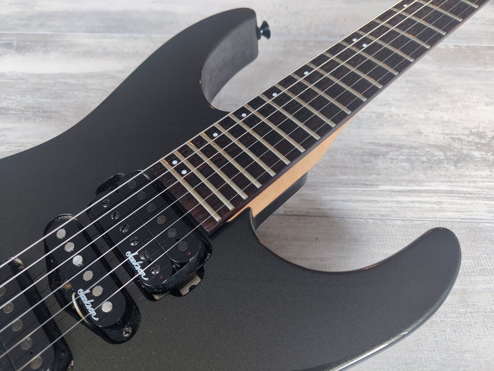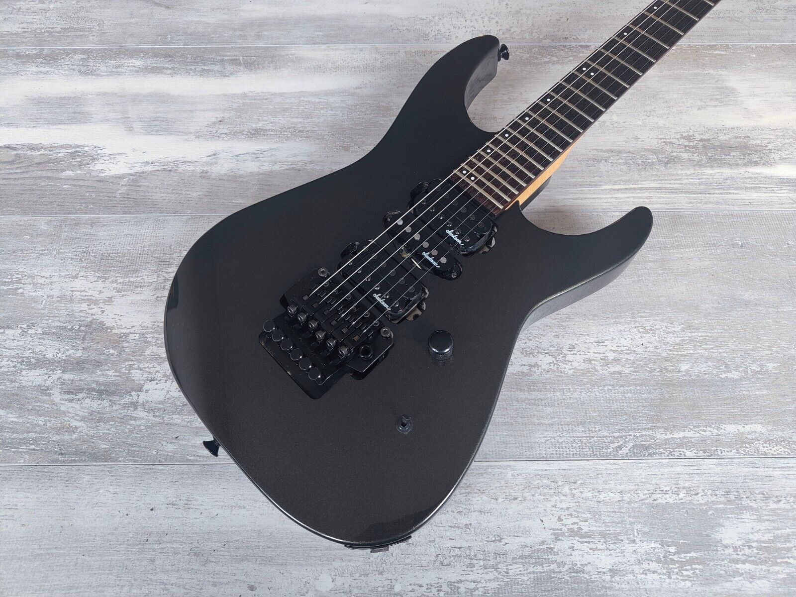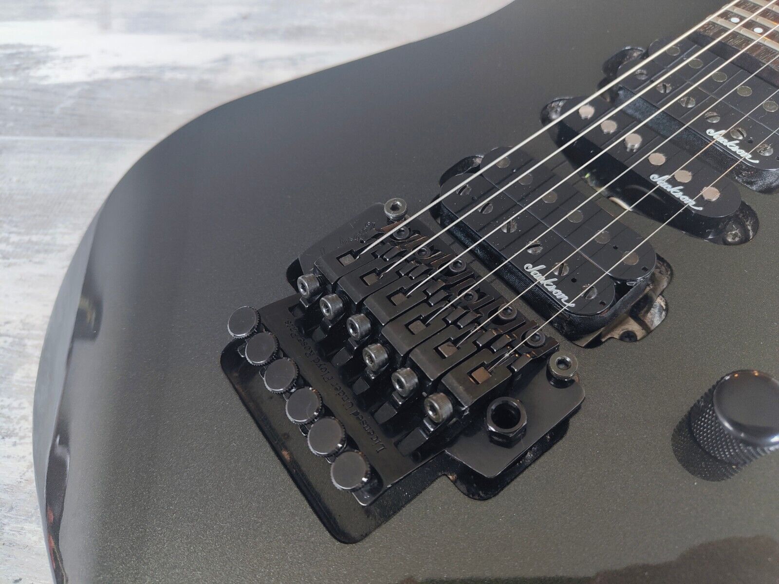 A very simple Japanese shredder. A Grover Jackson branded Super Dinky model with a two-piece poplar body wearing a dark metallic green finish with a bolt on slim maple neck, reverse headstock and a 24 fret rosewood fretboard (628mm scale length), weighs 3.7kg's. Jackson branded tuners and a Jackson Floyd Rose along with a set of factory HSH Jackson J-900/J-500 pickups with a three-way mini toggle and master volume knob (push pull with a coil split).