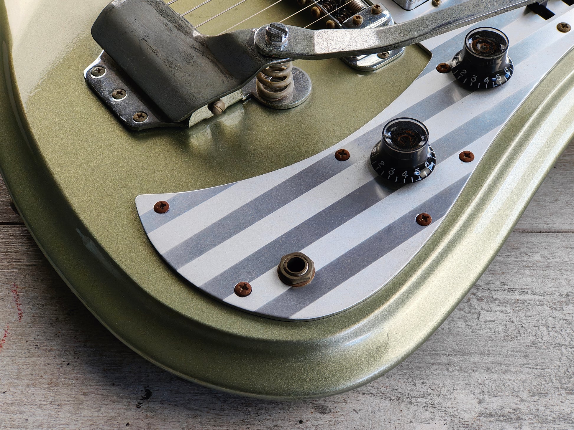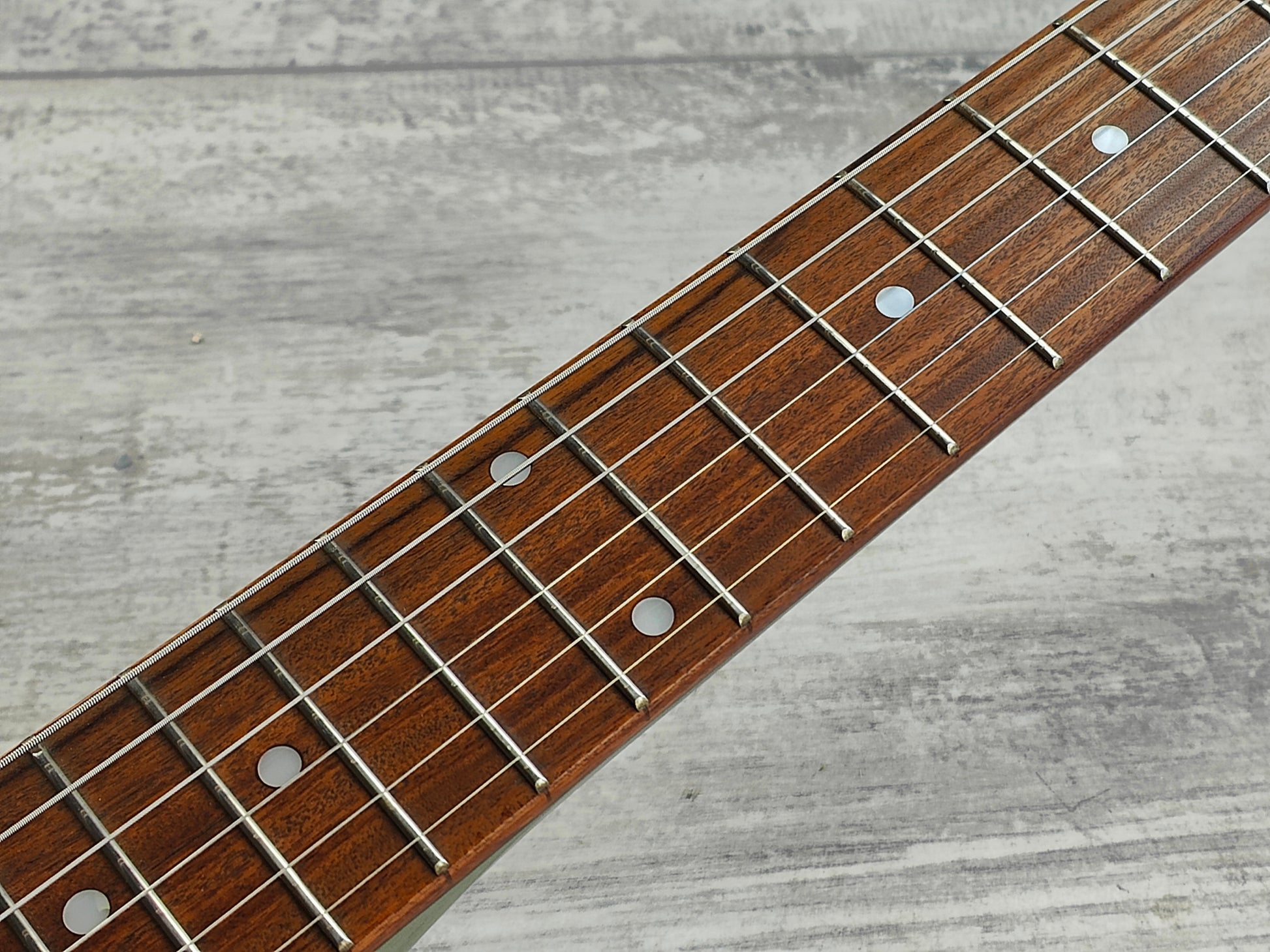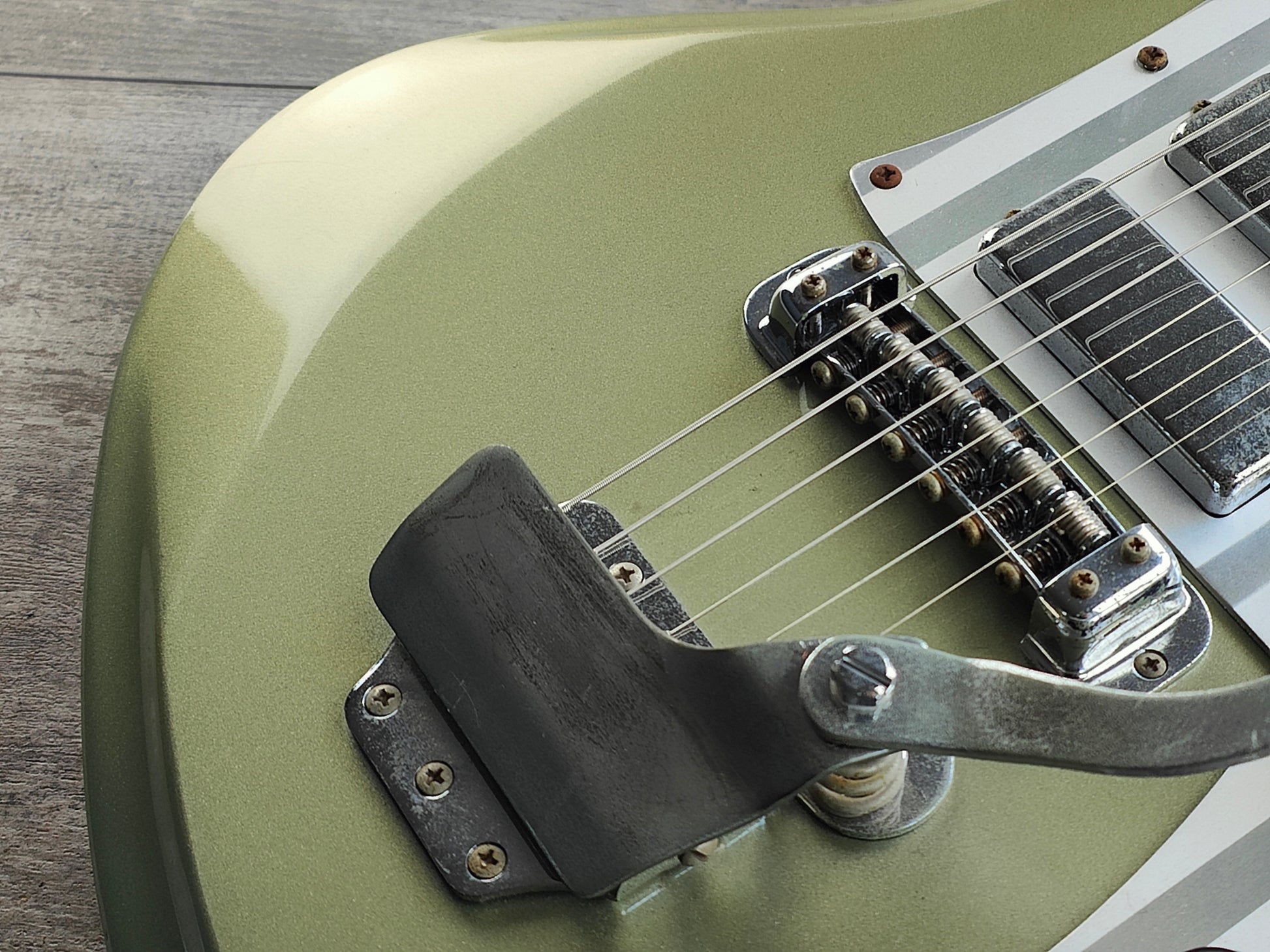 One of the 1990's reissue models of the famous Teisco Sharkfin from the 1960's. Slim solid body with a German carve on the top bolted to a slim C maple neck with a 22 fret rosewood fingerboard (628mm scale length, 44mm nut width at the Zero fret), it weighs 3.1kg's. Loaded with three mini-humbuckers controlled by individual on/off switches and master volume/tone controls. The original tremolo system and intoneateable roller bridge system allow for gentle wobbles without the need to constantly retune.