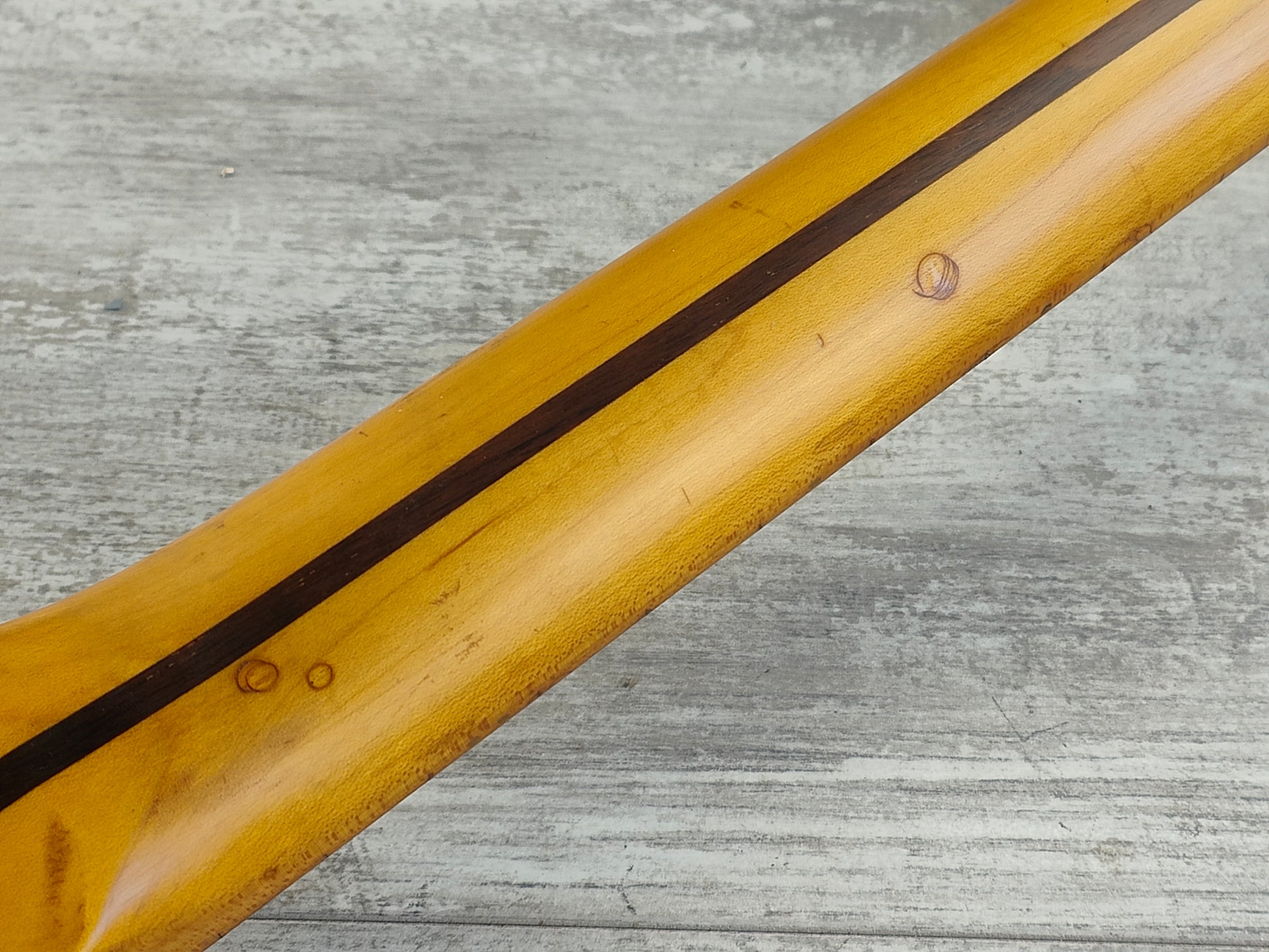 This one's been modified/upgraded over the years as pictured. Loaded with Gotoh tuners, a Fender bridge with brass saddles and a Seymour Duncan Quarter Pounder in the bridge position. It's a super comfortable players guitar that has the feel of a well loved guitar, straight neck and a functional truss. The frets have some pitting and wear but were polished and play smooth enough as it sits.