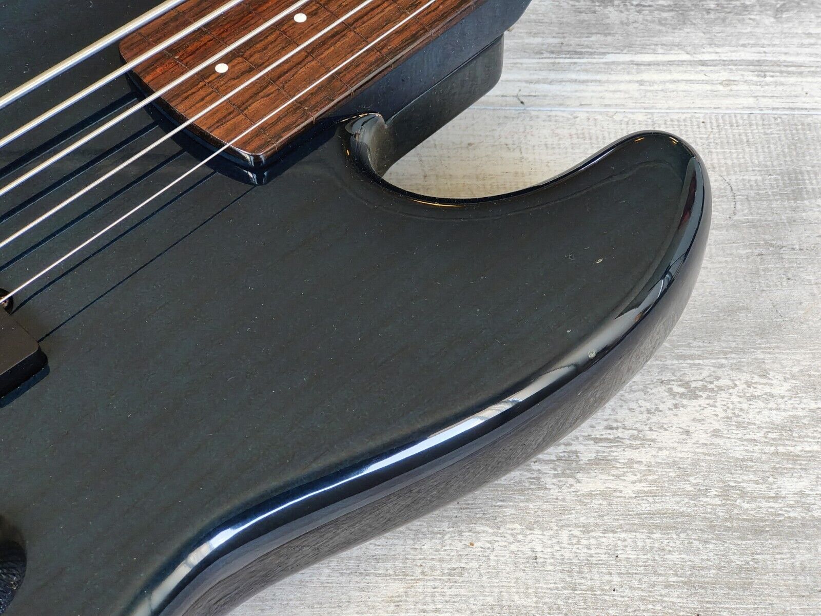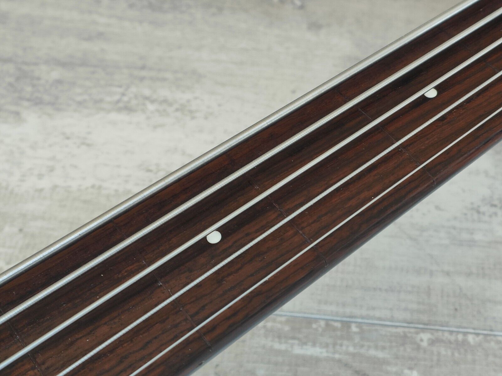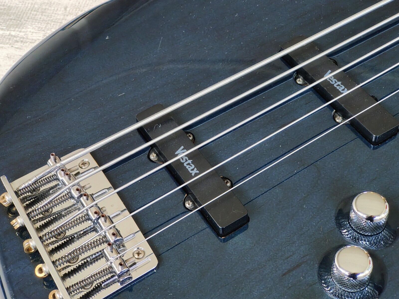 Made in Japan for Vestax (the famous audio/electronics company) factory likely in the 1990's. A previously de-fretted 5-string model Jazz Bazz with a transparent blue finish on an ash body with a maple neck and rosewood fingerboard (45mm nut width), it weighs 4.1kg's. Loaded with Vestax branded pickups and an active two-band EQ with volume, pickup blend, treble and bass knobs, it's clear that this was a very high-end build at the time!
