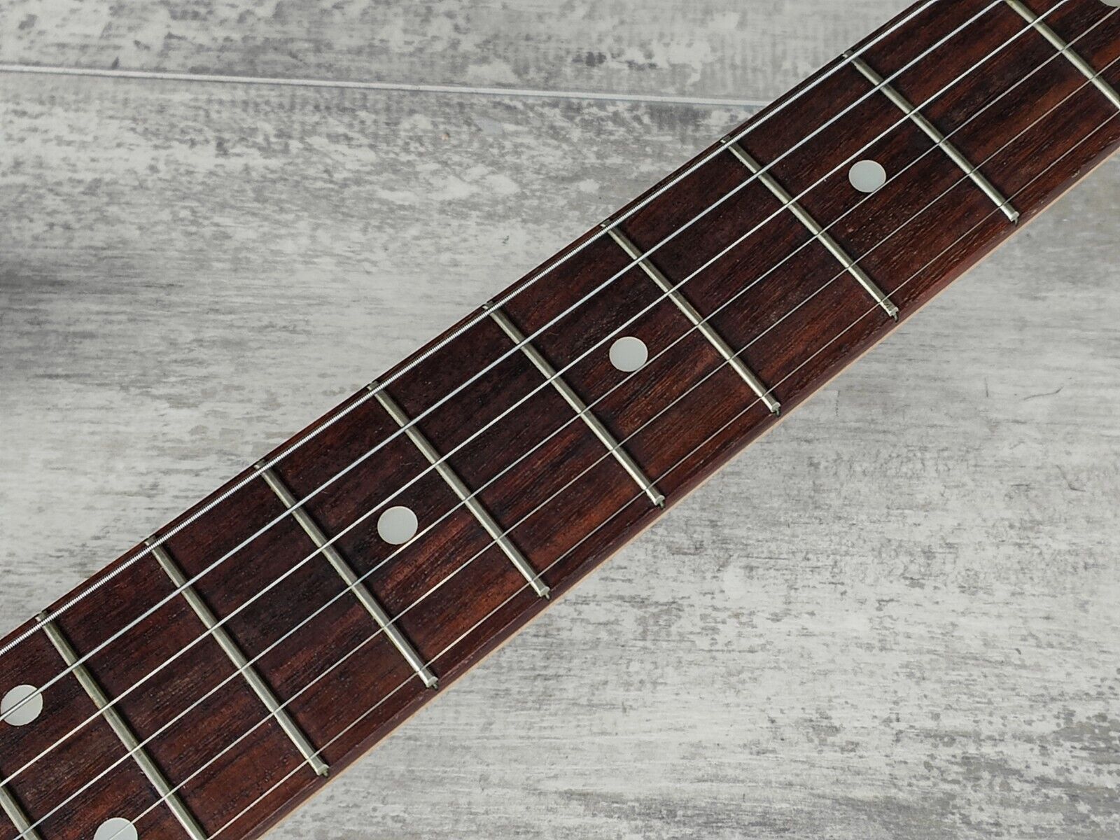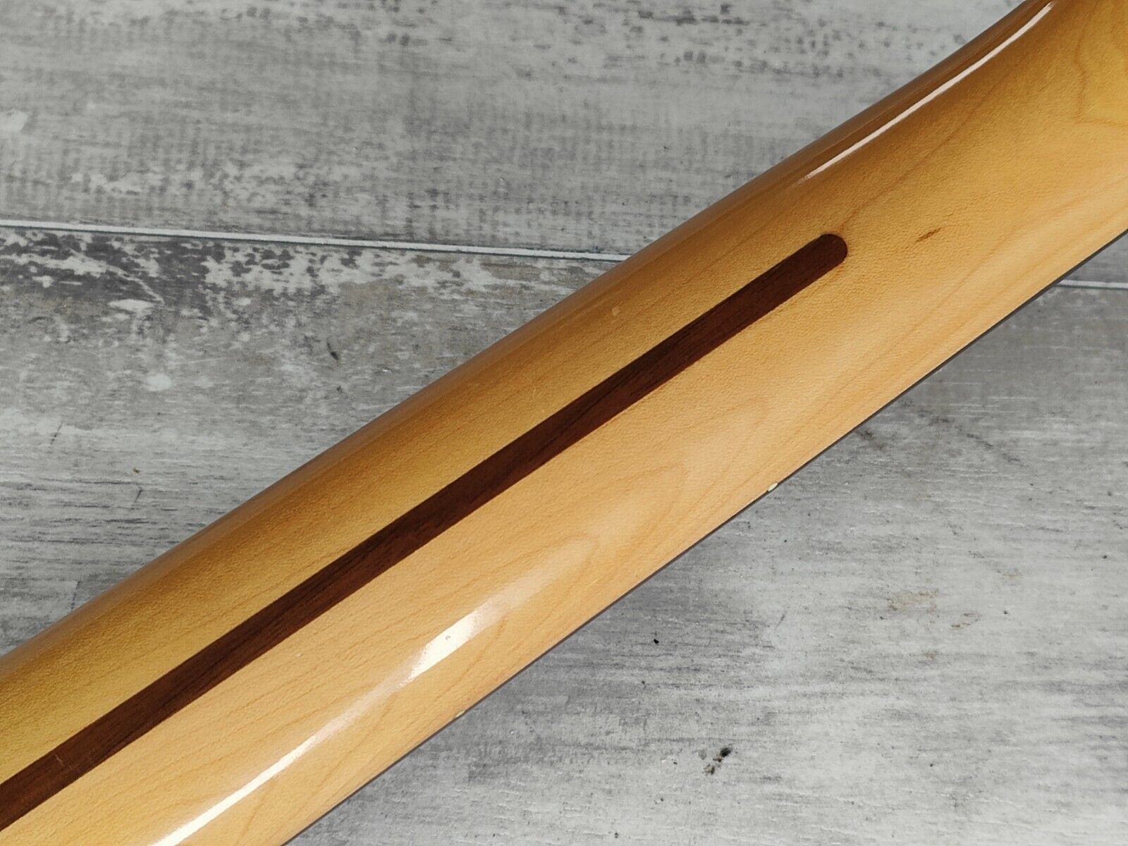 Made by the Fujigen factory in 1991, the ST-500VR was a modernised Stratocaster model from Fender Japan. With a solid body, maple neck and 22 fret rosewood fingerboard, it weighs 3.6kg's. This one's had the pickups and wiring replaced with generic single coils along with an aftermarket neck plate and screws, still has the original Fender branded bridge and Gotoh tuners.