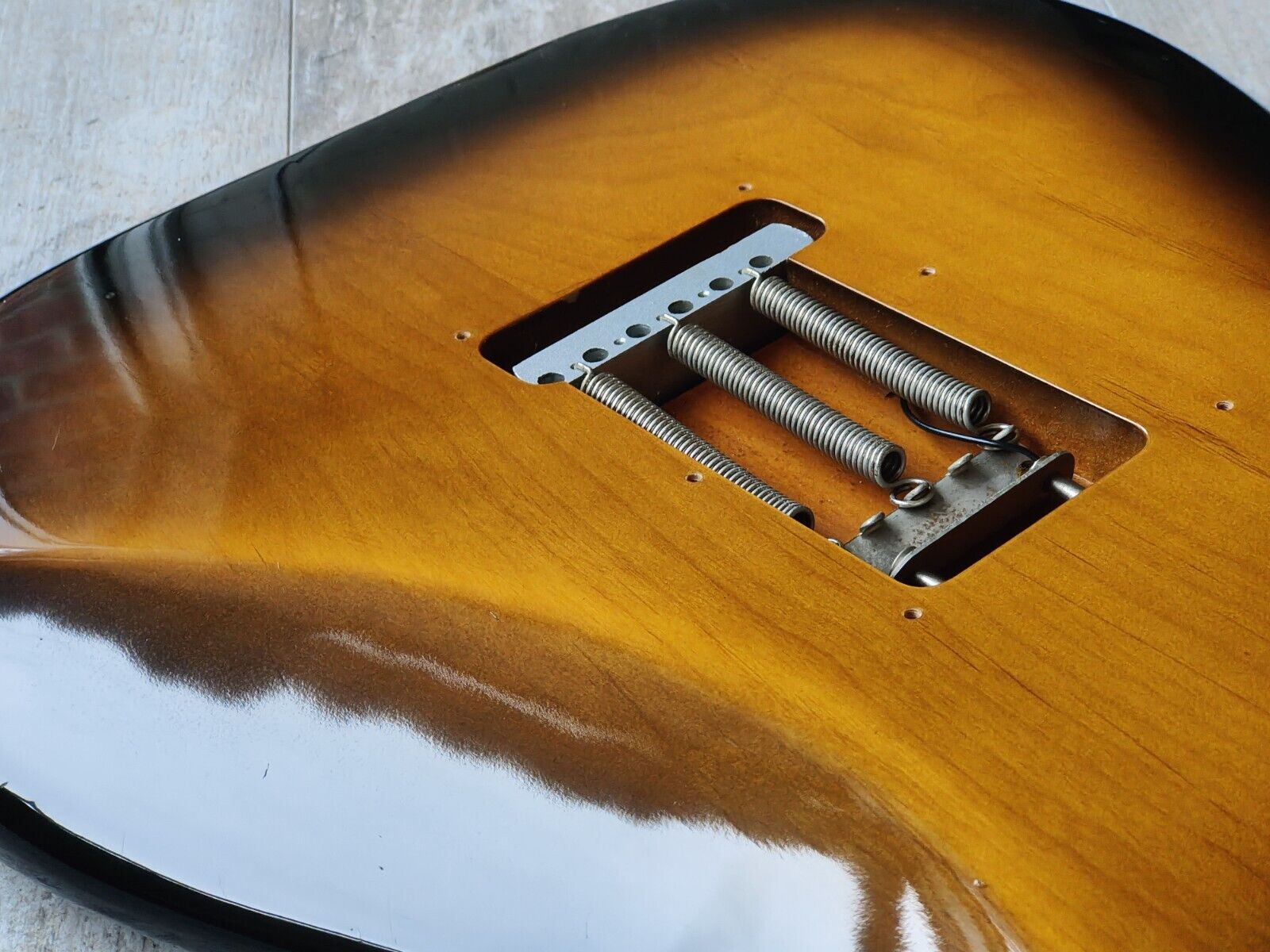Alder body with a maple neck shaped with the classic '57 slim C neck profile (7.25" radius, 43mm nut, 648mm scale length), it weighs 3.6kg's. Loaded with the original Fender USA ST-VINTAGE single coils, vintage style tuners and Fender stamped saddles.