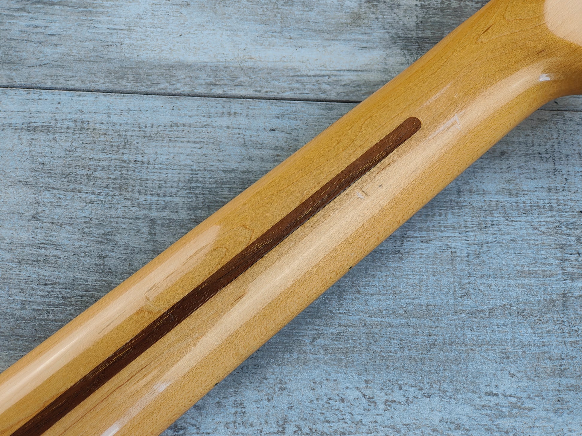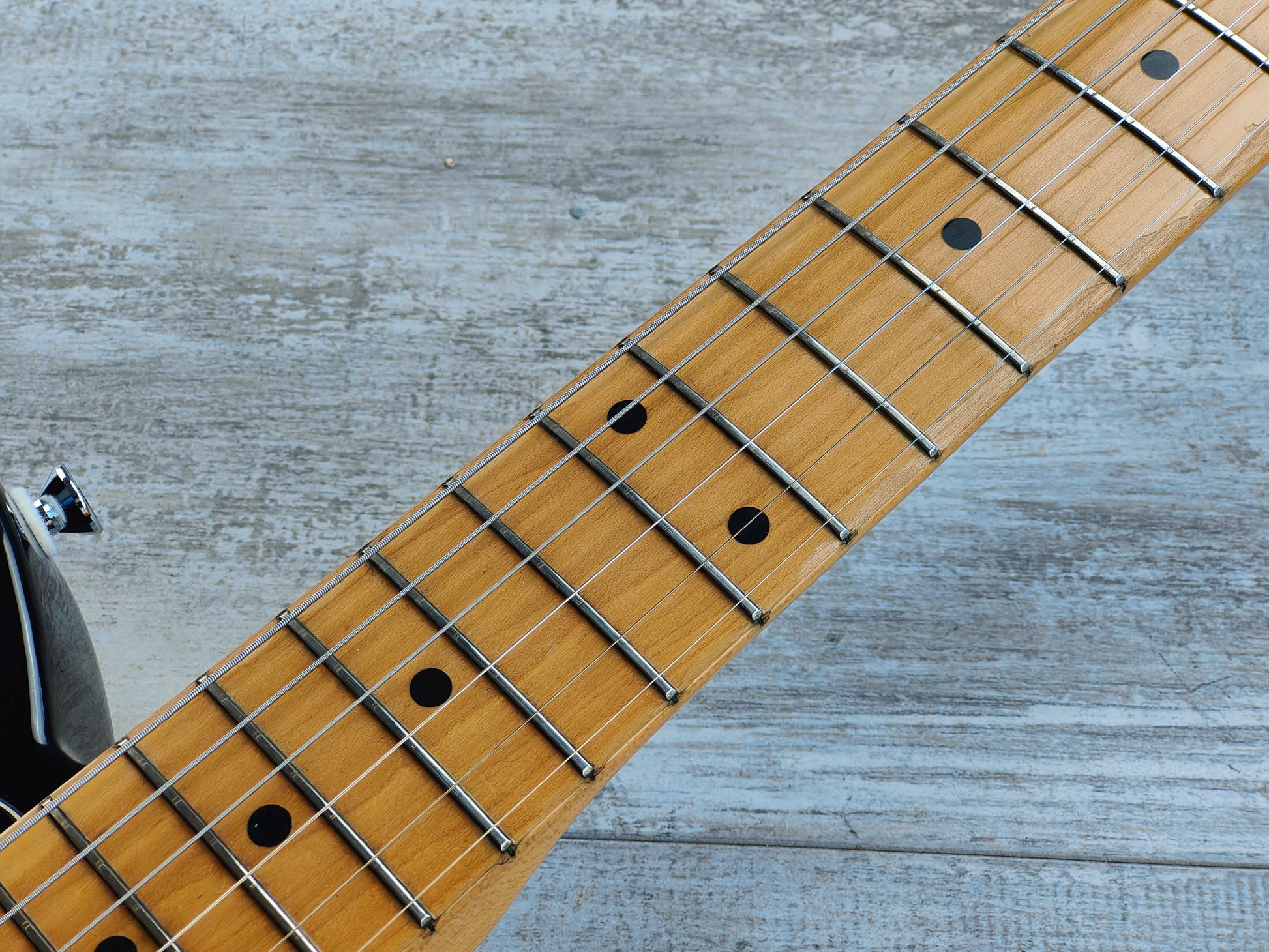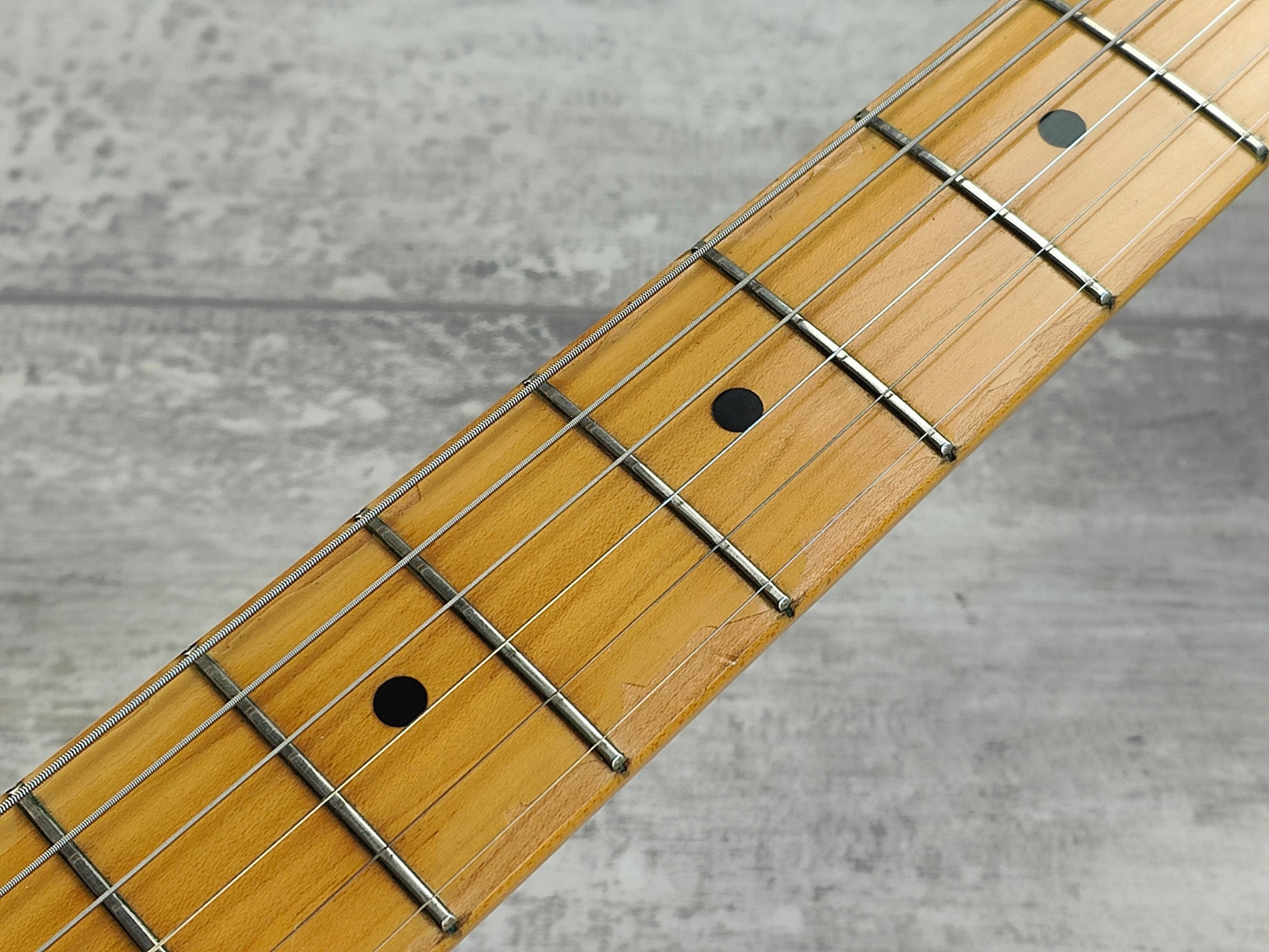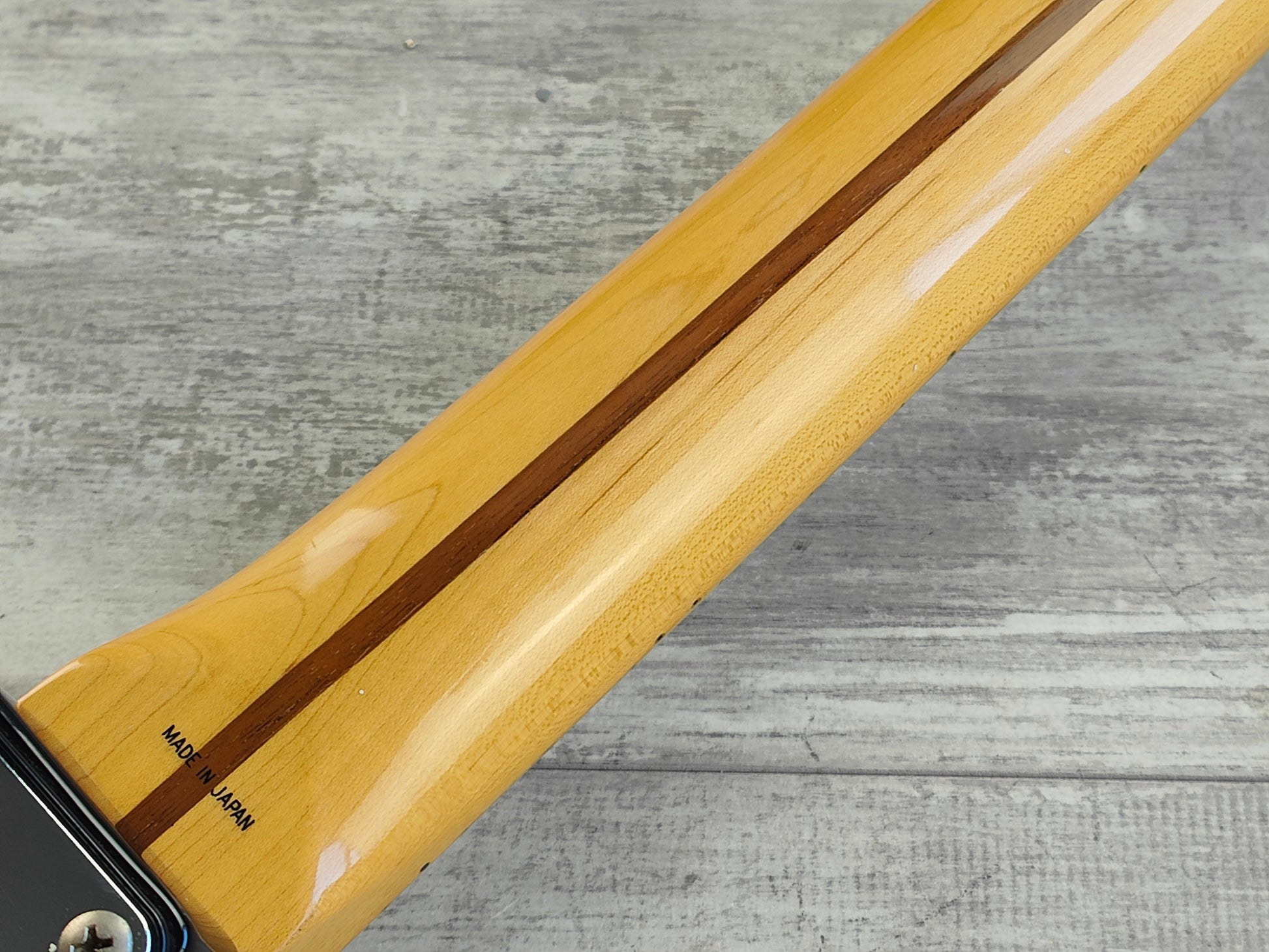 Made by the Fujigen factory in 1991, the TL72 was a reissue of the regular '72 model Telecaster (rather than the more famous Thinline or Custom models from that era). With a solid basswood body bolted to a slim C profile one-piece maple neck (7.25" radius, 21 frets), it weighs 3.6kg's. Loaded with the original TL-CURRENT pickups from Fender Japan, it's got a replacement tone pot/knob and some modern Japanese machine heads otherwise it appears to be factory original.