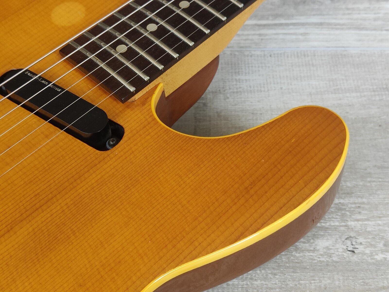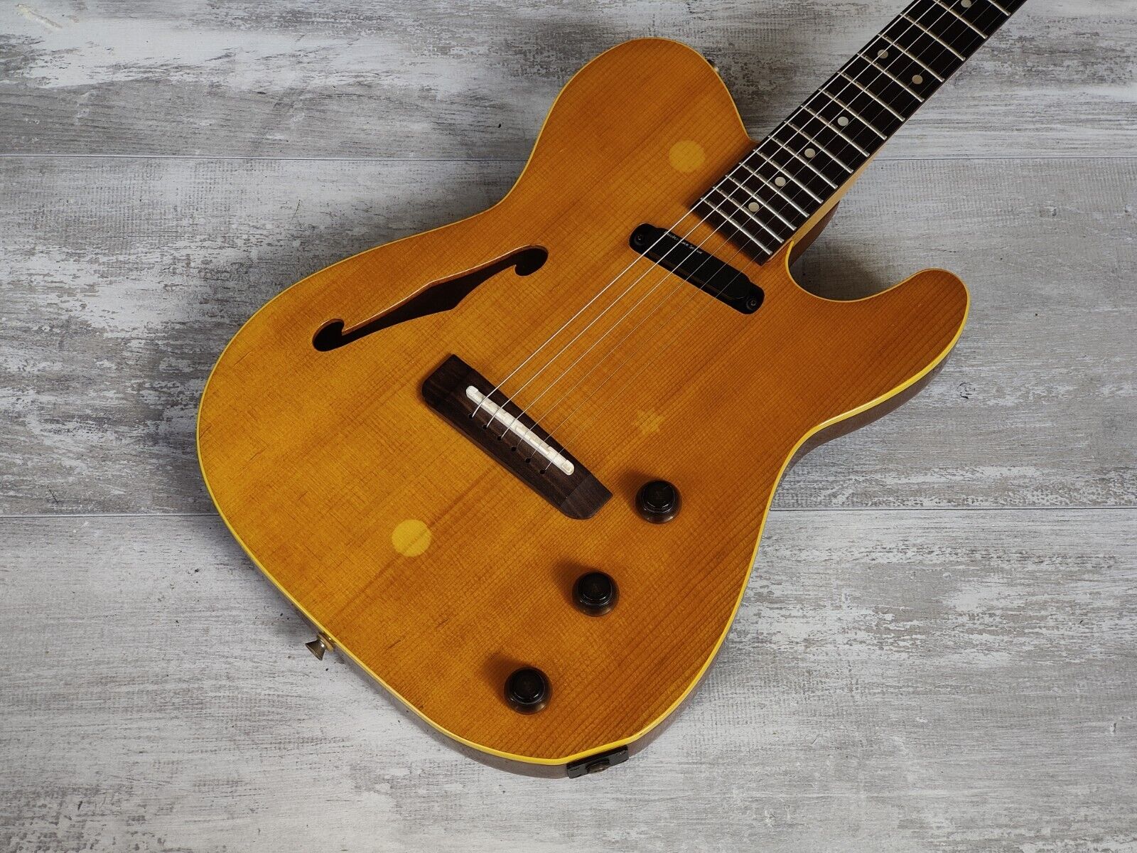 Japanese made in 1991, this is one part of the Fender Japan Electric Acoustic series of electric-sized guitars with acoustic design elements. Telecaster size and shape with a spruce top, mahogany back, maple neck and 22 fret rosewood fingerboard (12" radius, 648mm scale length), it weighs 3kg's. Loaded with a Lace Sensor Burton Silver single coil in the neck position and a Piezo in the bridge controlled by master volume, piezo tbx and balancer knobs to give you a full range of electric, acoustic and blended tones.