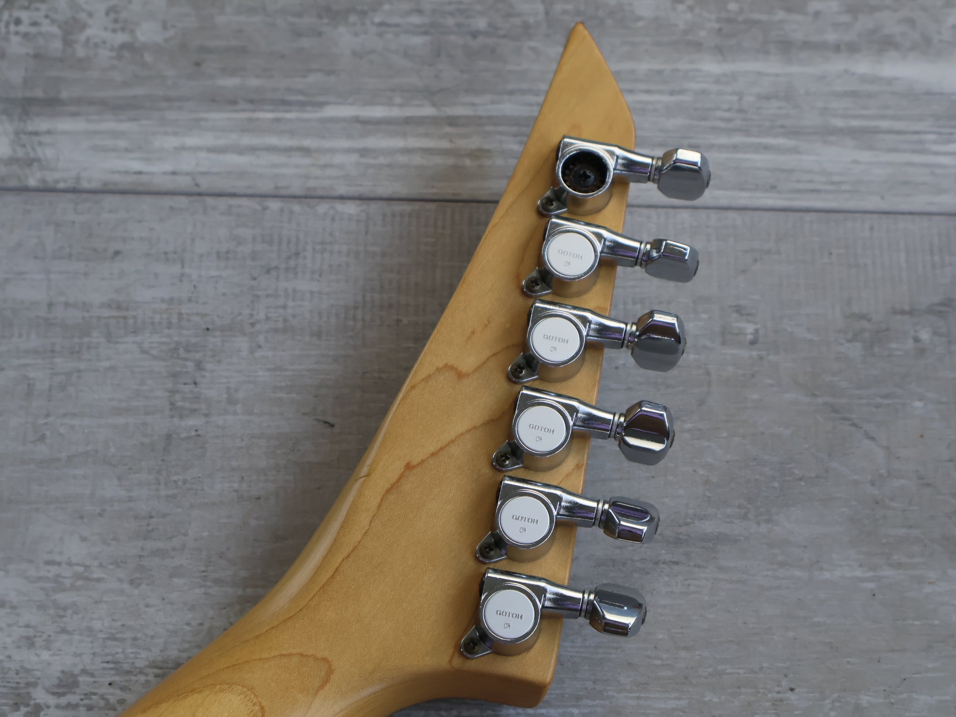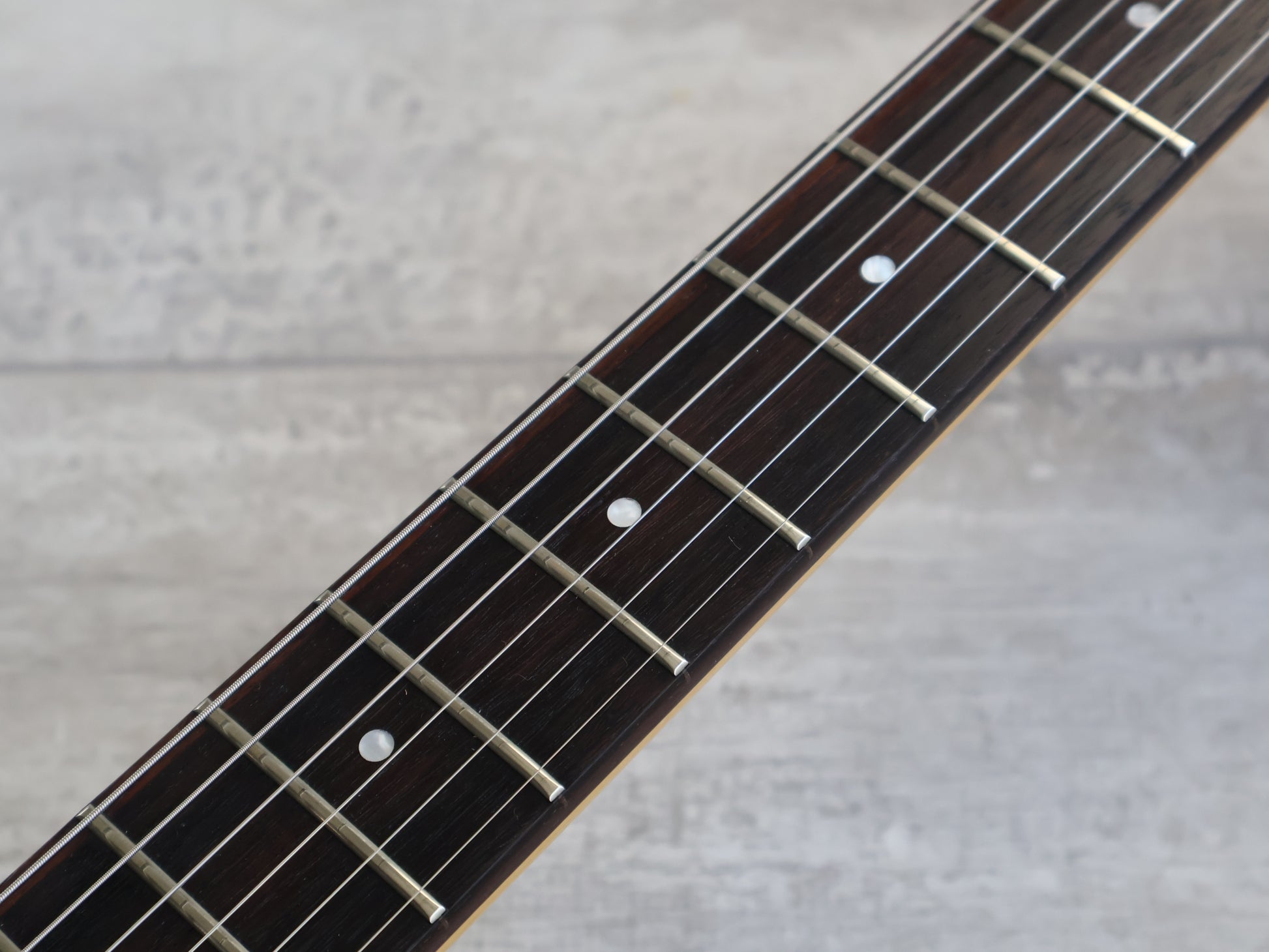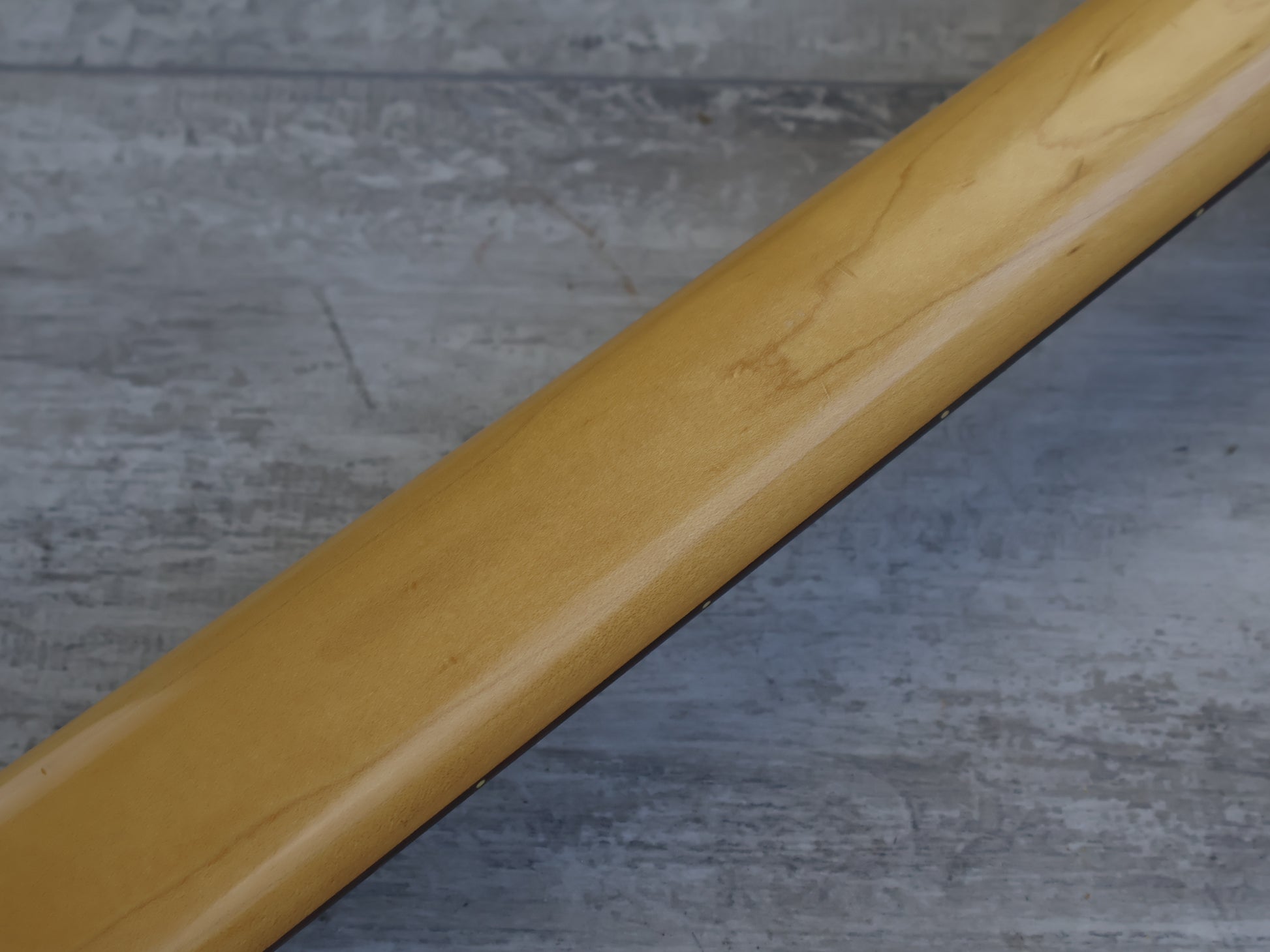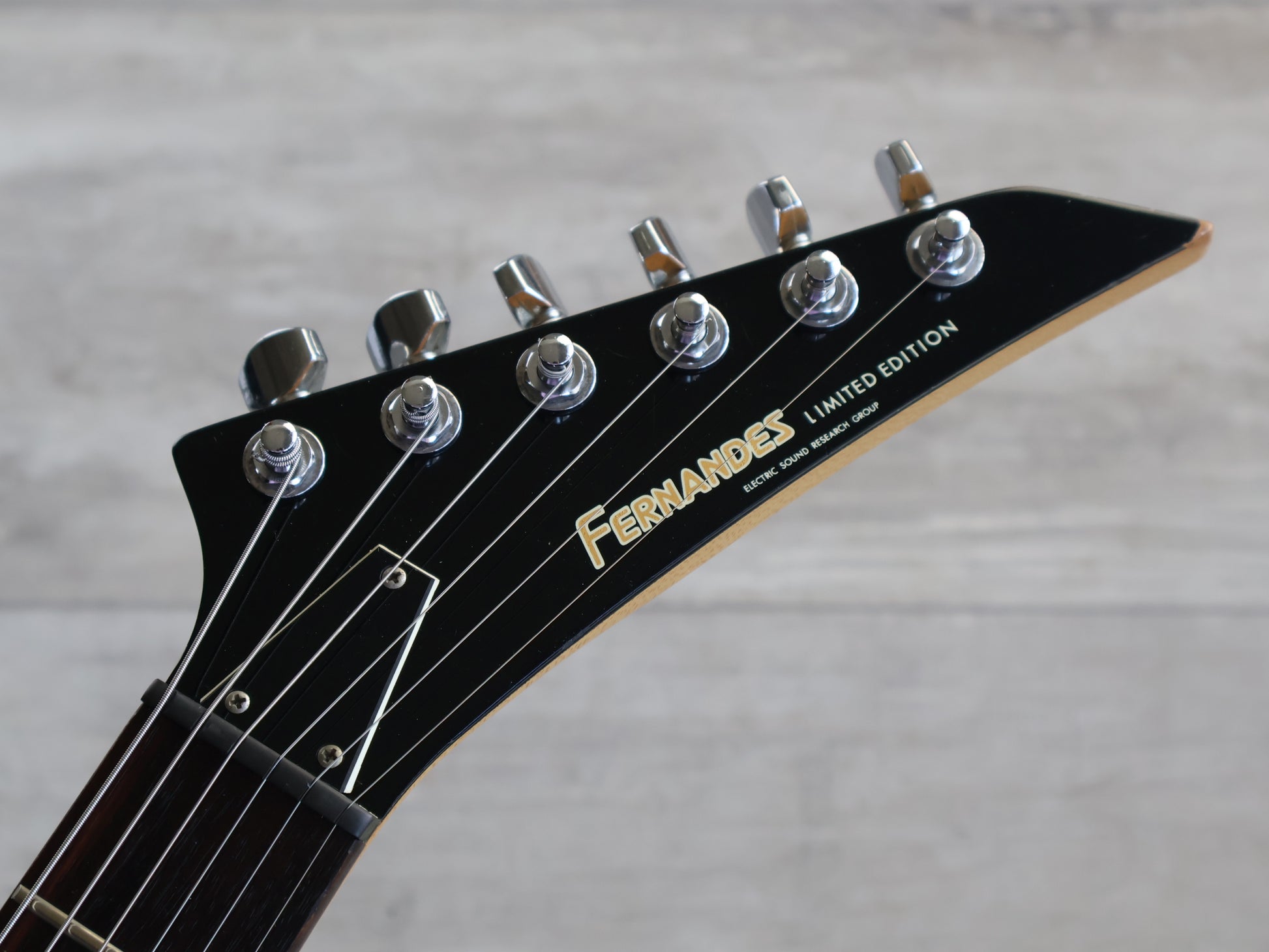 Made in Japan by Fernandes in 1991, the TEJ is an ultra-modern variation on the Fender Telecaster design. Basswood body bolted to a painted maple neck with a 22 fret rosewood fingerboard (13.75" radius, 648mm scale length, 43mm nut width), it weighs 3.8kg's.