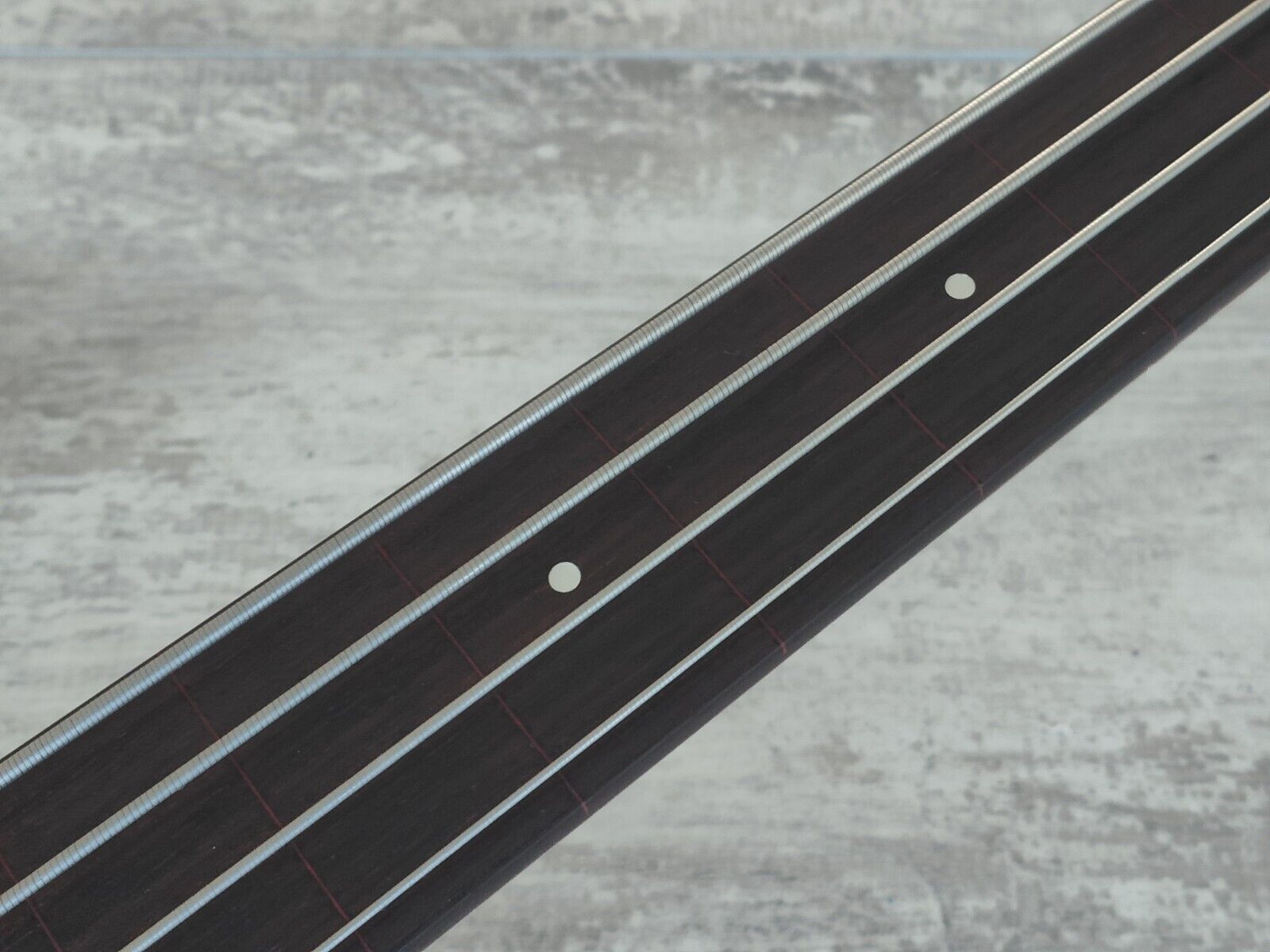 Serviced and restrung prior to listing along with a professional fretless conversion with red stained maple veneer fretlines and flatwound strings. It has a straight neck with an adjustable truss and only basic signs of wear as pictured.
