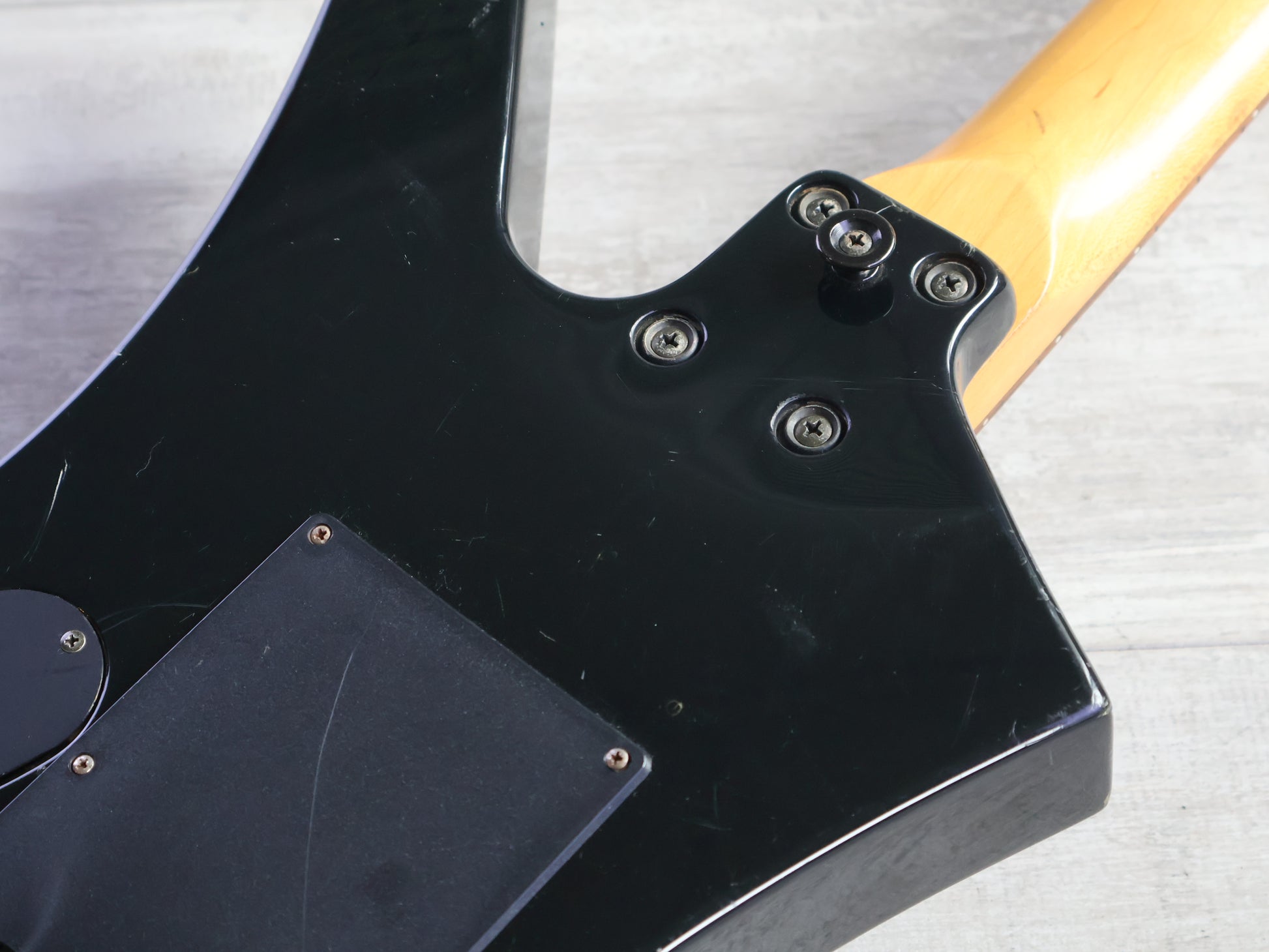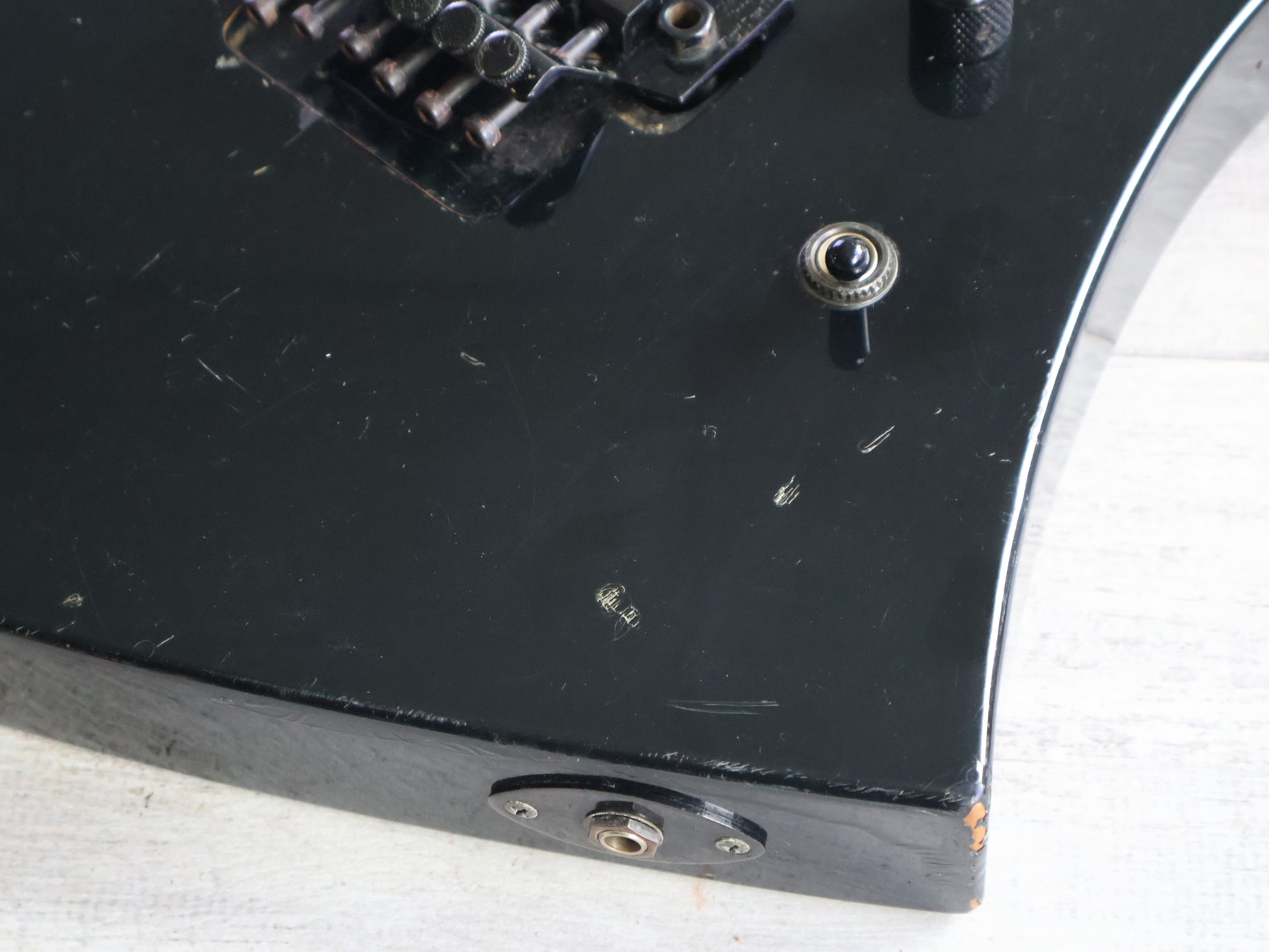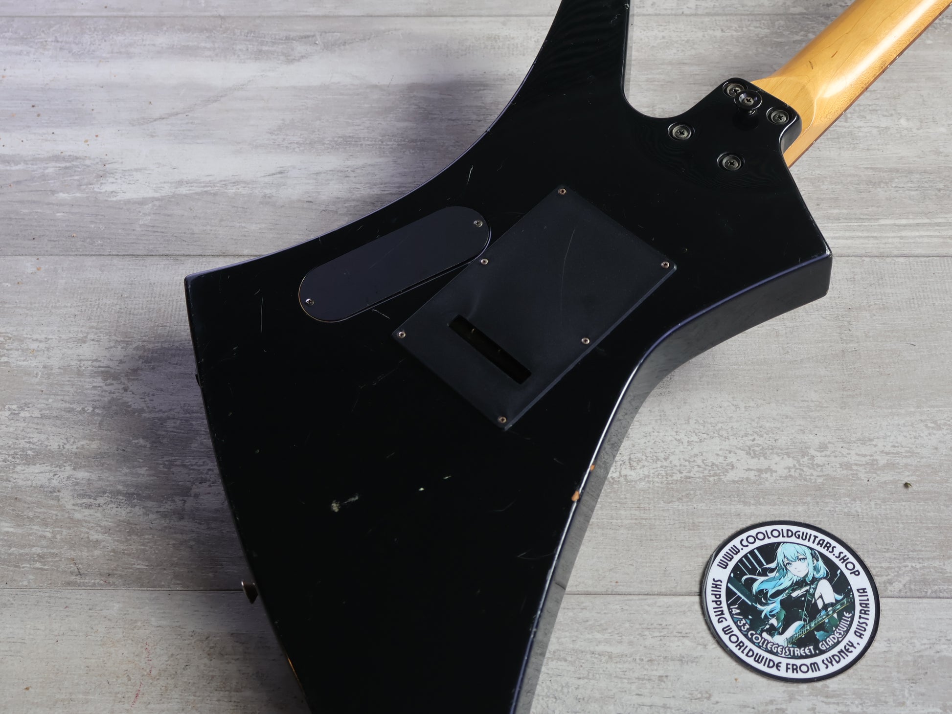 Made in Japan in 1991, this is a Japanese market Exclaim series Kelly from Charvel Jackson. Poplar body with a gloss black finish, maple bolt on neck with a 24 fret unbound rosewood fingerboard (648mm scale length), it weighs 4.1kg's. Loaded with the original Charvel C-50 and C-90 humbuckers and a Charvel branded licensed Floyd Rose locking tremolo system, it's got a very simple one-knob layout with a three-way pickup selector.
