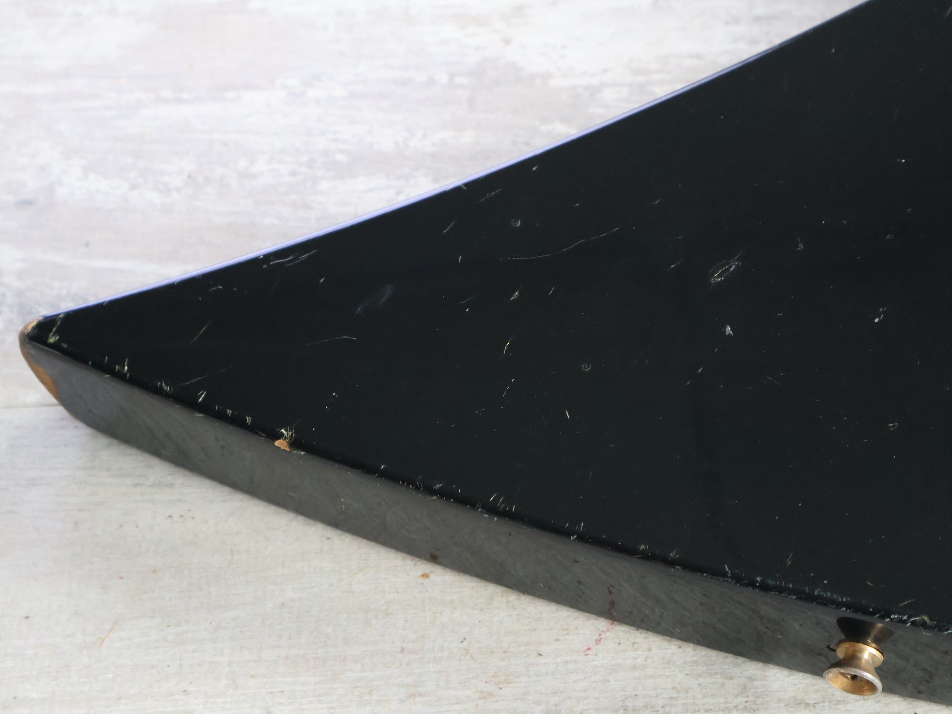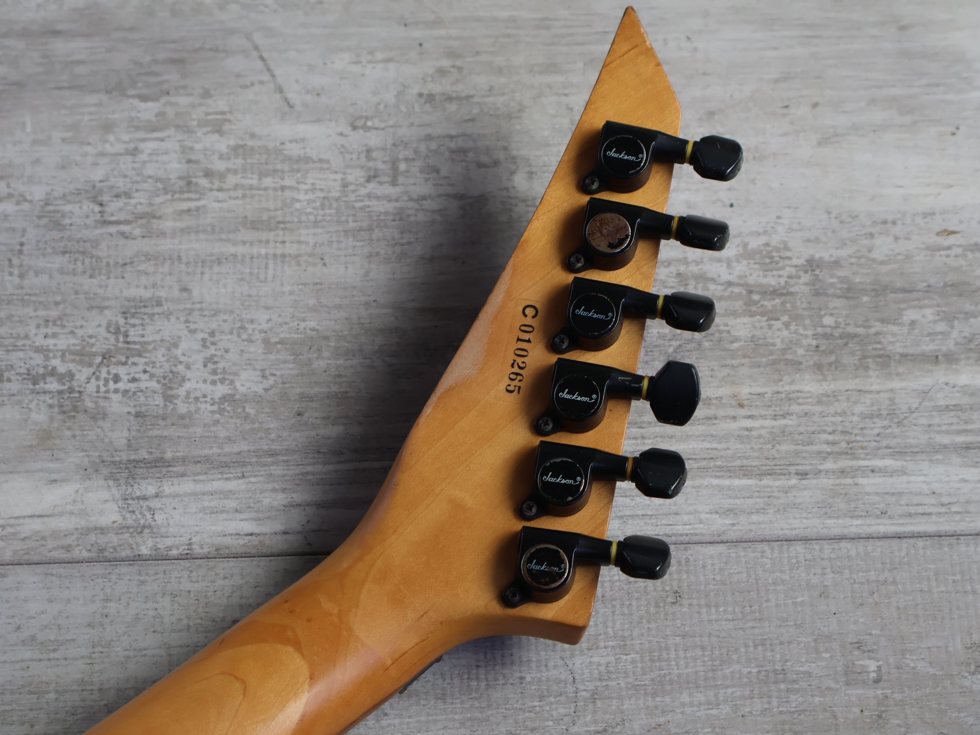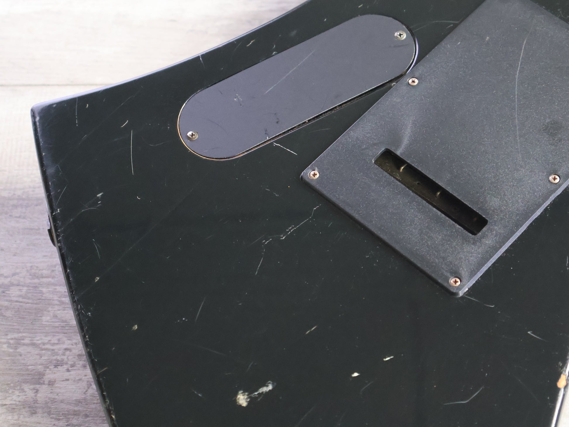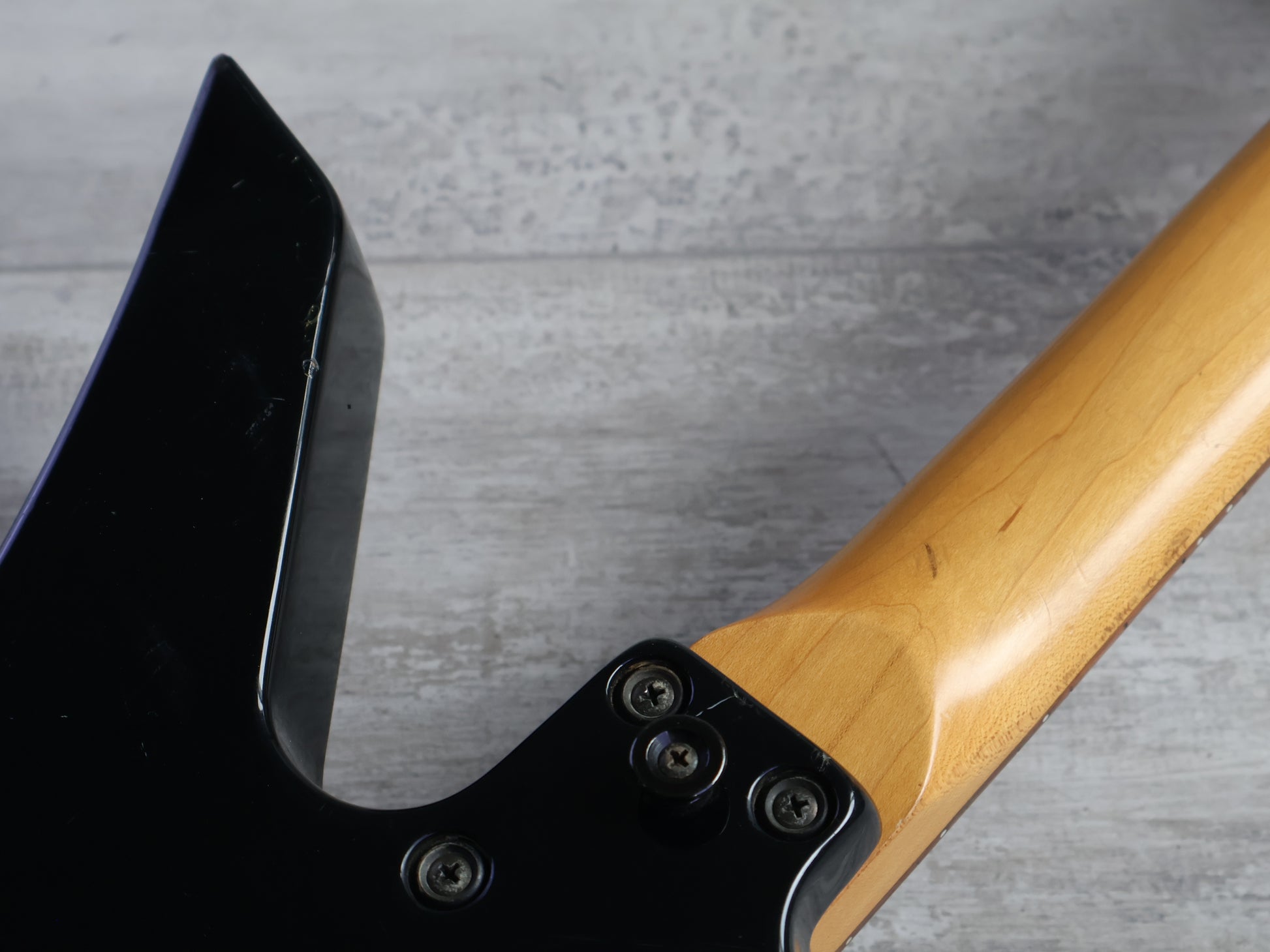 Made in Japan in 1991, this is a Japanese market Exclaim series Kelly from Charvel Jackson. Poplar body with a gloss black finish, maple bolt on neck with a 24 fret unbound rosewood fingerboard (648mm scale length), it weighs 4.1kg's. Loaded with the original Charvel C-50 and C-90 humbuckers and a Charvel branded licensed Floyd Rose locking tremolo system, it's got a very simple one-knob layout with a three-way pickup selector.