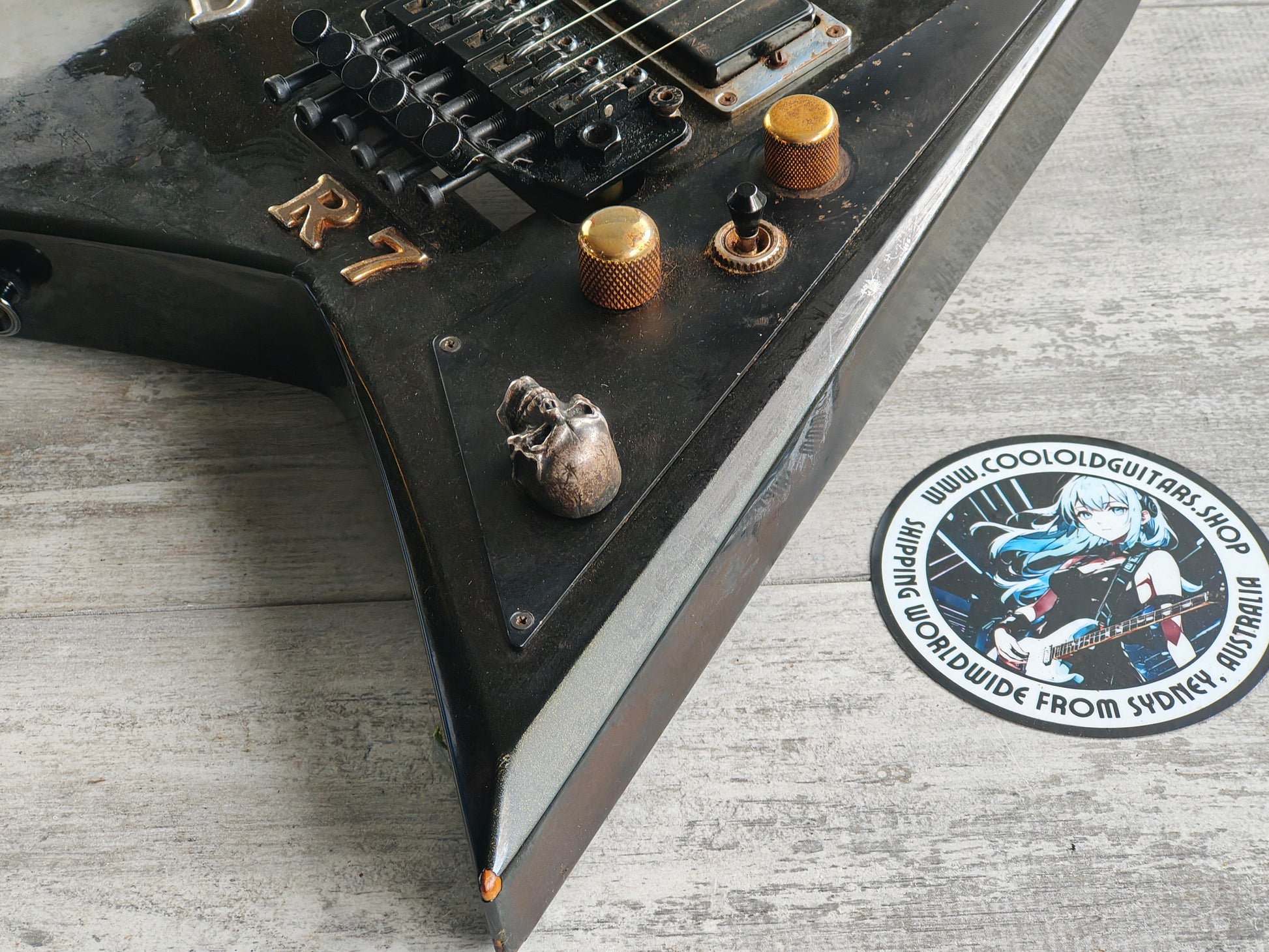 Featuring a Yellow Poplar body and a neckthrough construction maple neck with a bound ebony fingerboard (24 frets, 648mm scale length), it weighs 3.4kg's. This one's loaded with the original EMG85 in the bridge position and a replacement TRS-202 locking tremolo system and still wears some of the previous owners stickers on the guitar and case. They're easily removed but we left them on because they suit the vibe.