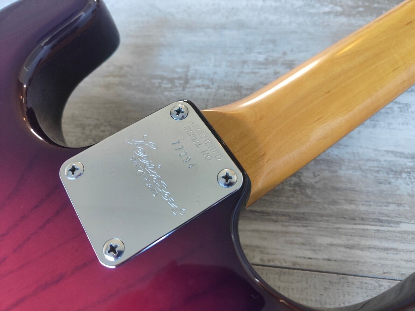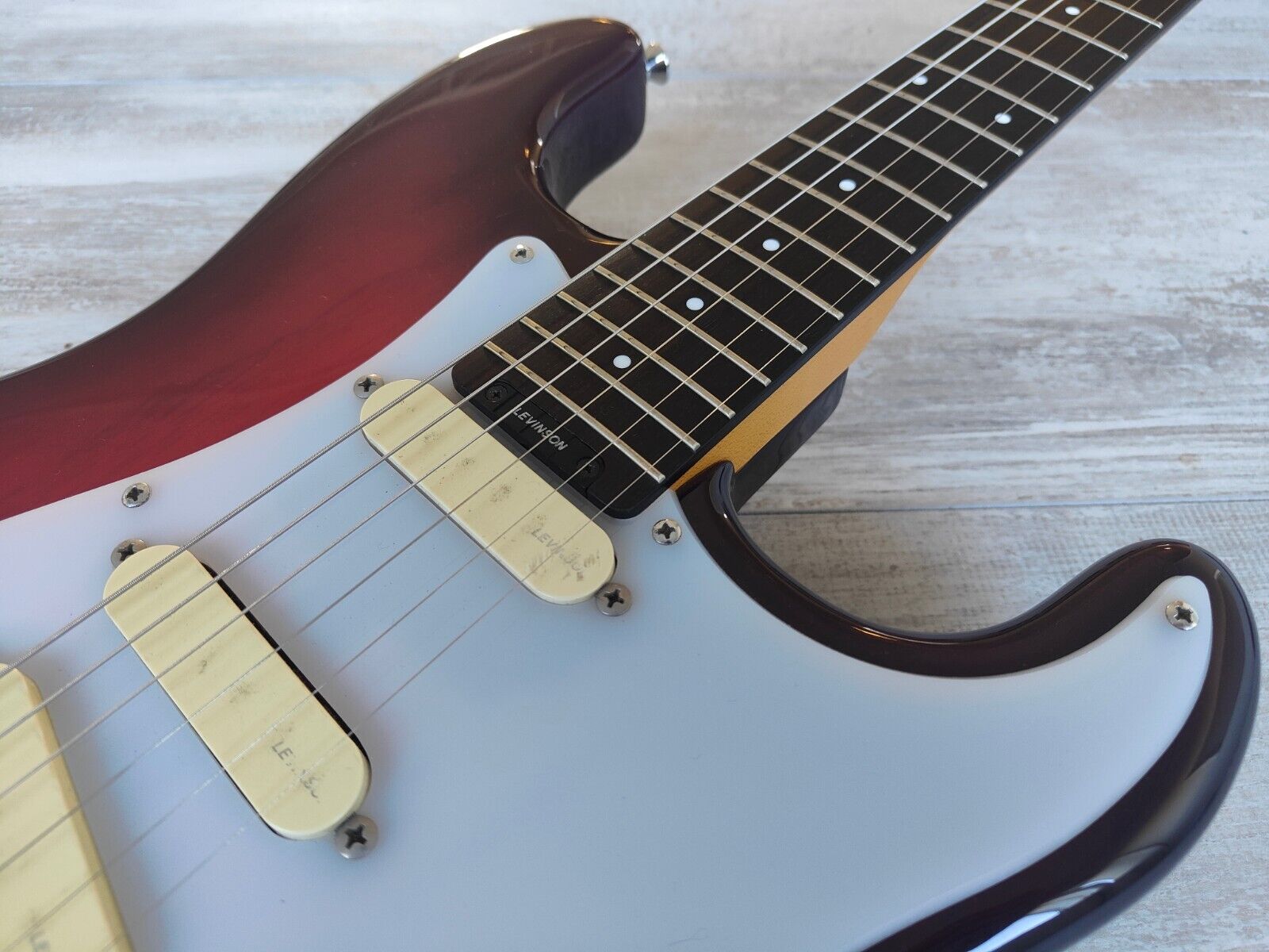Made in Japan under the eye of the Swiss company famous for their high quality electronics, this Levinson Blade is a passive RR-4 model. Two piece Southern White Ash body with a slim maple neck and ebony fretboard (22 frets), it weighs 3.9kg's. Misty Violet finish with a matching headstock, it's loaded with Levinson MDN passive single coil pickups wired in a HSS configuration controlled by master volume and tone knobs, a 5-way pickup selector and a "pickup character" mini toggle to boost the overall signal. Other features include Sperzel TRIMLOK tuners, BLADE FT-3 tremolo system and an acrylic resin pickguard.
