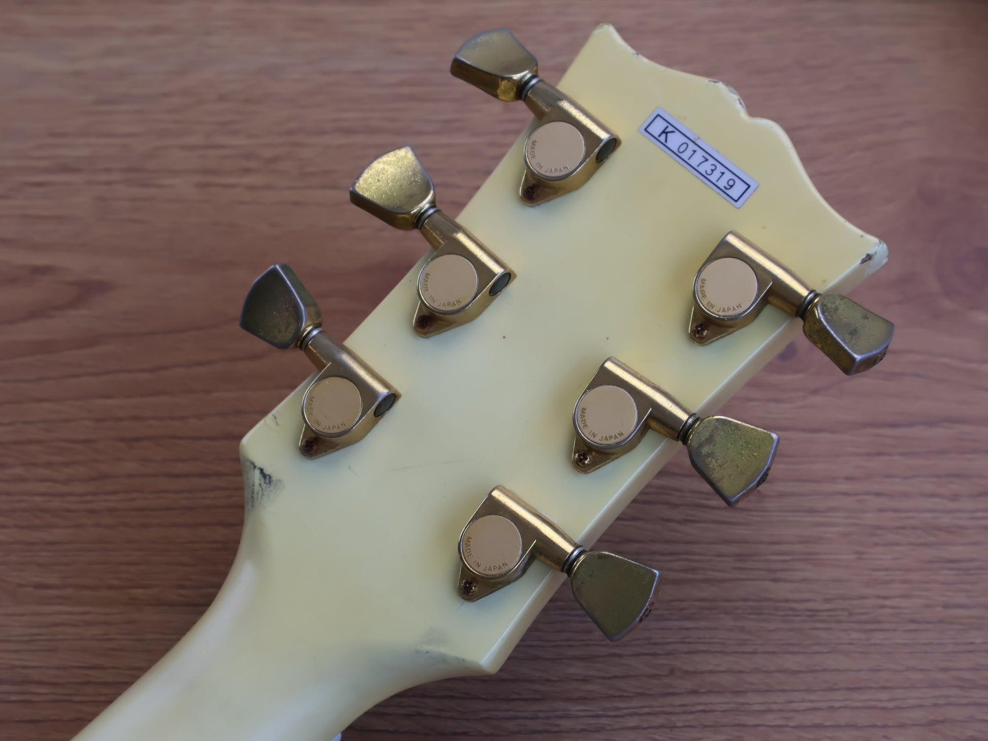 Mahogany body with a maple top, slim 60's mahogany neck and bound rosewood fingerboard (dark enough that it looks ebony), it weighs 4.1kg's. Loaded with Japanese humbuckers and electronics along with Japanese hardware and Gotoh style tuners, the bridge has seemingly been replaced otherwise it looks to be original.