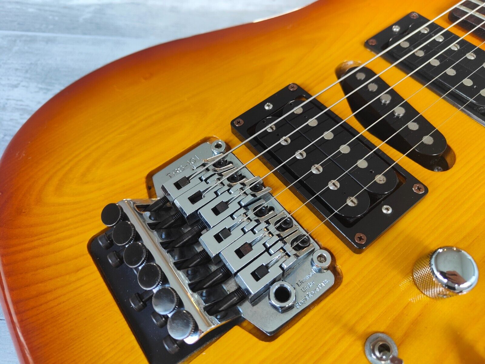 A higher end model from the Aria Pro II Magna Series of 1992, the MA-75 has a carved sen (ash) body with a slim maple neck and a 22 fret rosewood fingerboard (13.75" radius, 628mm scale length), weighs 3.4kg's. Loaded with factory 2AL HSH pickups controlled by volume/tone knobs, a 5-way switch and coil split toggle, chrome Gotoh tuners and a TRS-101 Floyd Rose tremolo system.
