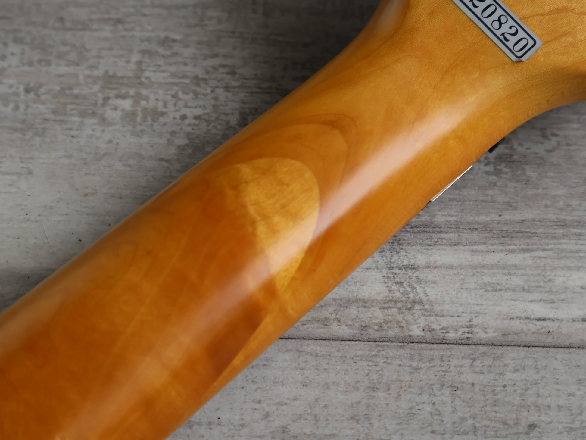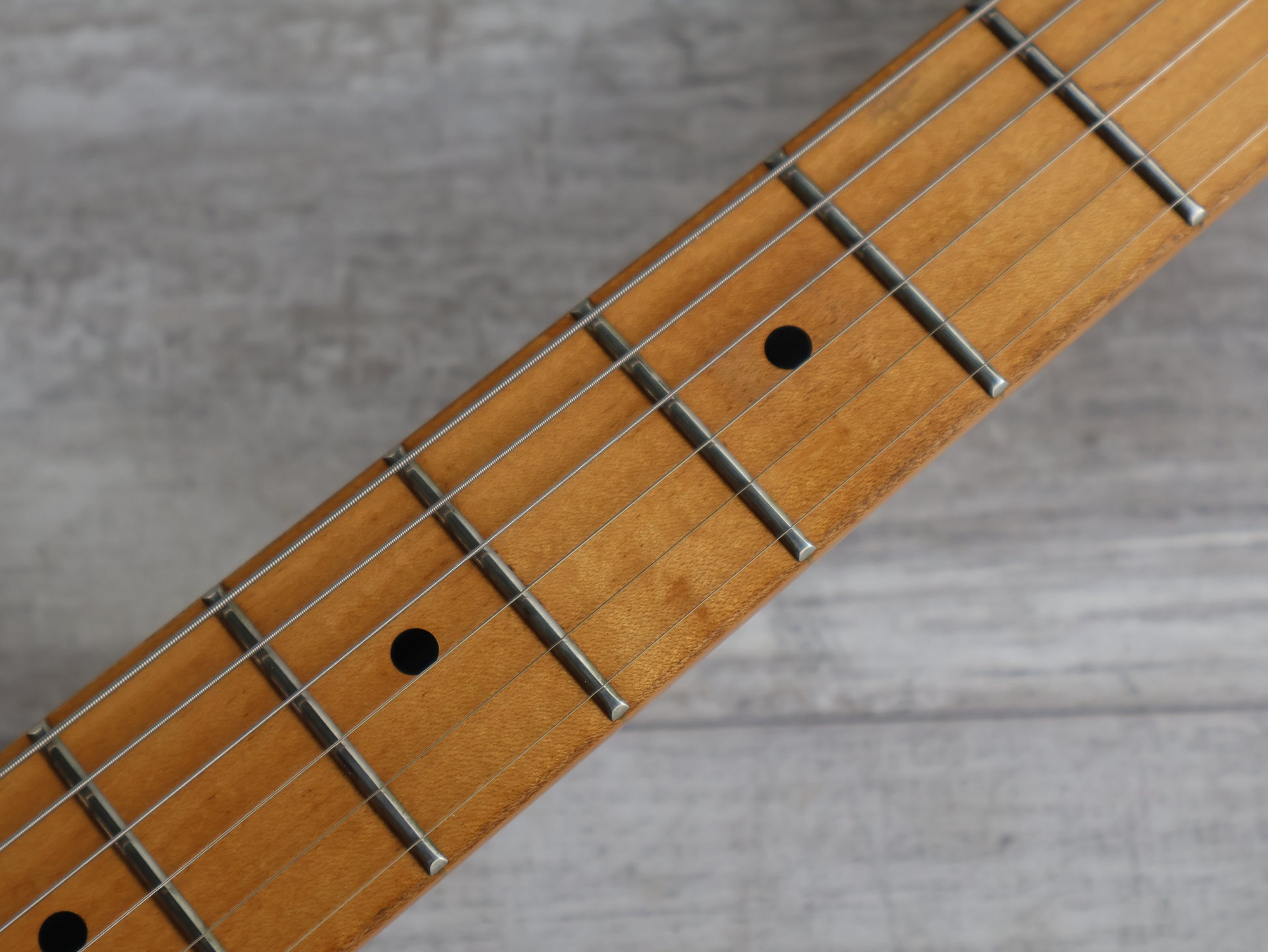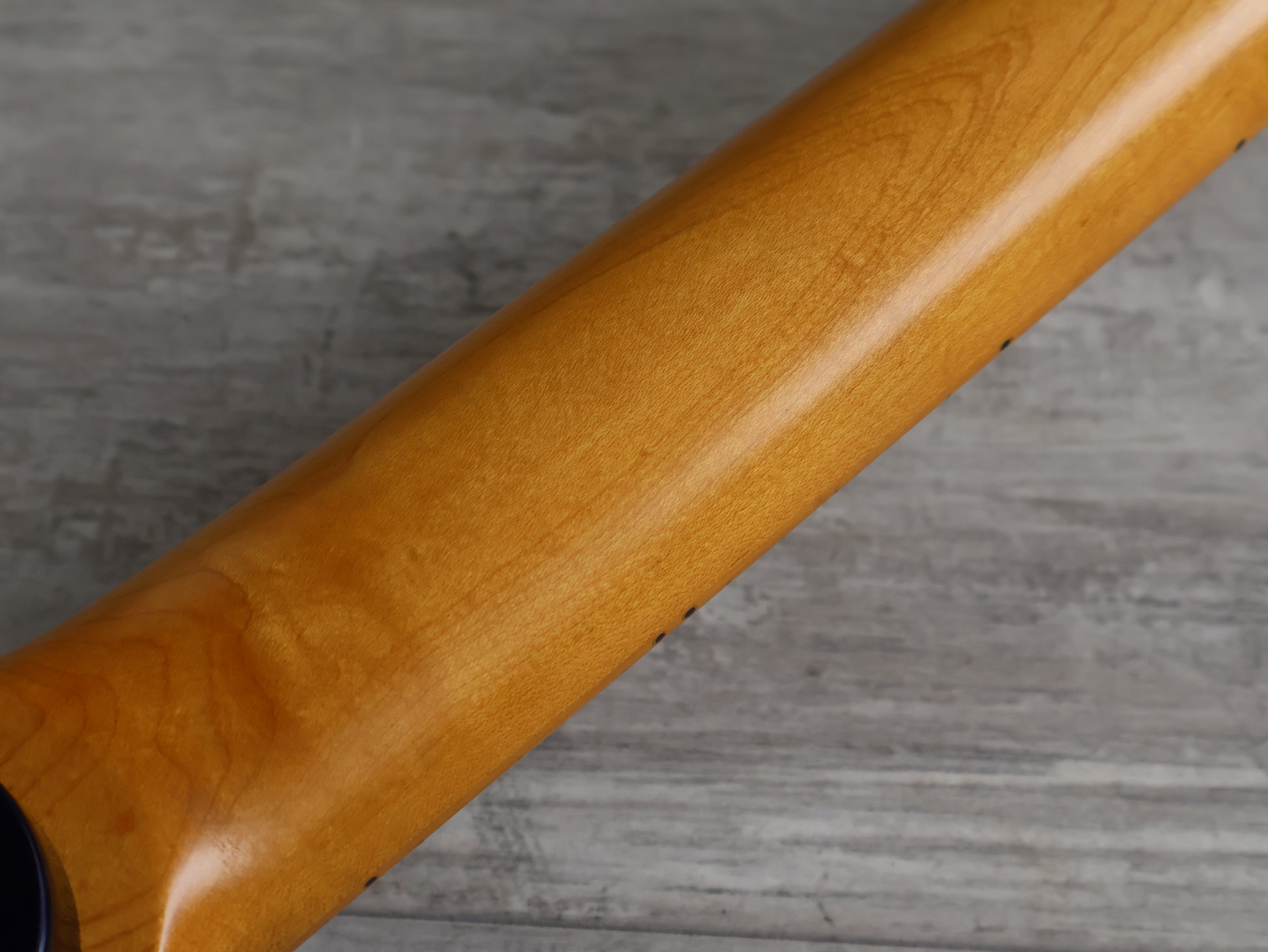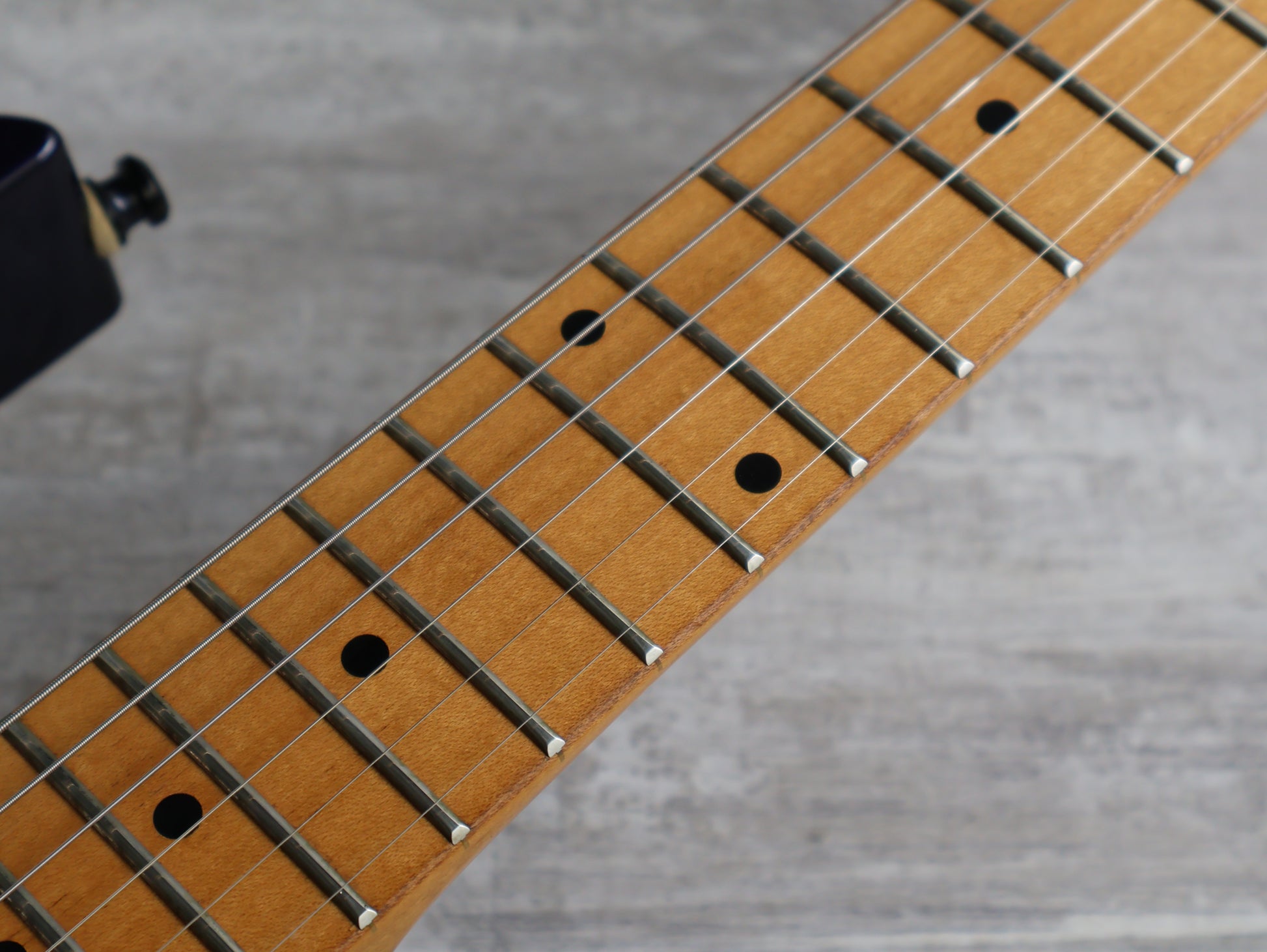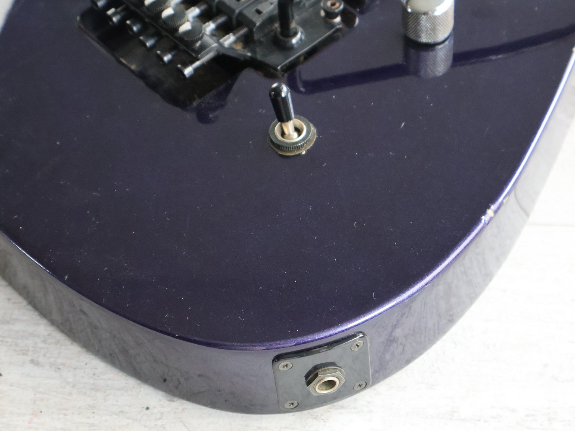 ST style maple body bolted to a maple neck with a 22 fret maple fingerboard (648mm scale length, 43mm nut width), it weighs 3.9kg's. Loaded with aftermarket Dimarzio humbuckers controlled by a master volume control and three-way toggle along with the original Gotoh branded tuners and Floyd Rose tremolo system as pictured.