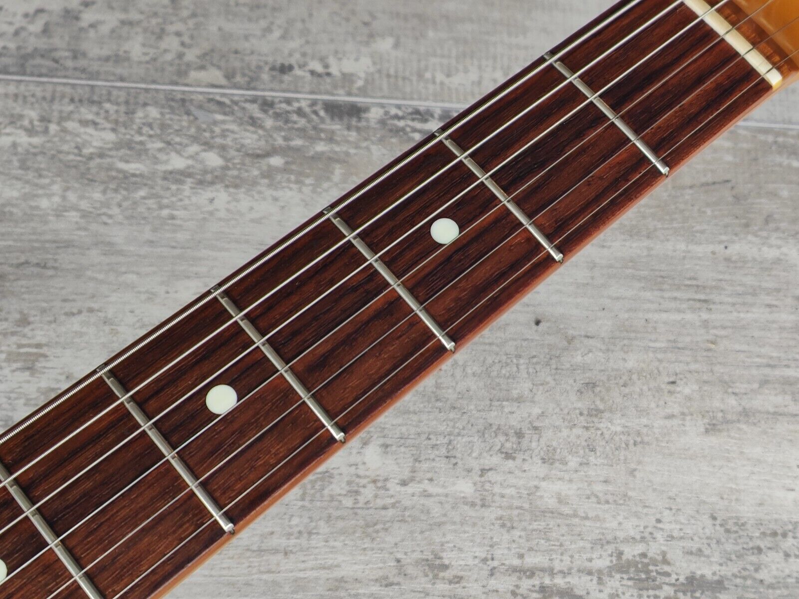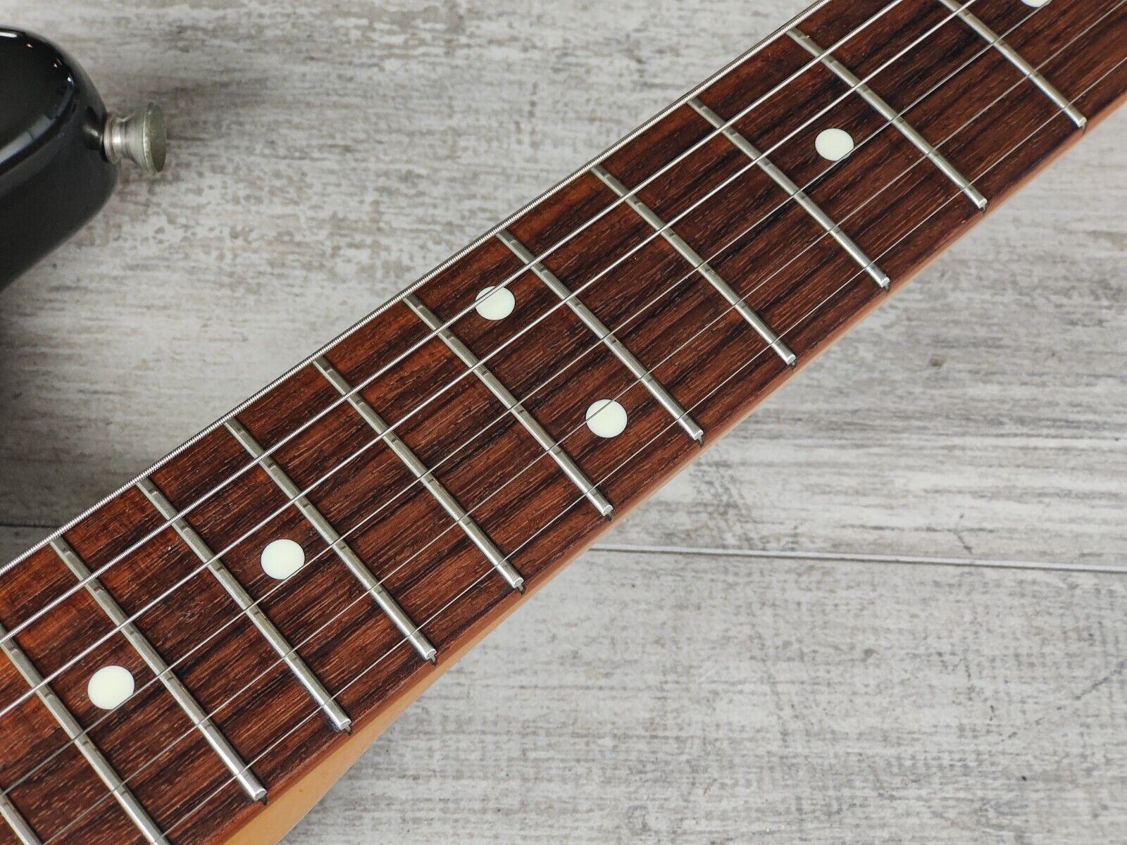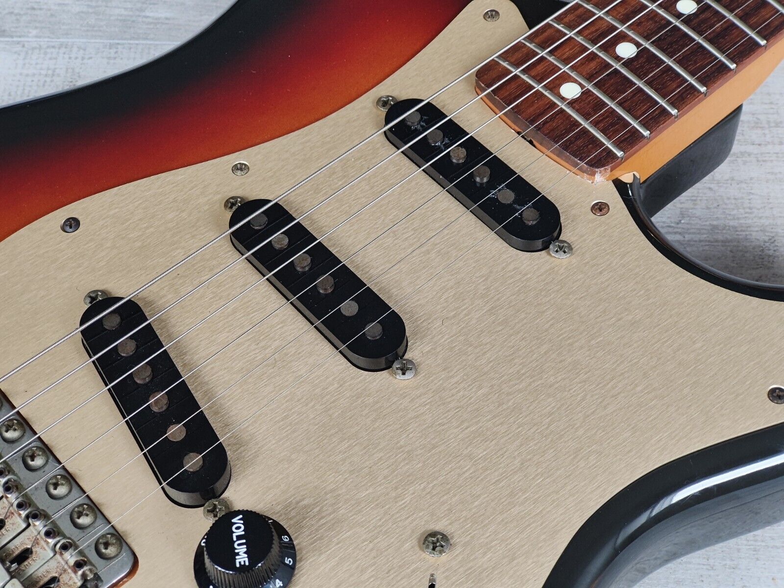 Made by the Fujigen factory in 1992, the ST62-53 was Fender Japan's base model '62 Reissue Stratocaster. Sunburst finish on a basswood body with a maple neck, rosewood fingerboard (7.25" radius), it weighs 3.1kg's. Loaded with the original Fender Japan ST-VINTAGE alnico pickups controlled by a 5-way selector, it's had the pickup covers and knobs replaced to black to match the aftermarket anodised gold pickguard.
