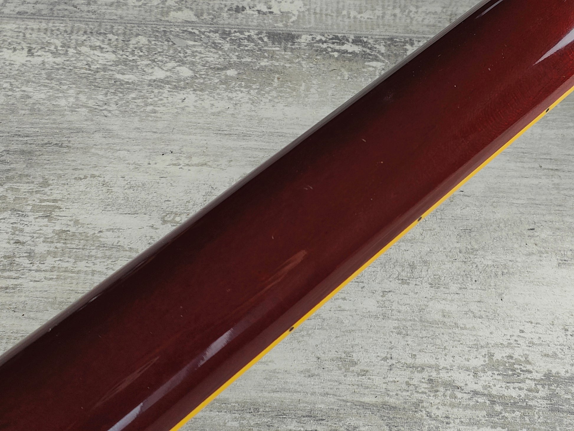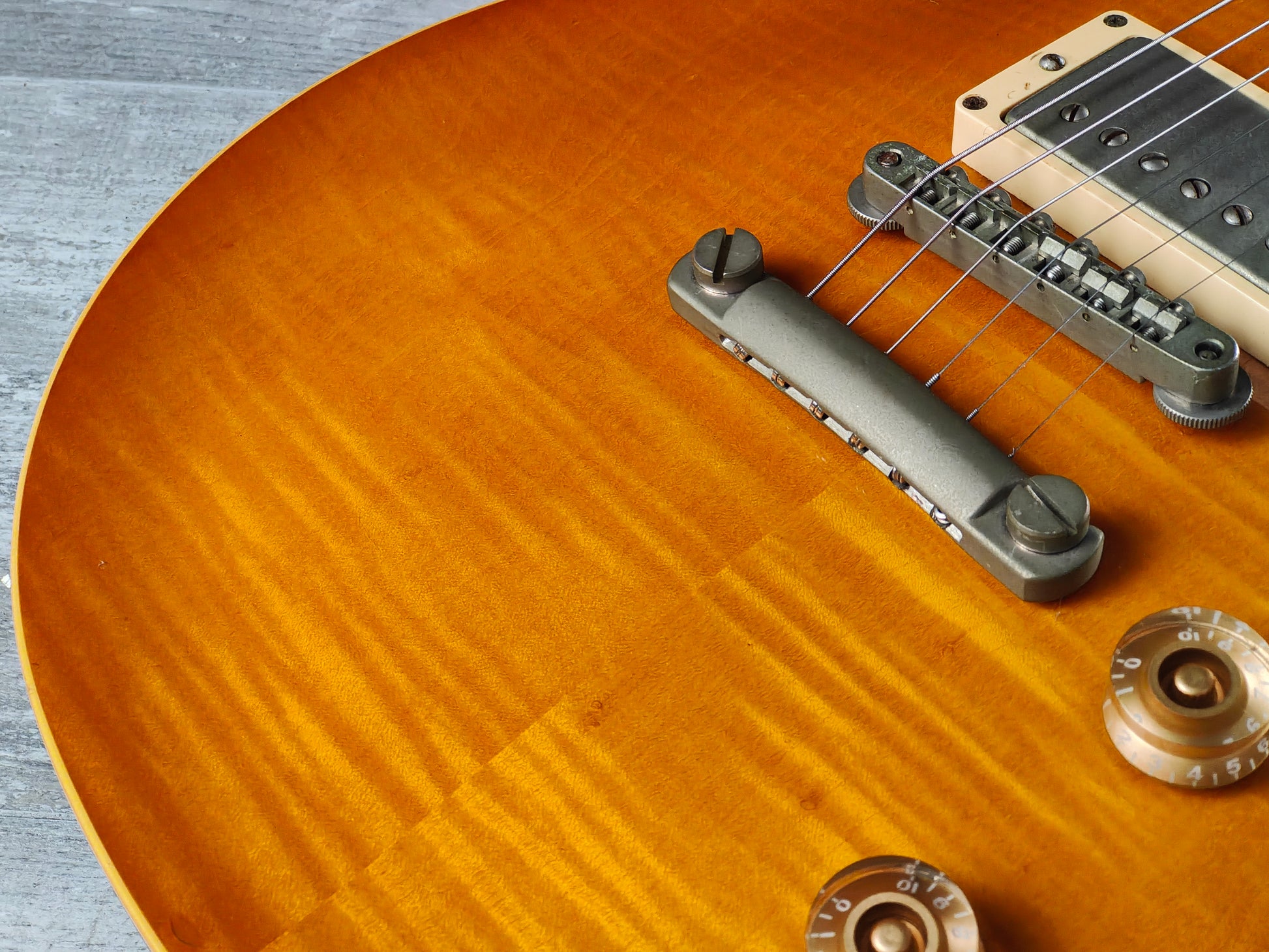 A lesser seen 1990's model from Greco, the EG-90 was a Japanese made Les Paul Standard that continued to solidify their reputation as masters of the affordable Les Paul. With a solid mahogany back paired, lightly carved solid maple top (with a laminate amber flame), long tenon mahogany slim 60's neck and a 22 fret rosewood fingerboard, it weighs a hefty 4.6kg's.