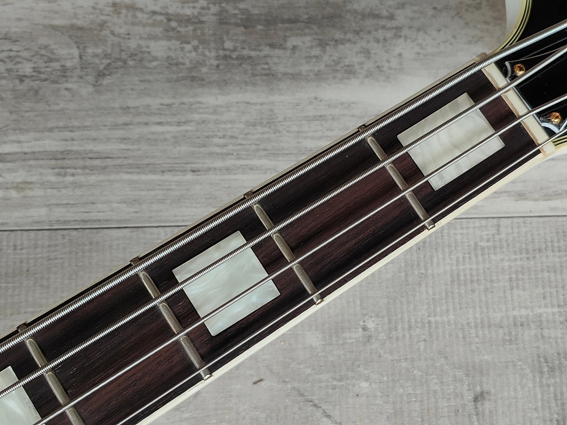 Made in Japan in the 1990 for the Japanese market (hence the blatant Gibson aesthetic with an open book headstock etc), the EGB-850 was Greco's interpretation of a short-scale Les Paul Custom bass. Solid mahogany body with a maple top and set maple neck with a rosewood fingerboard (24 frets, 770mm scale length, 39mm nut width), it weighs 4.8kg's.