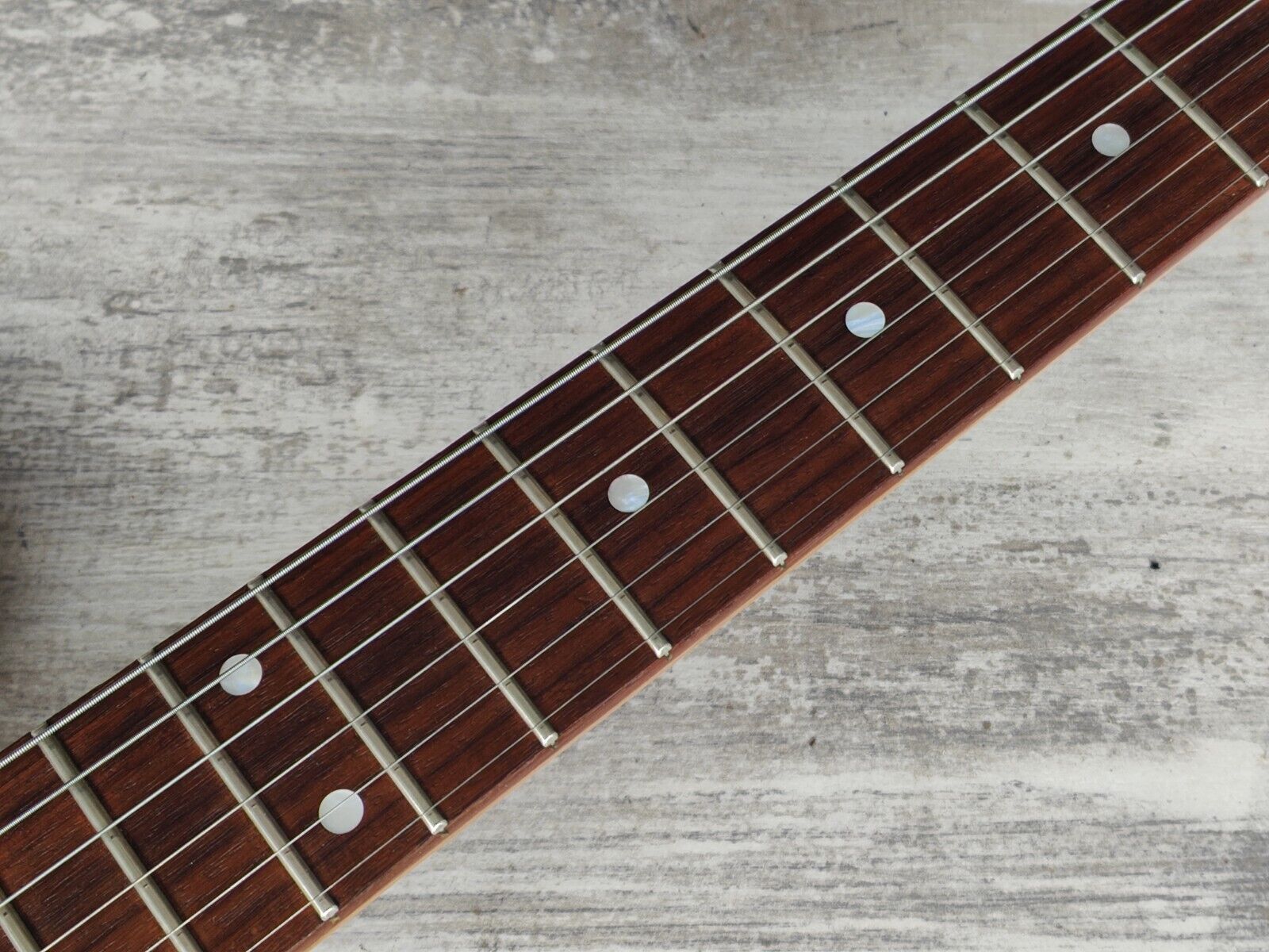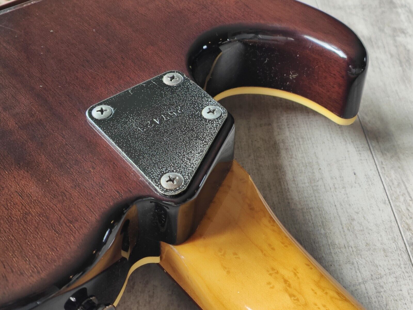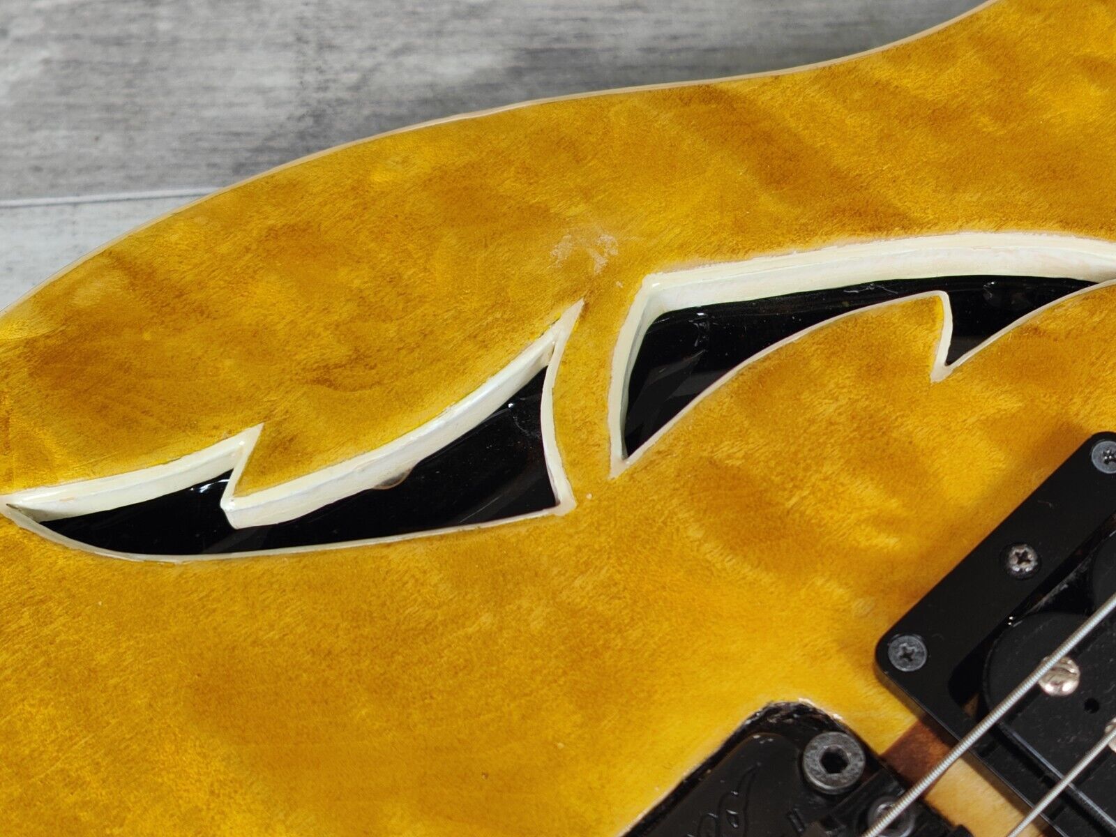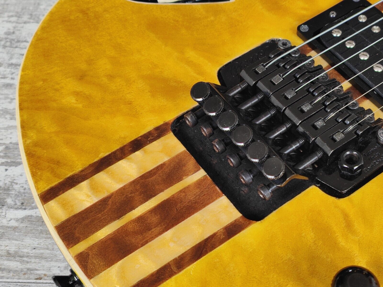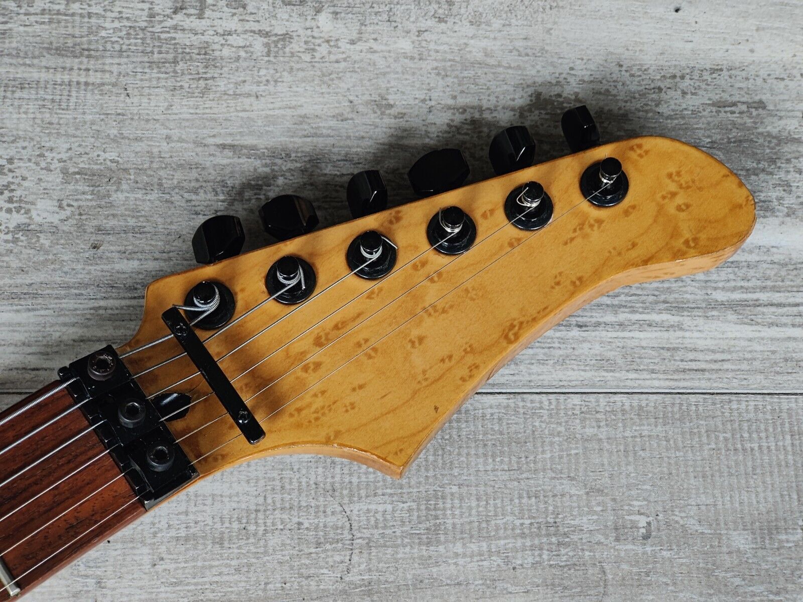 Made in Japan in the early-mid 1990's, the PTR series were original designs that take a lot of inspiration from the Musicman Axis. Made with a mahogany body, maple neck (with a birdseye laminate) and rosewood fingerboard, it weighs 3.4kg's. The previous owner added a custom "f-hole" to the top along with converting the sycamore laminate top into a quilted maple. To quote the person that did the work: "It looks rough when you look at it up close, but at first glance it looks like a high-end guitar".