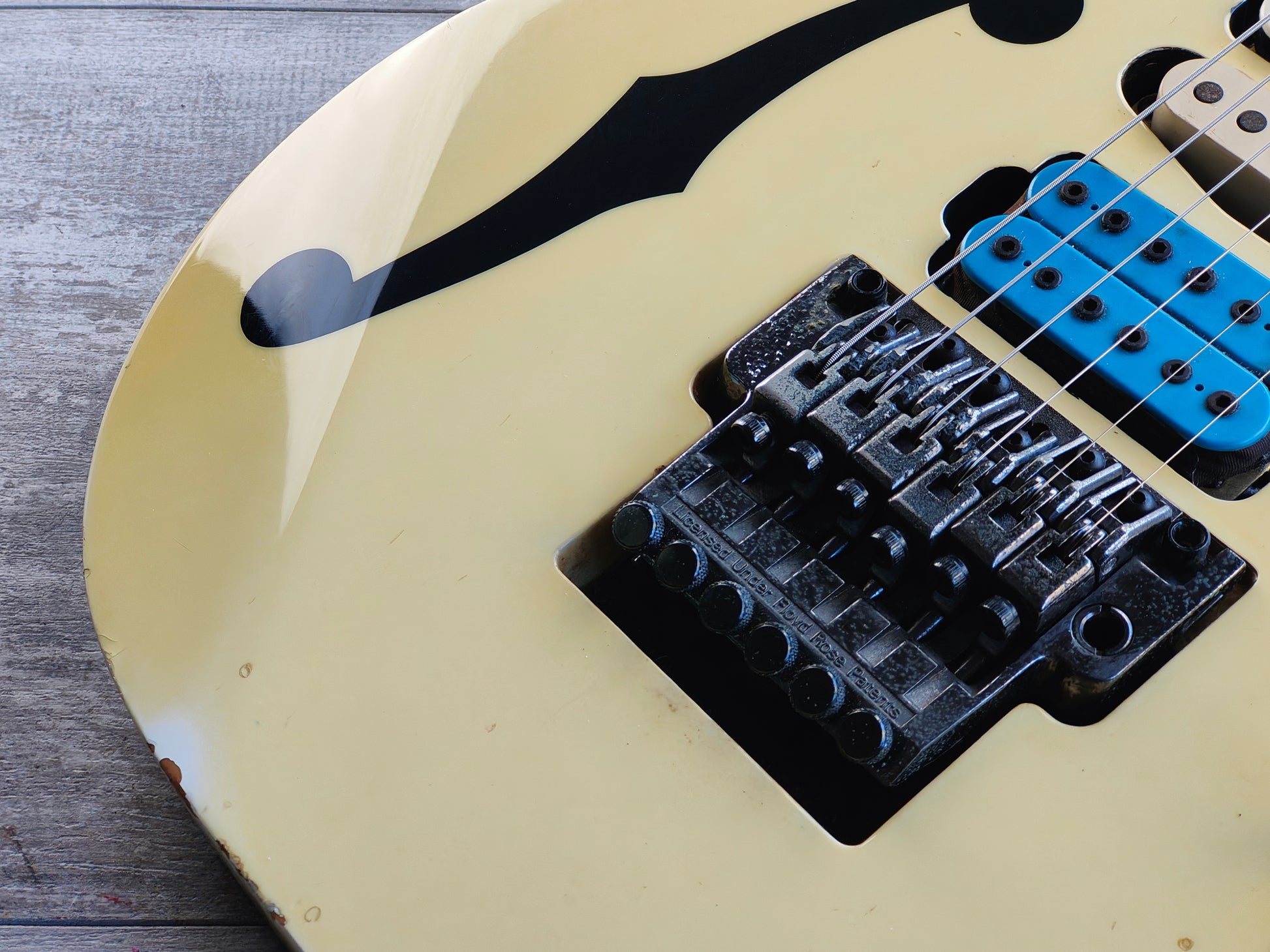 Loaded with the original Dimarzio PAF Pro in the neck position and a FS-1 in the middle with an aftermarket Dimarzio Double Whammy in the bridge position. The original Lo-Pro Edge tremolo still works perfectly and the pots/wiring sound good.