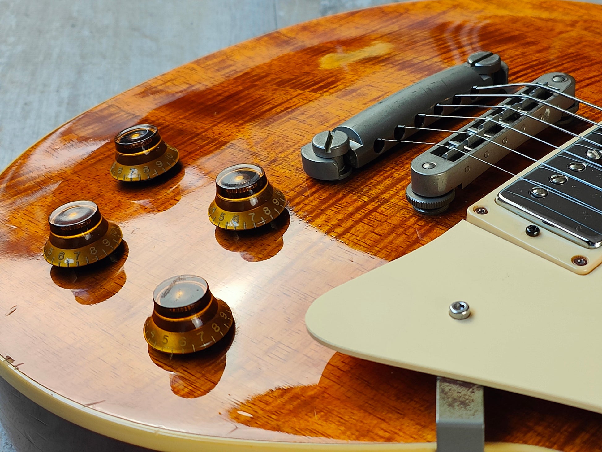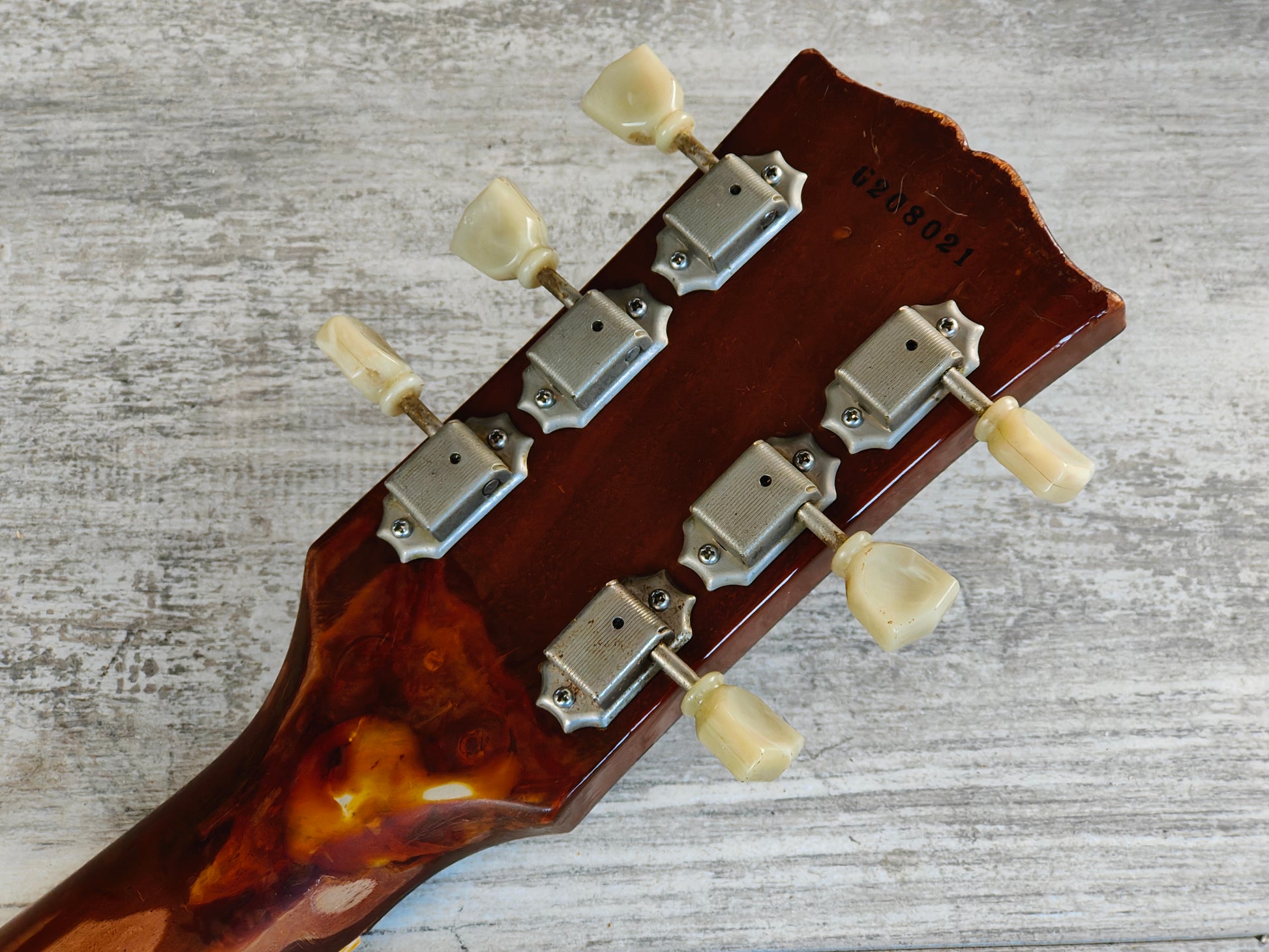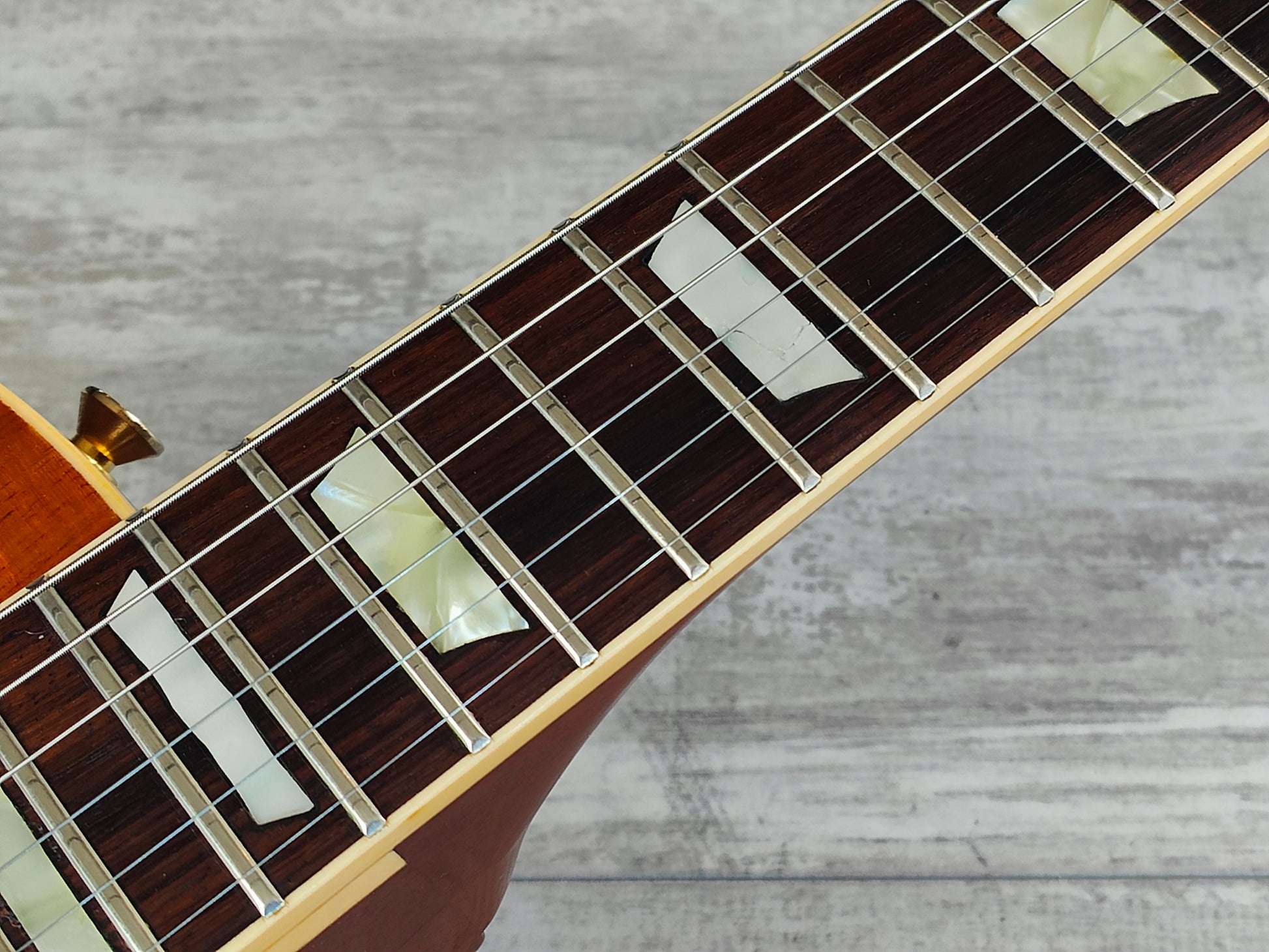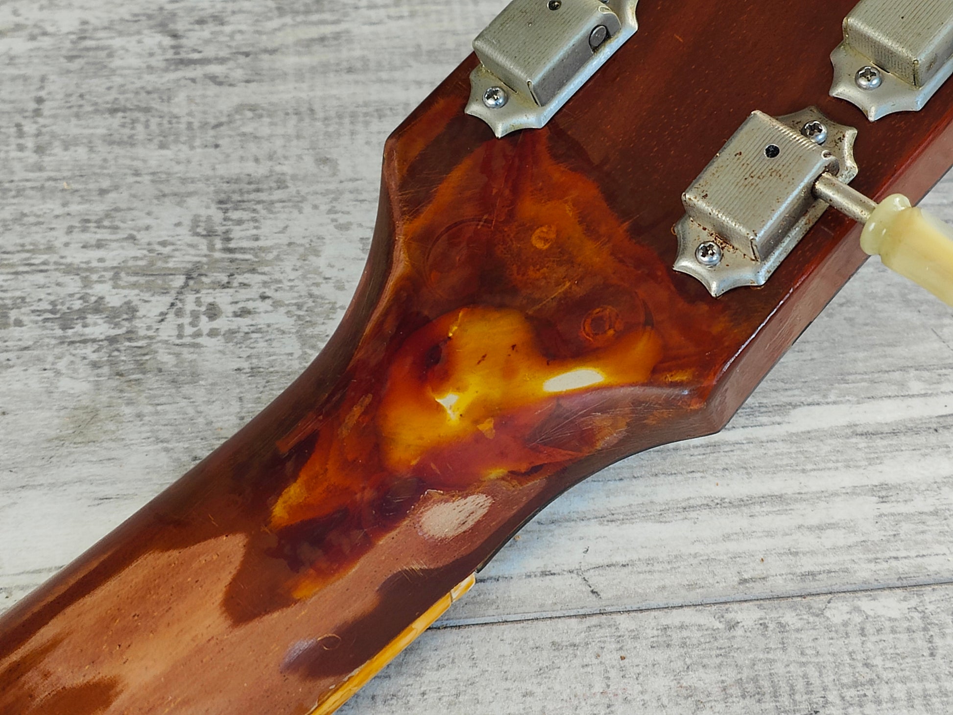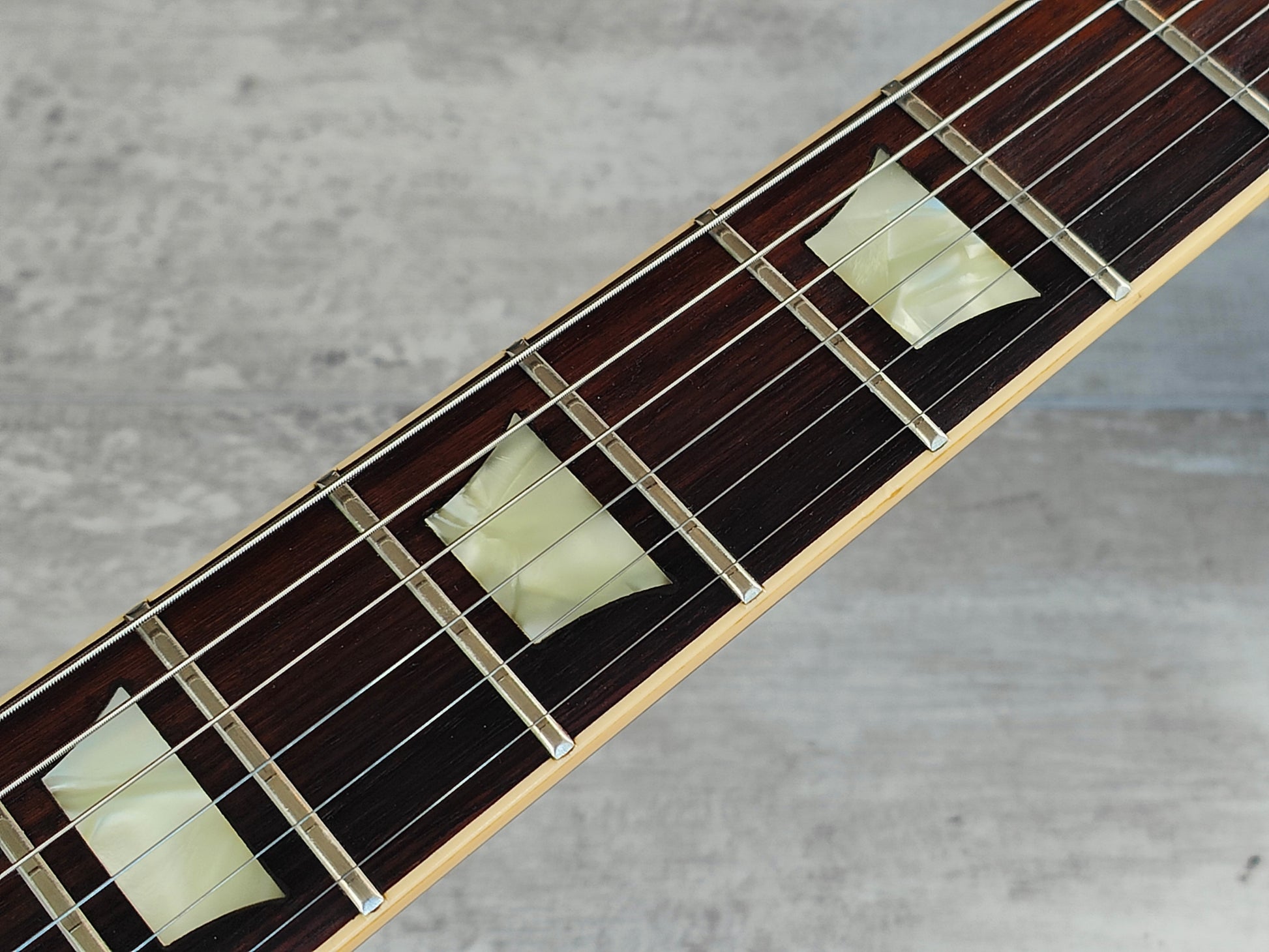 This one has a pair of Gotoh humbuckers installed along with Japanese hardware and wiring (two replacement pots). There's also two replacement inlays that seem to be made of rubber.