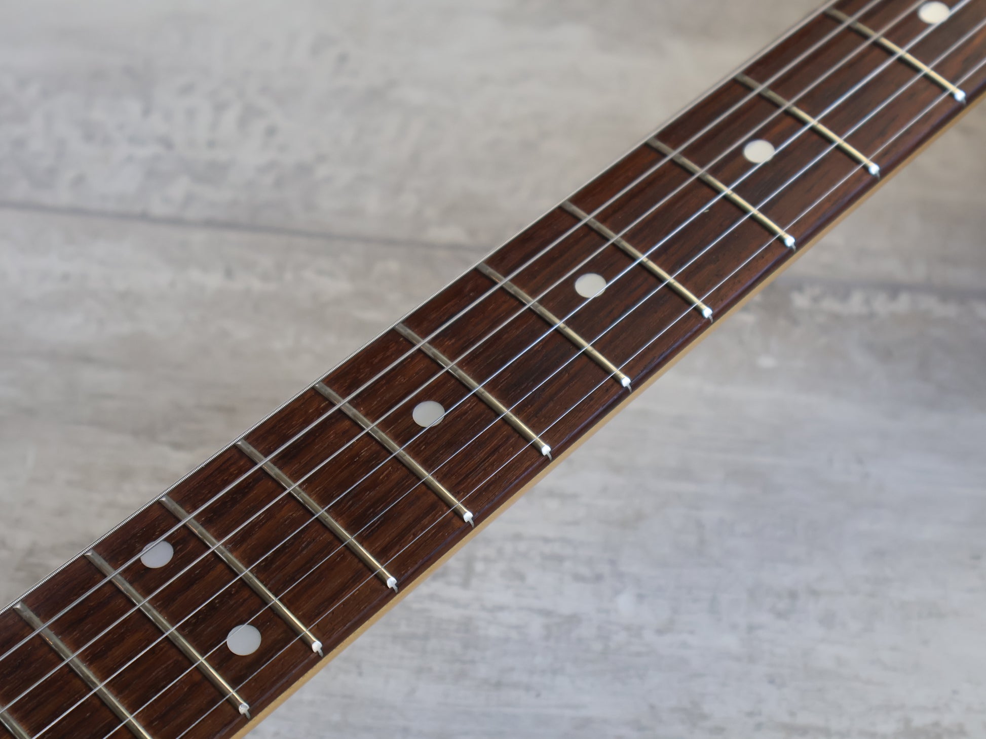 Basswood body bolted to a maple neck with a rosewood fingerboard (7.25" radius, 40mm nut width), it weighs 3.4kg's. Looks to be all original with Gotoh hardware and Fender Japan single coil pickups.