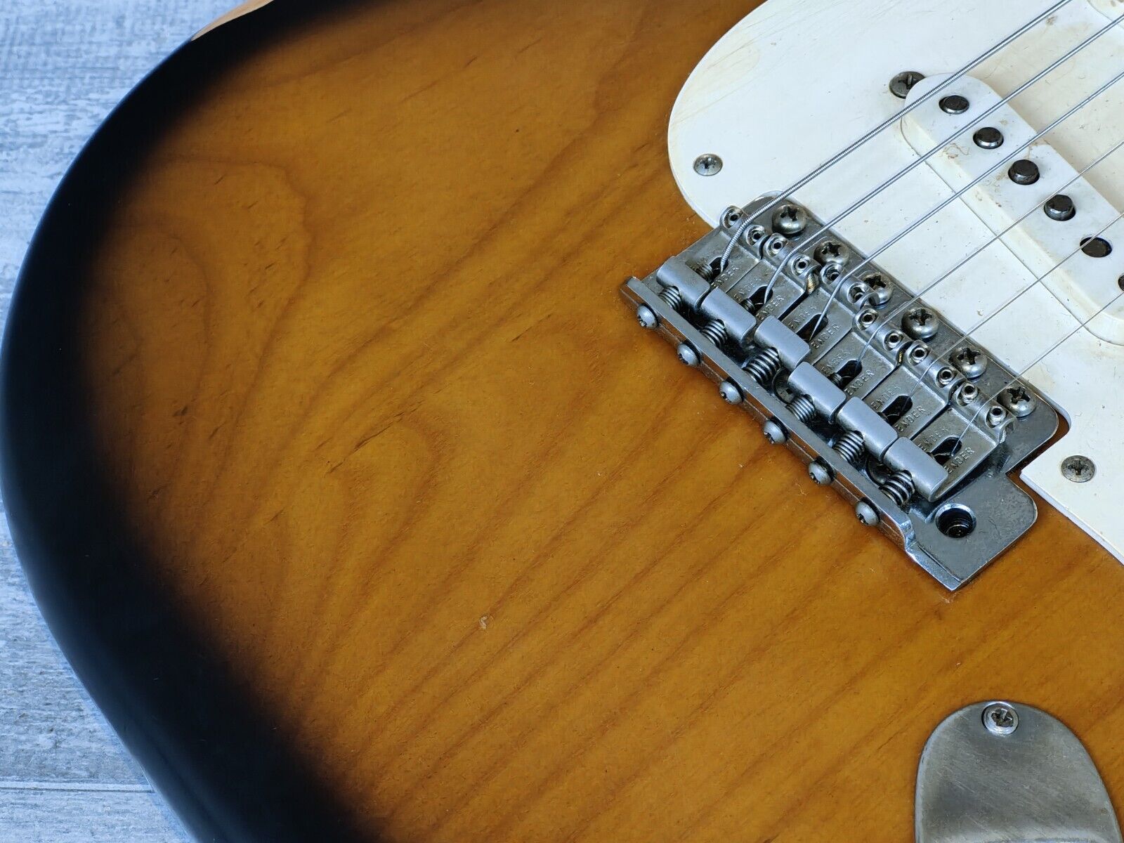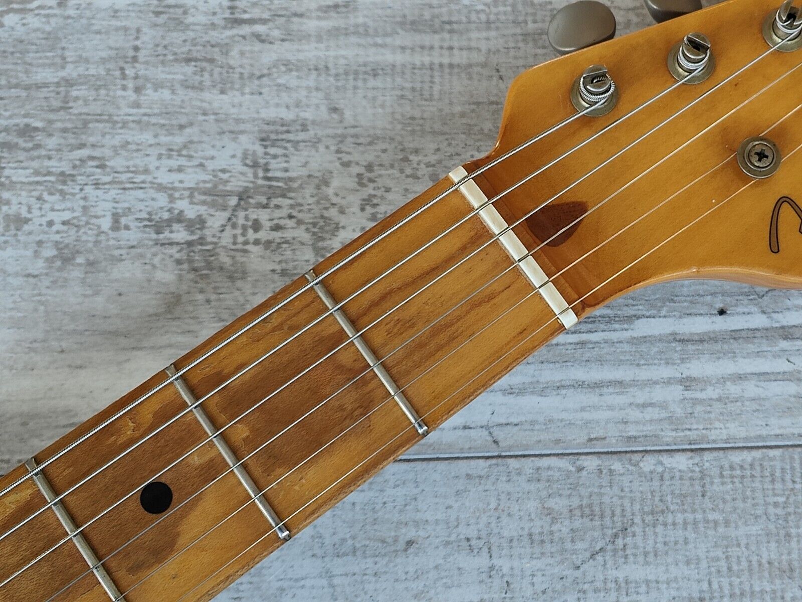 Japanese made by the Fujigen factory in 1993, the ST54-70 was a premium model from the Fender Japan catalog. Looks to be an ash (sen) body with a brown sunburst finish, one-piece maple neck with a '54 V profile and 7.25" radius, loaded with aftermarket Fender Custom Shop single coils controlled by a 5-way selector, this one weighs an uncharactaristically heavy 4.5kg's.