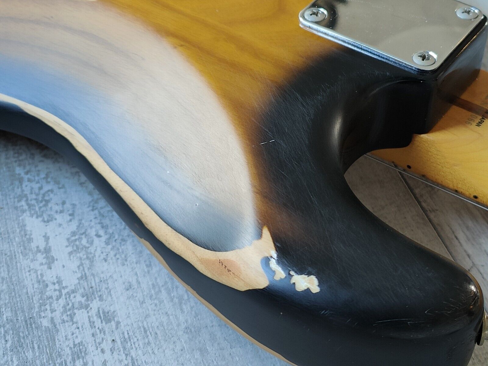 The previous owner has buffed this down with steel wool to remove the glossy finish as pictured and there's a little bit of relic work done to the body to match the seemingly naturally relic'd neck and fingerboard. Truss works well and the frets were polished prior to a restring and basic setup, the pots were flushed and lubed and the jack was cleaned so it sounds as it should.