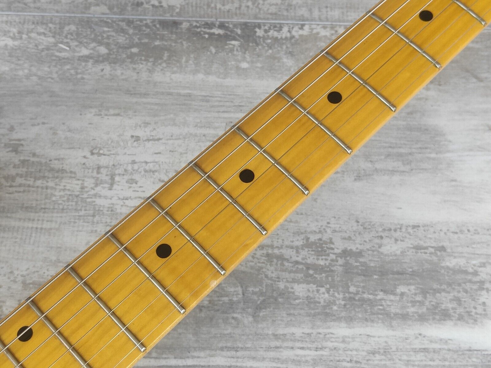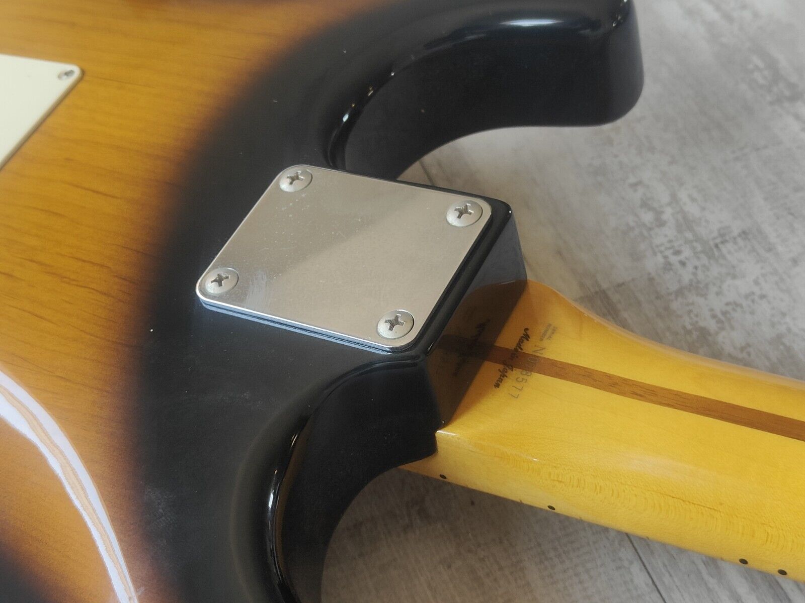 Made in Japan in 1993, the ST57-53 was Fender's base model '57 Reissue Stratocaster. Brown sunburst finish on a basswood body with a maple neck (7.25" radius, 21 frets), it weighs 3.4kg's. Loaded with the original ST-Vintage Japanese single coils, vintage style tuners and Fender stamped saddles with a diecast block tremolo.