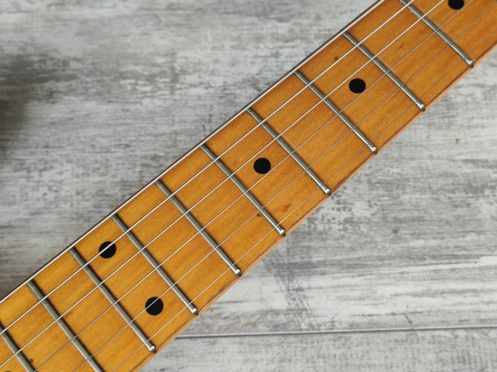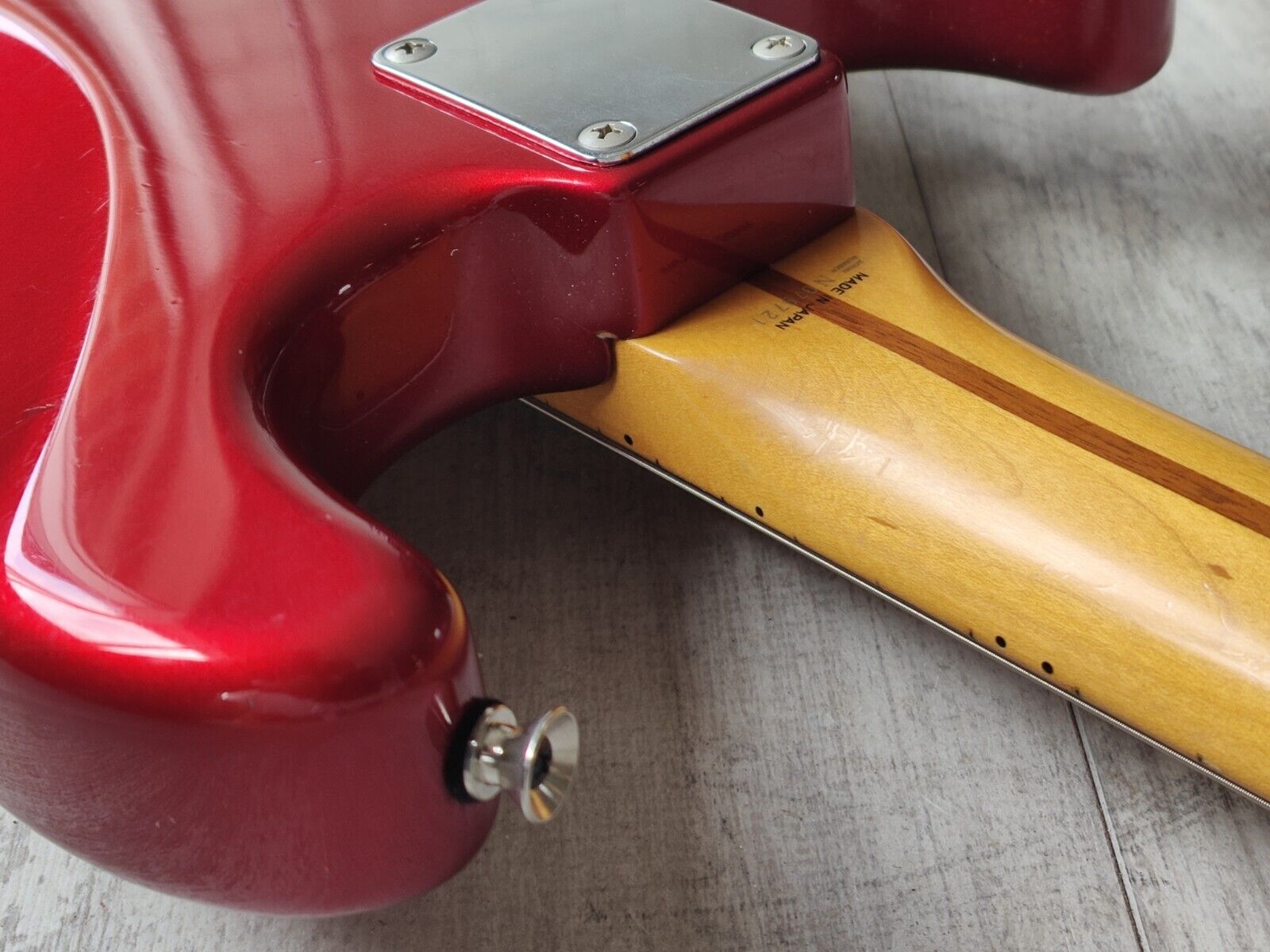 Made by the Fujigen factory in the late 1993's, the ST57-70 was a mid-range '57 reissue model from Fender Japan. Alder body with a glossy Candy Apple Red finish, maple "oval type" neck with a 7.25" radius, it's factory loaded with Fender USA ST-VINTAGE single coils and weighs 3.4kg's. Seems to be all original as pictured with the exception of maybe a replaced nut, it's wearing Fender stamped saddles and vintage-style tuners for an authentic '57 look and feel.