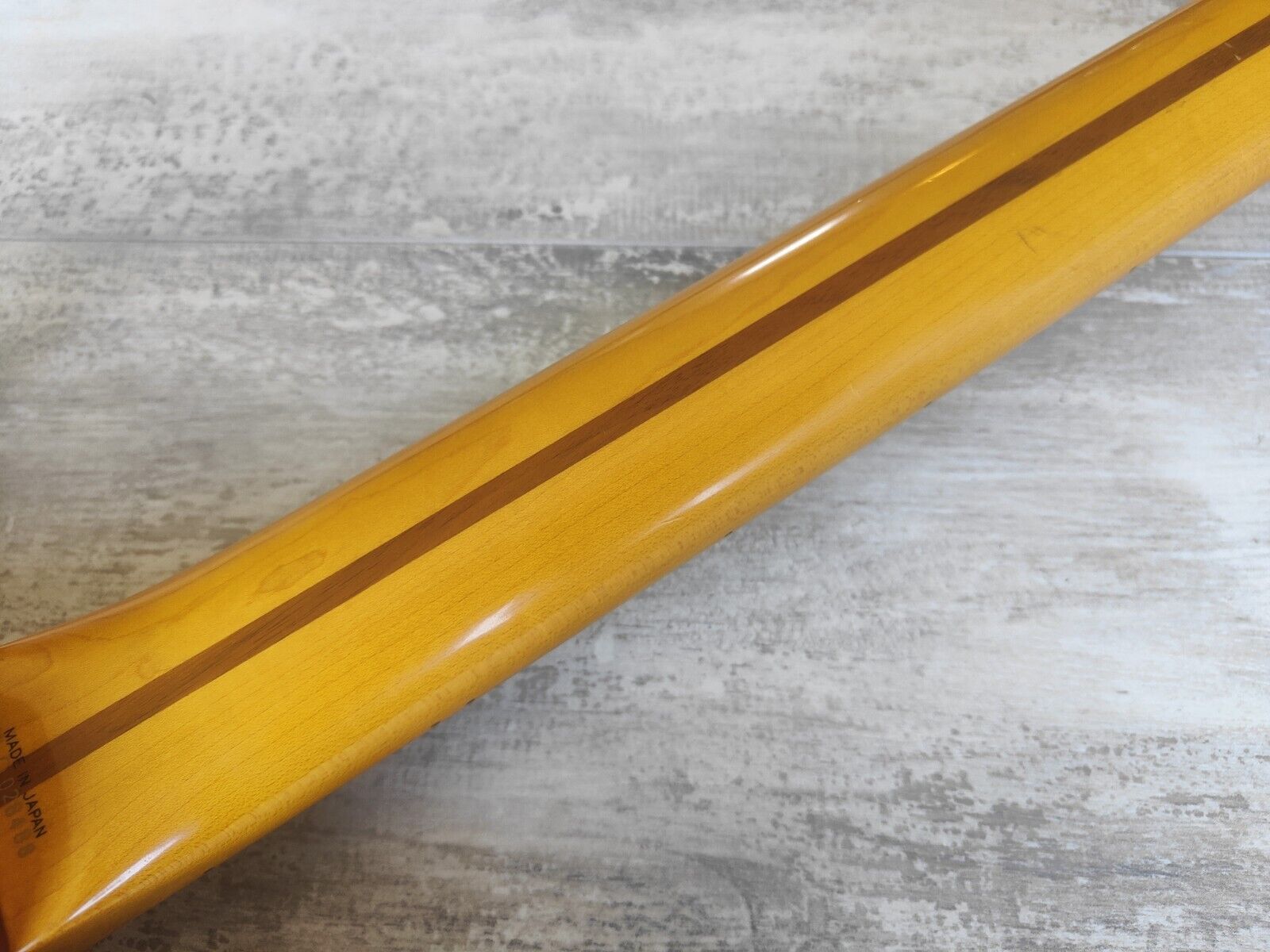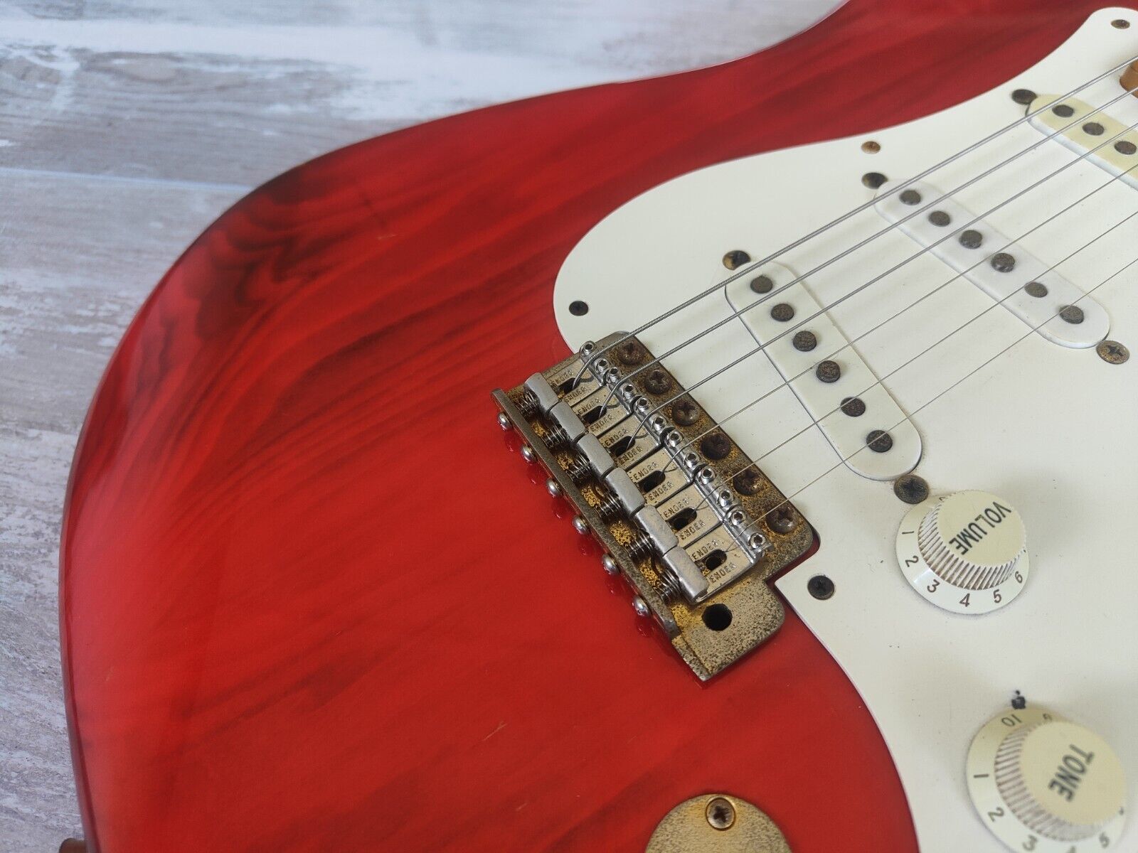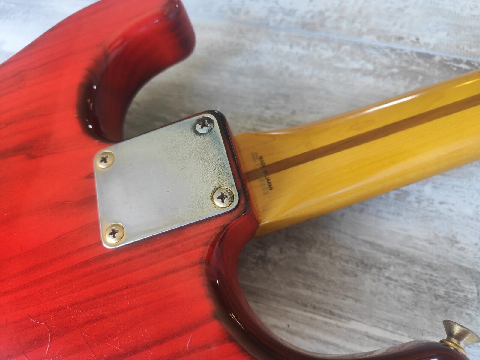 Made in Japan as part of the "Custom Edition" catalog in 1993, the ST57G-65 was a Fujigen built '57 reissue with some "custom shop" style factory upgrades. American Basswood body wearing a transparent "Charcoal Red" finish (Fender Japan's method for accentuating some of the grain), one-piece maple neck with a slim '57 profile (7.25" radius, 648mm scale length), it weighs 3.5kg's.