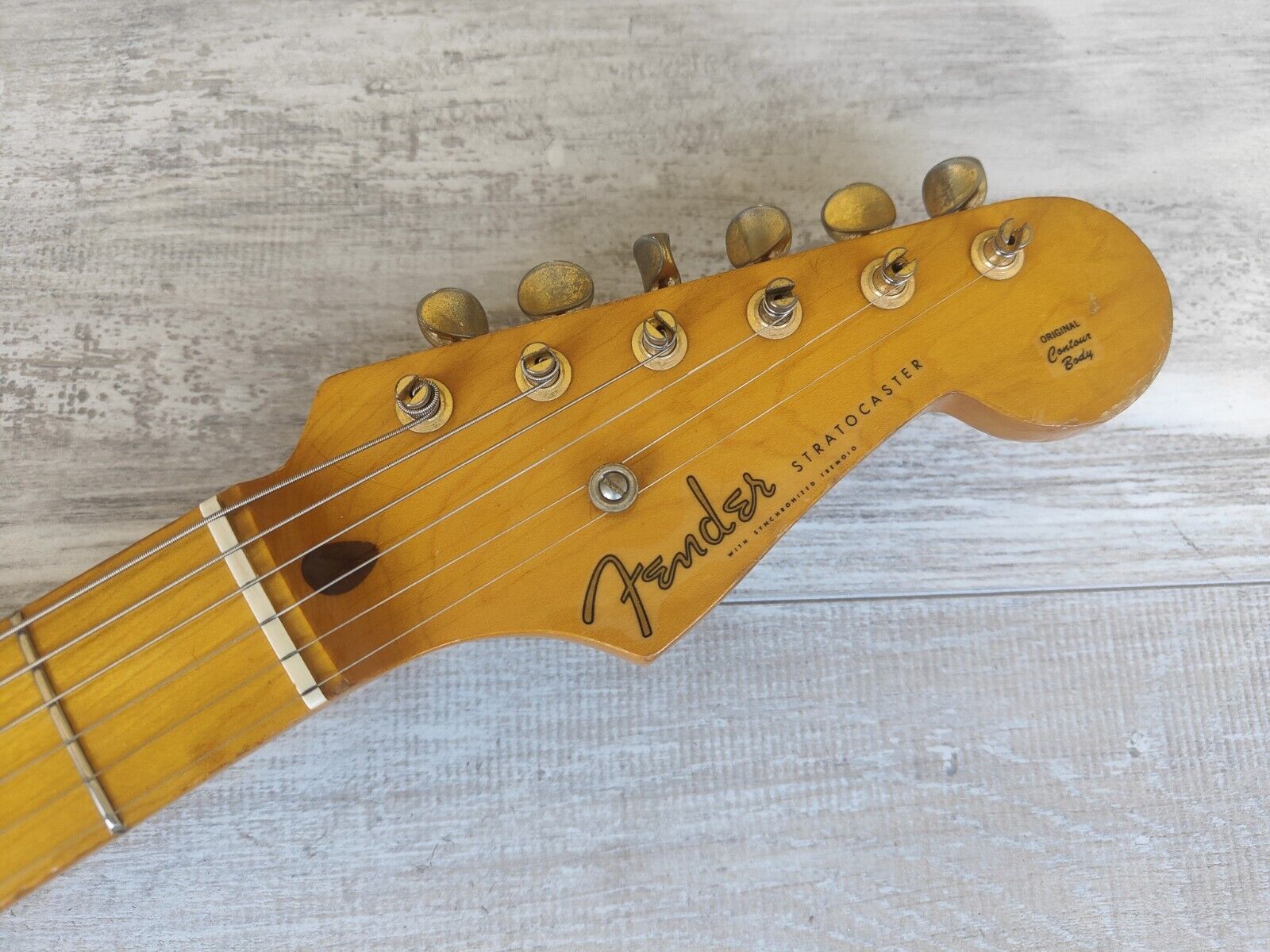 The G at the end of the model number signifies the gold hardware including a diecast block bridge, vintage style tuners and Fender stamped saddles (although these seem to have been replaced with chrome ones). Loaded with the original factory ST-VINTAGE alnico single coils with what looks to be one replacement pickup cover on the neck pickup.