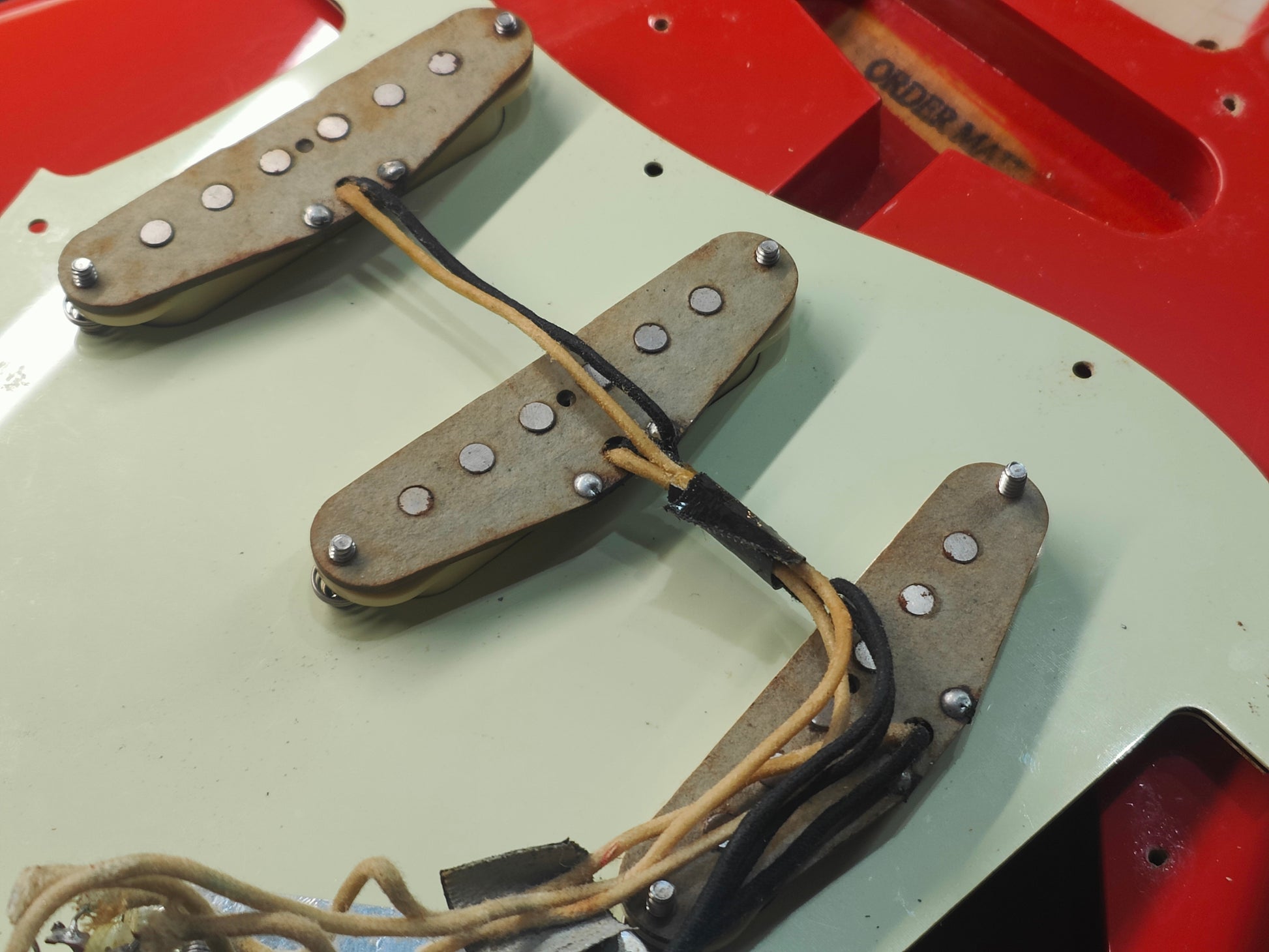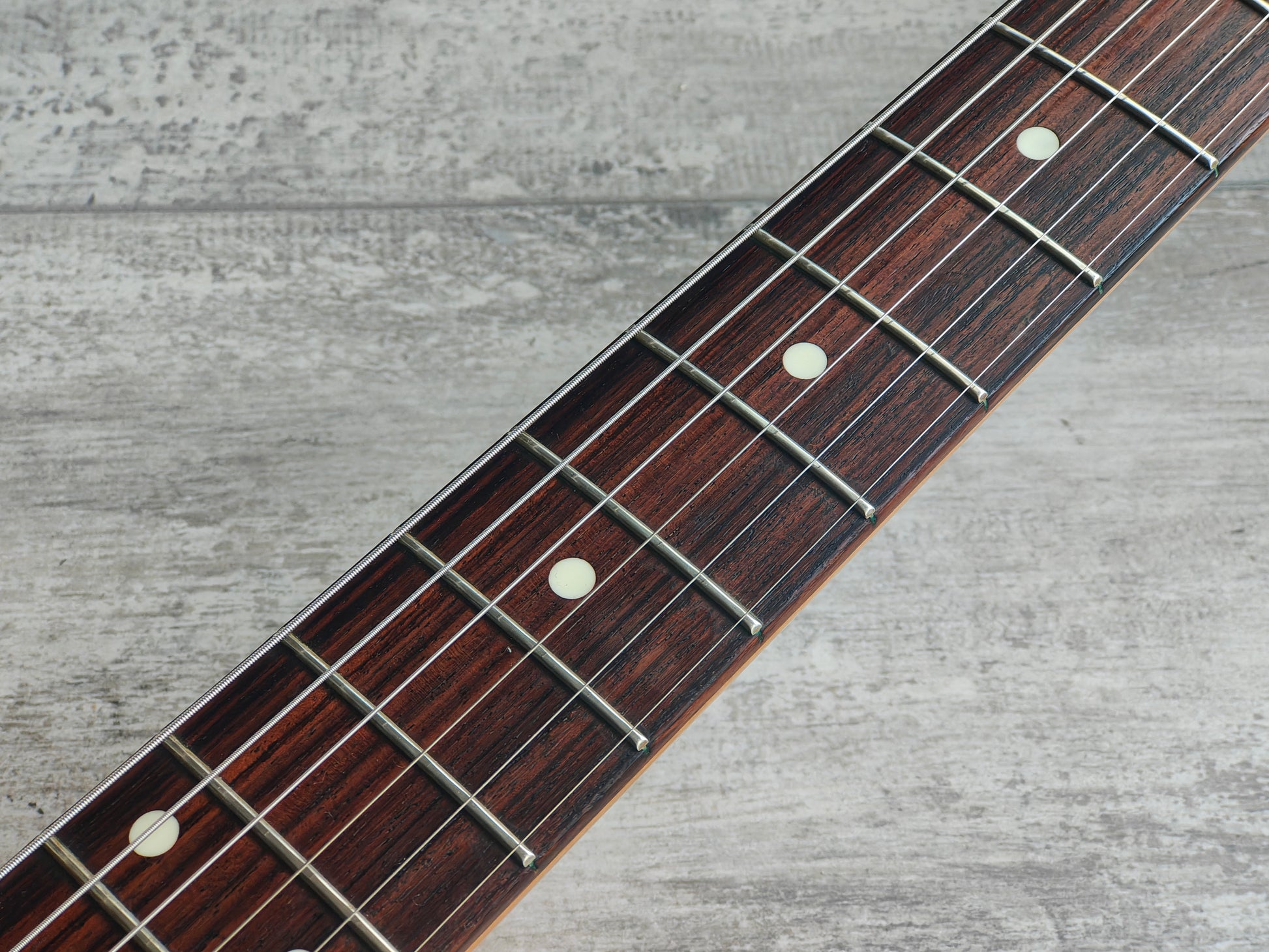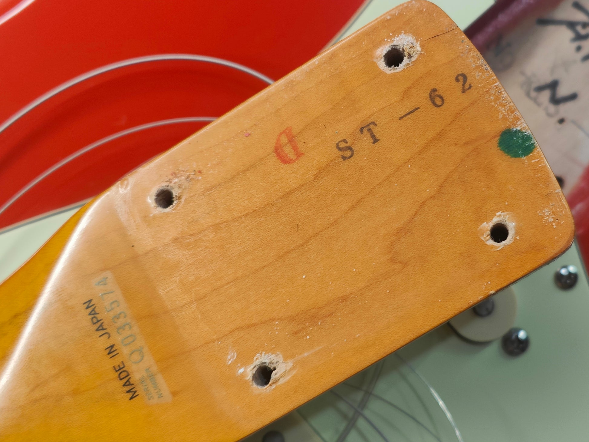 Made by the Fujigen factory in 1993, this was an Order Made model ST62 that was made specifically to a customer's specs. Solid alder body with a faded Fiesta Red finish bolted to a '62 profile maple neck and slab rosewood fingerboard (43mm nut width, 7.25" radius), it weighs 3.8kg's. Loaded with a what looks to be the original grey back Fender USA single coils (likely ordered by the customer) with CTS pots and cloth wiring along with the original Fender bridge with stamped saddles and vintage style tuners. The pickguard seems to have been swapped at some point otherwise it seems to be all original.