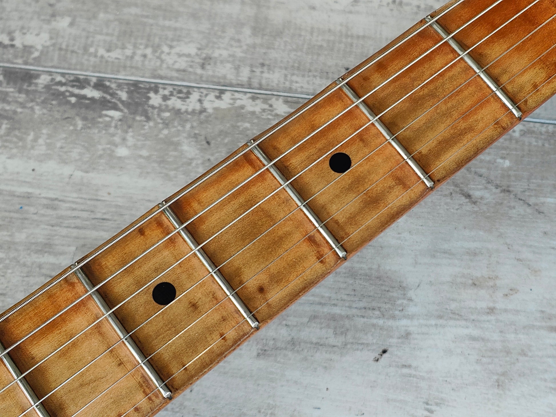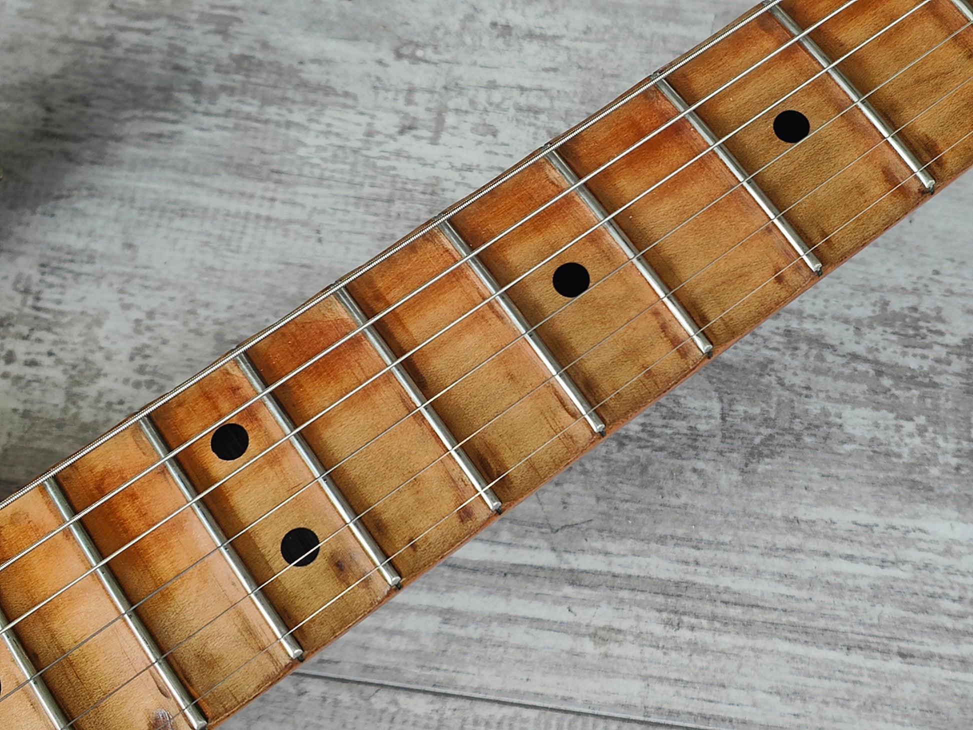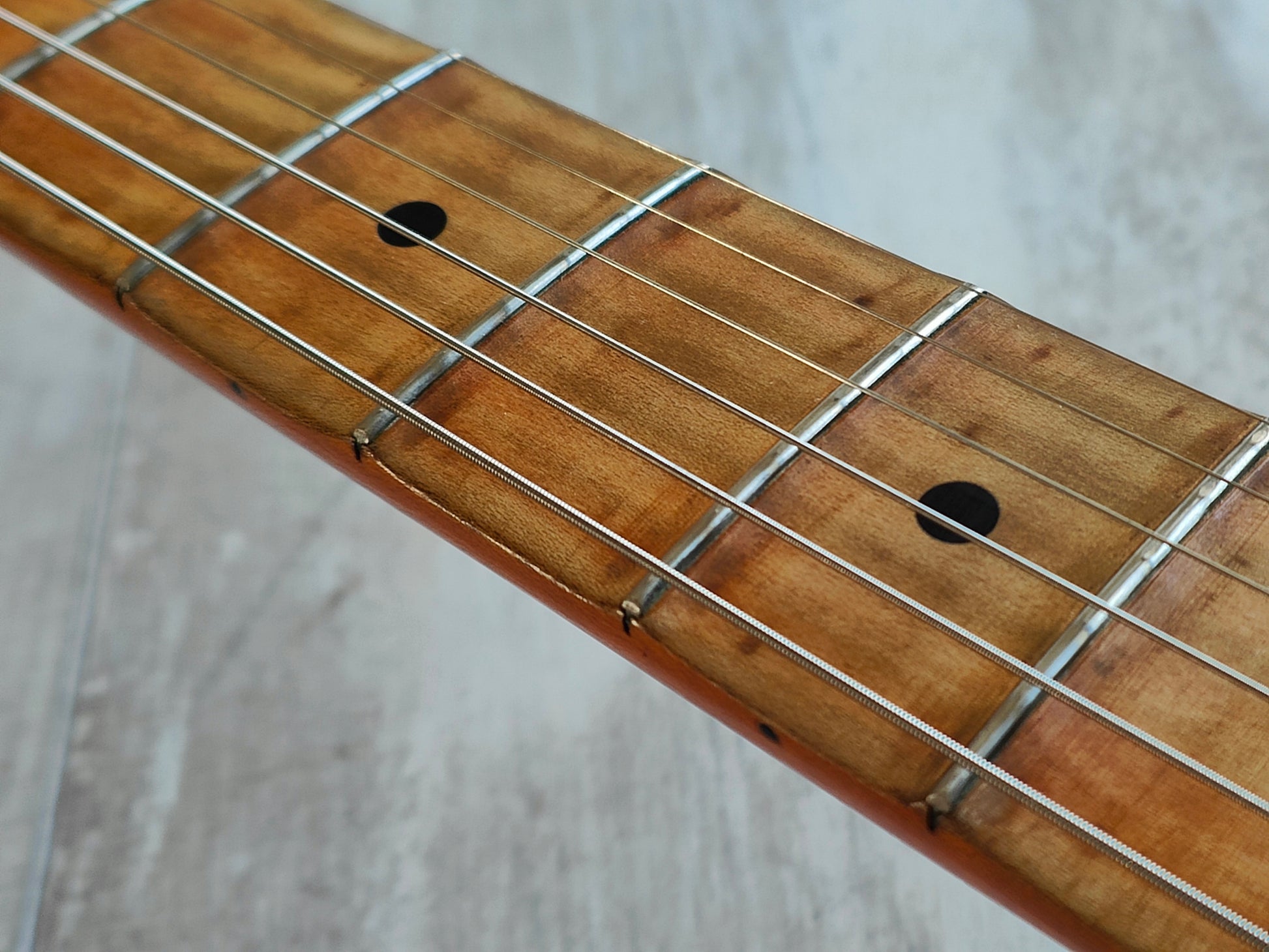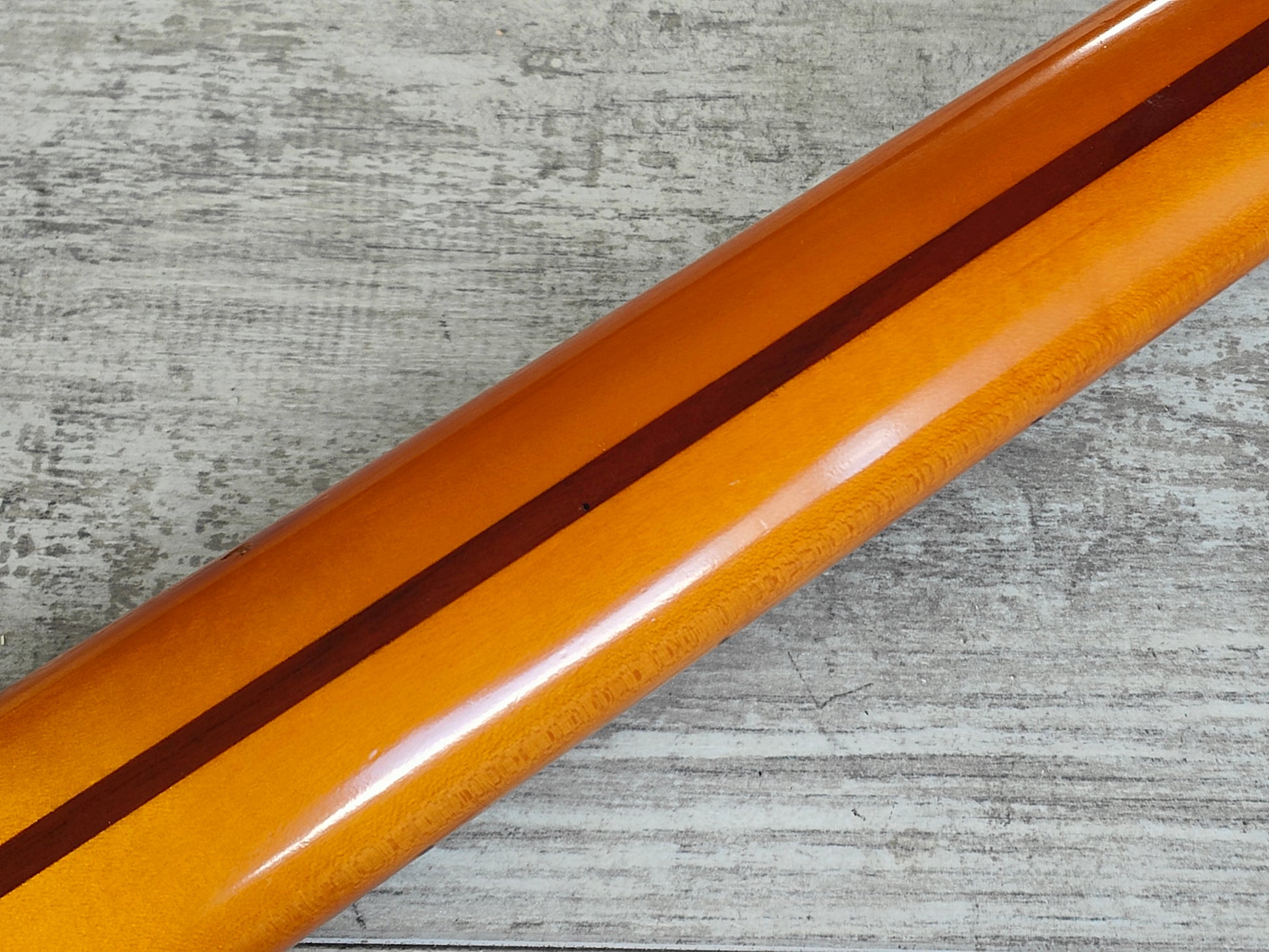 Sen ash body that was stripped and seemingly resealed in a light poly finish bolted to a 21 fret maple neck with an aftermarket scallop job to the fingerboard (7.25" radius), it weighs 3.7kg's. Loaded with a pair of Dimarzio HS-3 Pickups in the neck and bridge positions with a Fender Japan alnico single coil in the middle controlled by a three-way selector and standard volume/tone knobs.