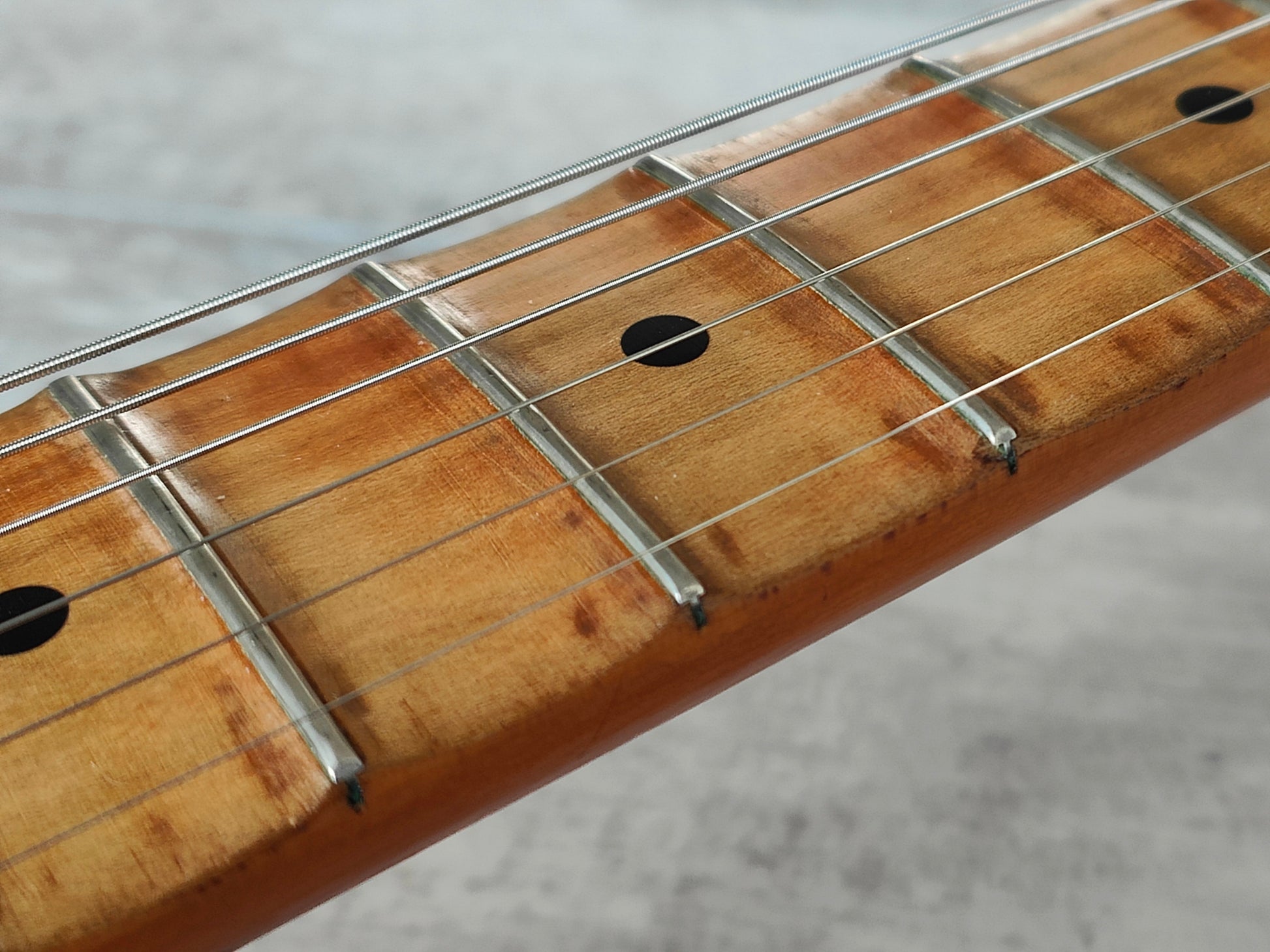 Other than the finish being stripped and the scallop work it's a clean guitar for being over 30 years old with only basic signs of wear and tear from use over the years. The frets are shiny, smooth and ready to shred and the neck is straight with a fully functional truss.