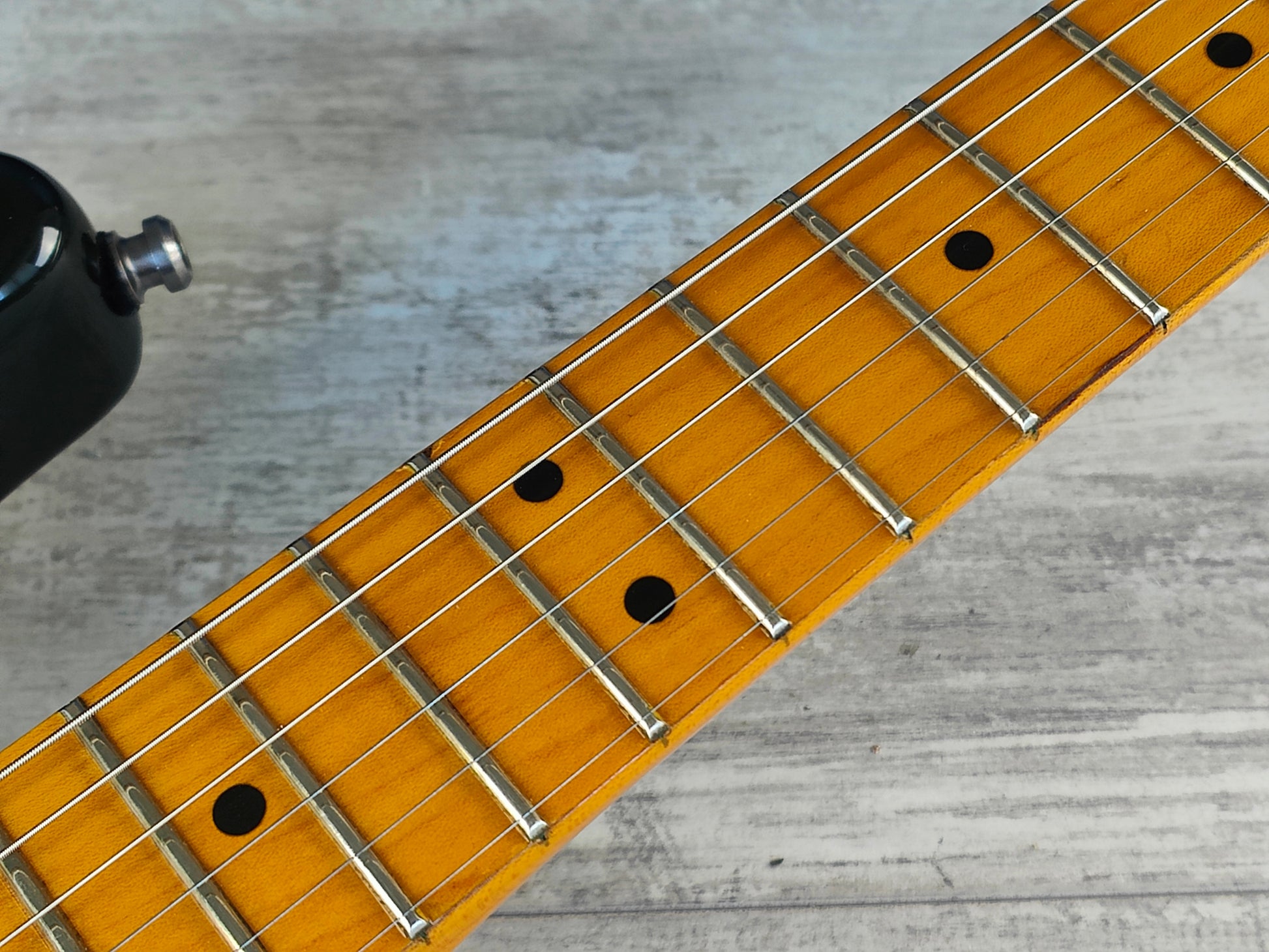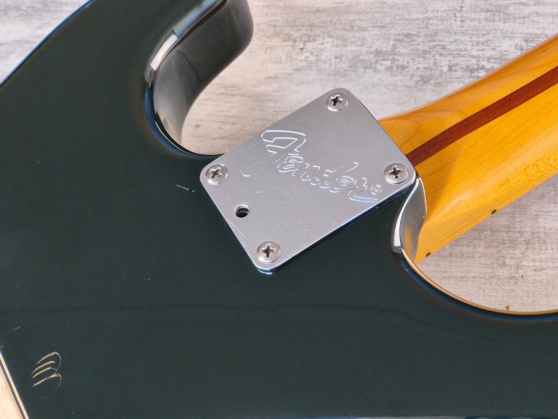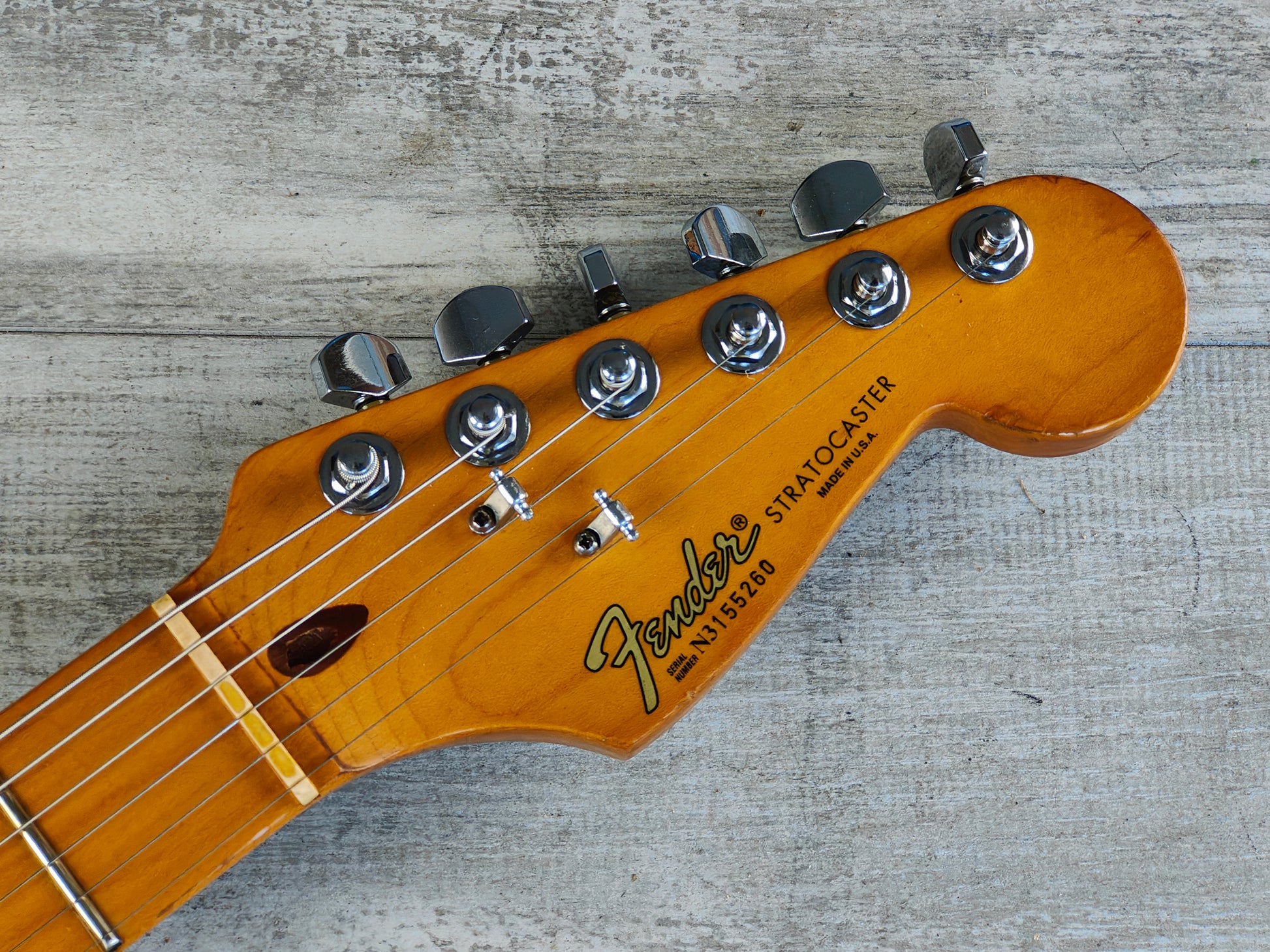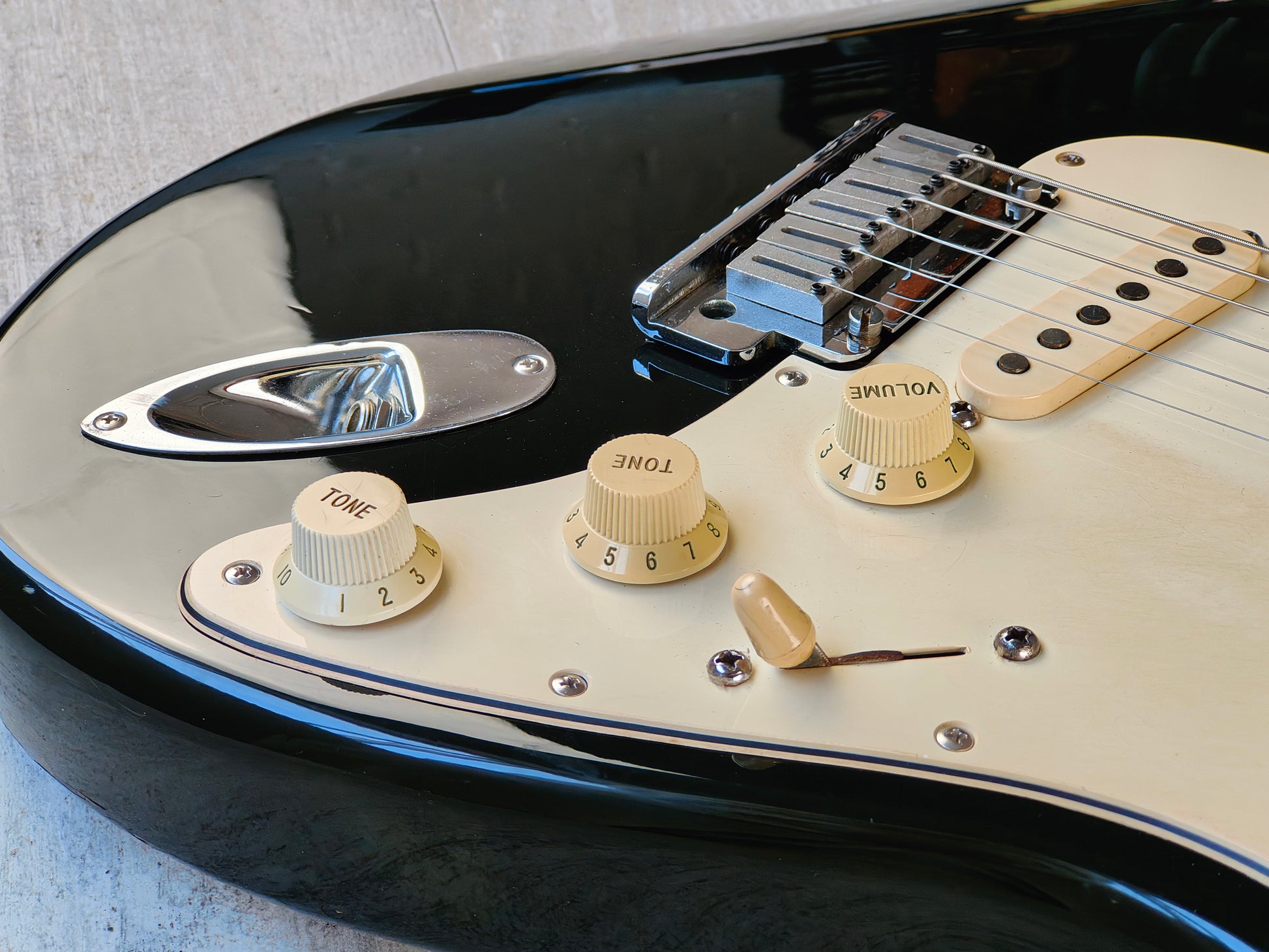 A classic Fender American Standard Stratocaster built in the USA in 1993. Two piece alder body with a glossy black urethane finish bolted to a maple neck with a modern C profile (9.5" radius, 648mm scale length), it weighs 3.6kg's. Looks to be all original as pictured.